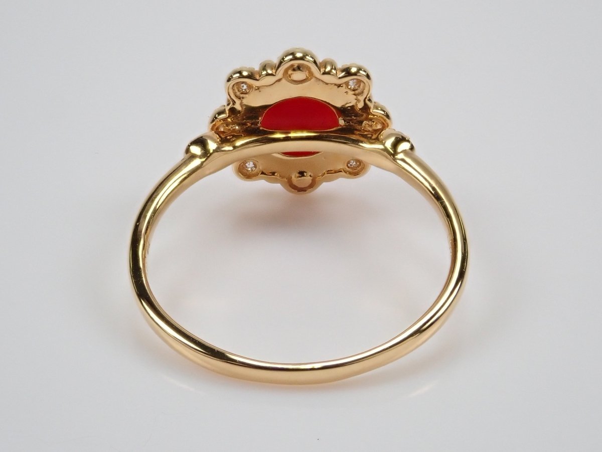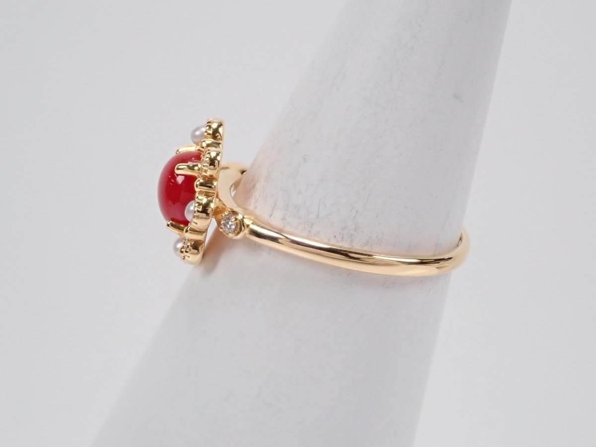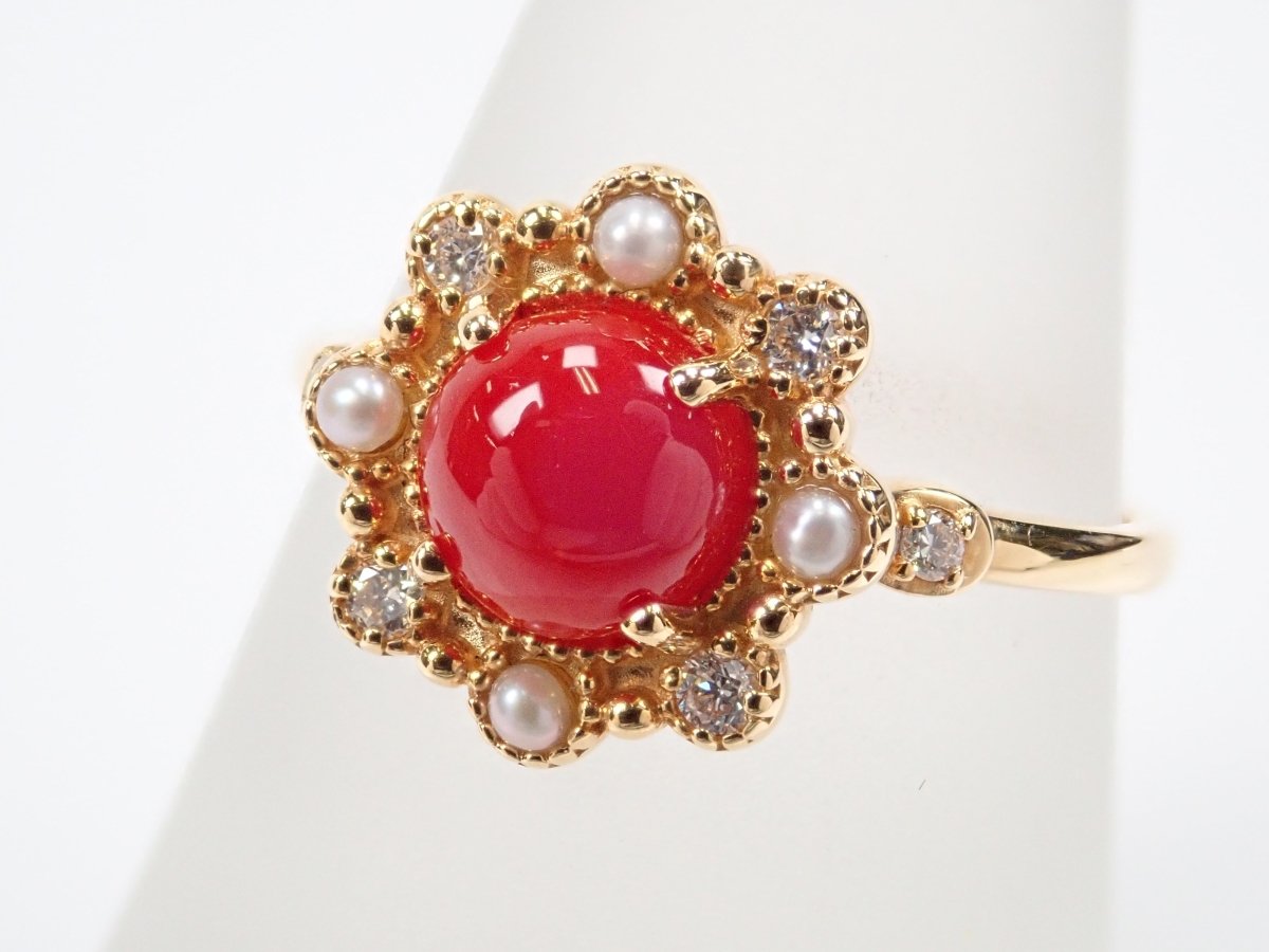 來自高知縣的血紅珊瑚以其鮮紅色吸引著我們的注意。鑽石和Akoya珍珠圍繞著珠寶,顯得非常華麗。珠寶周圍的鋸狀滾邊營造出溫暖的氛圍。光是穿上就覺得很安心♪