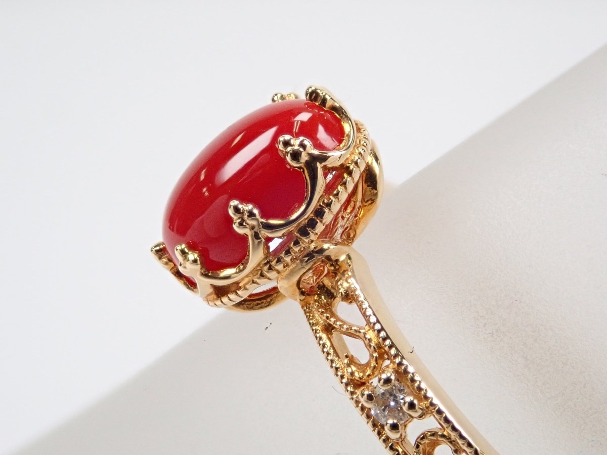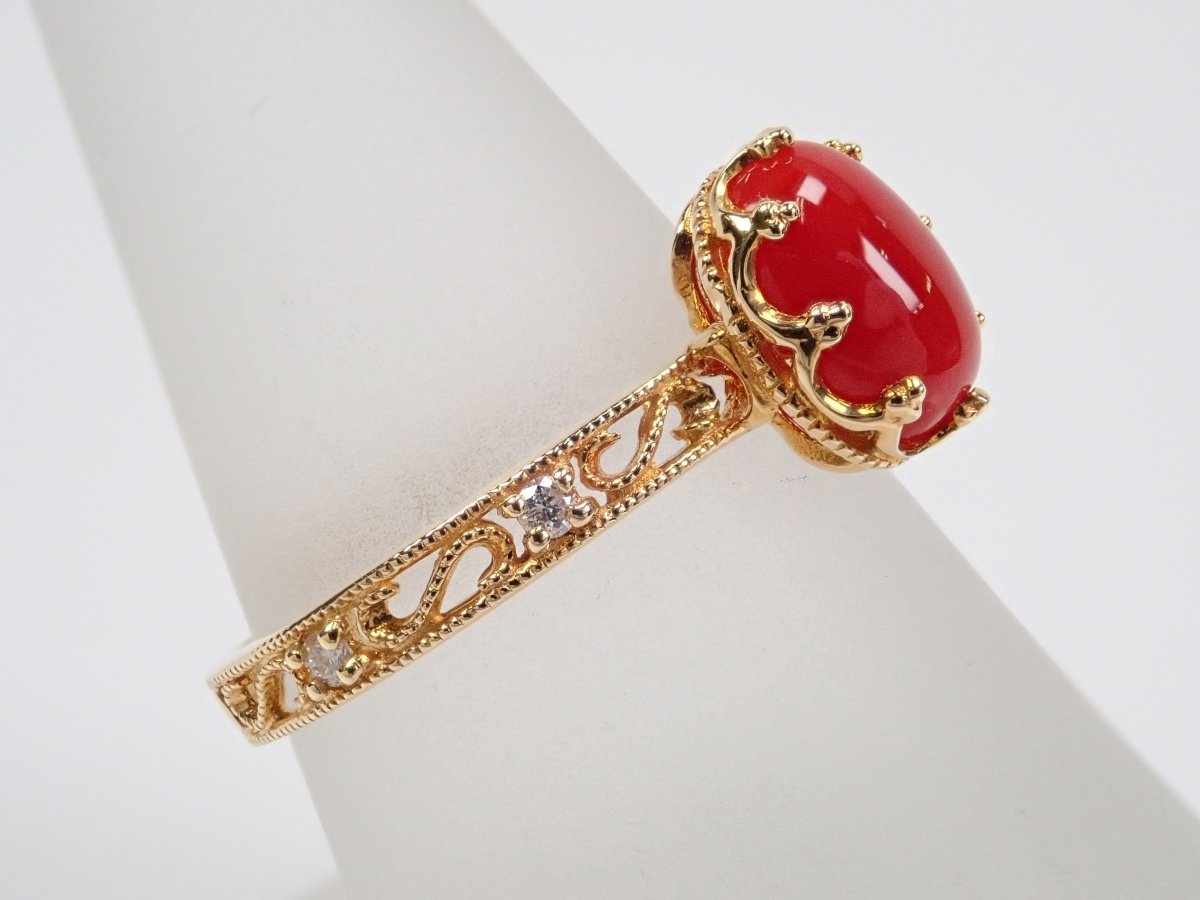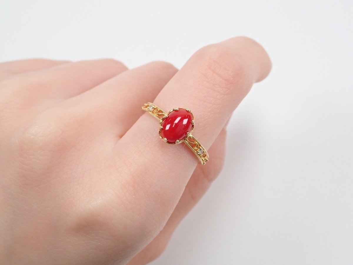 來自高知縣的血紅珊瑚擁有美麗光澤的紅色,讓您愛上它。鏤空的阿拉伯式花紋手臂營造出異國風情。石座和石爪也做工精巧,使珠寶不僅美觀,而且做工精細。