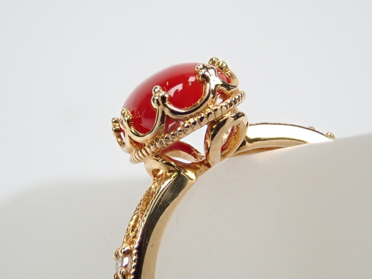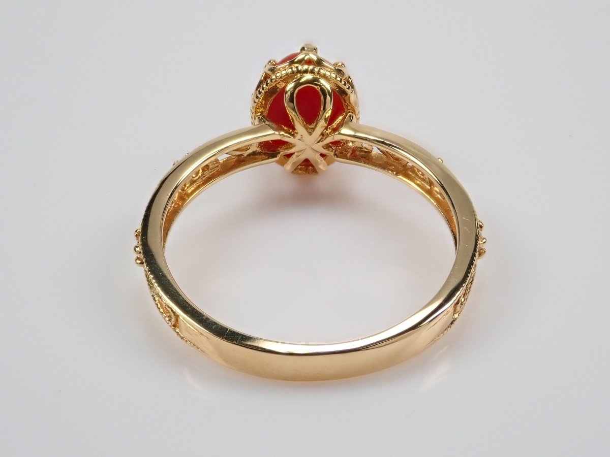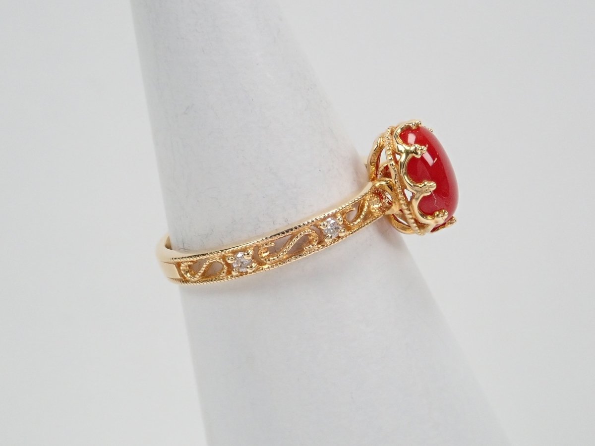 來自高知縣的血紅珊瑚擁有美麗光澤的紅色,讓您愛上它。鏤空的阿拉伯式花紋手臂營造出異國風情。石座和石爪也做工精巧,使珠寶不僅美觀,而且做工精細。