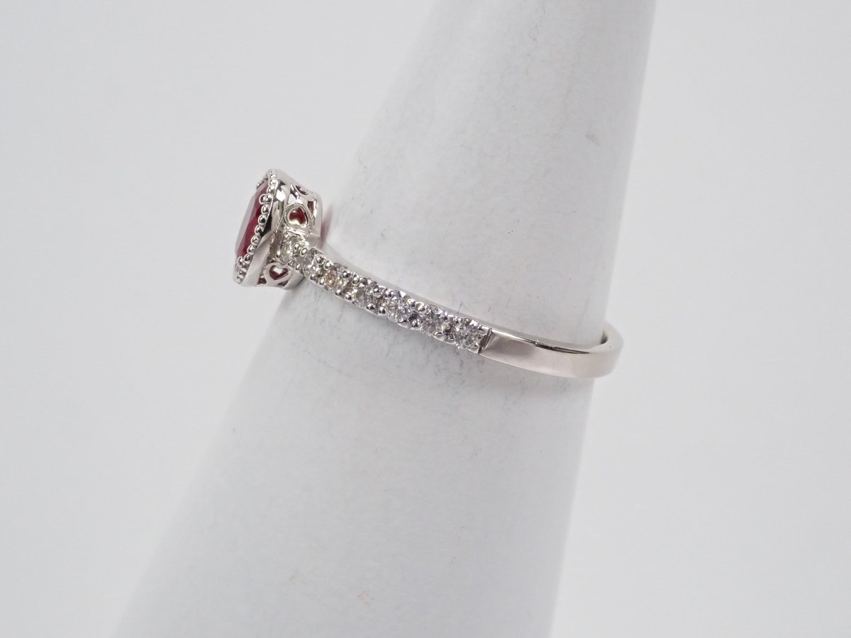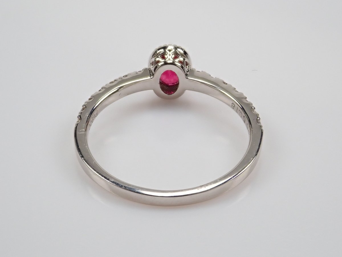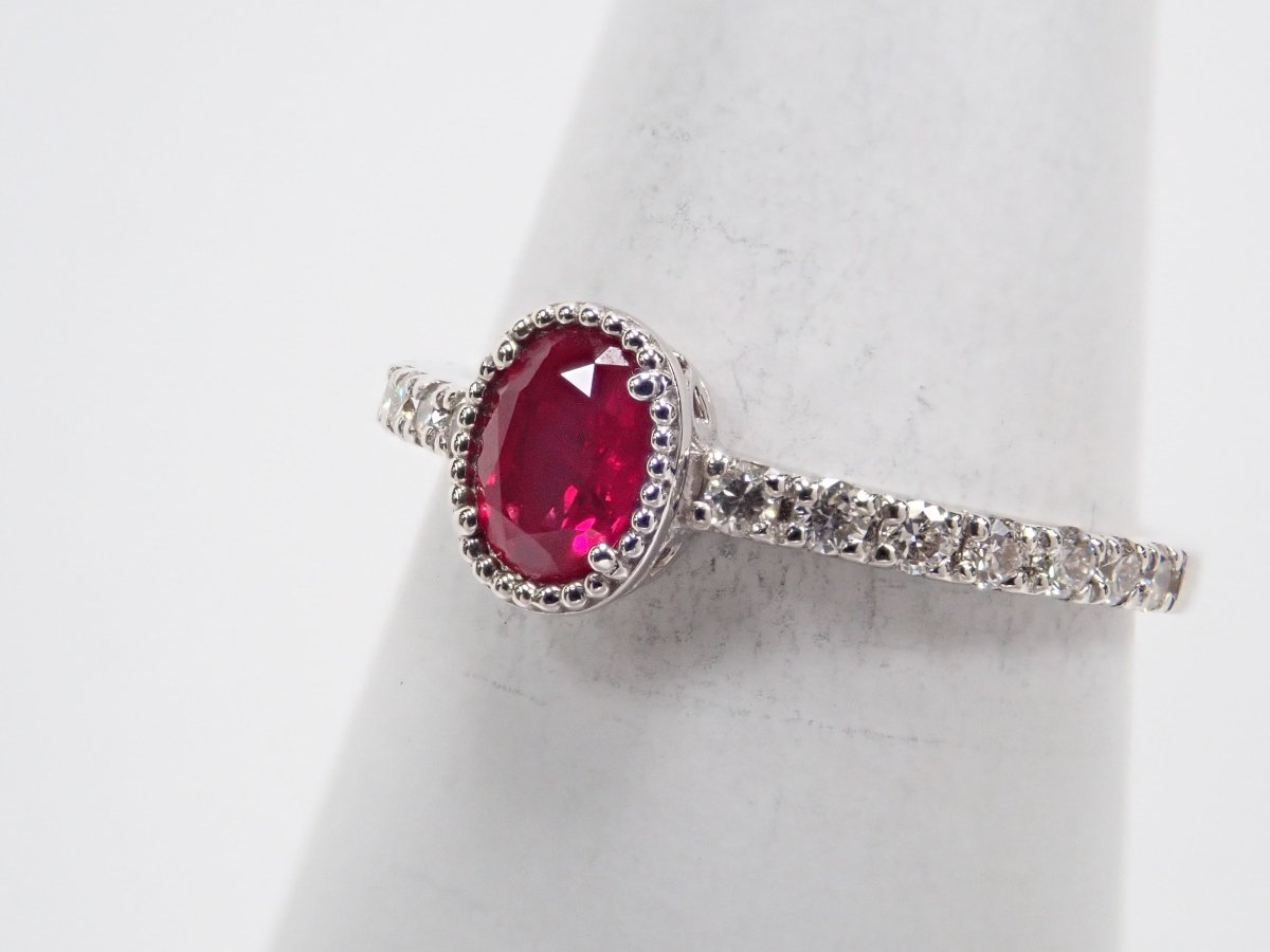 這枚戒指是用鴿血色的紅寶石製成的,據說是所有紅寶石中最好的。 0.3克拉以上的橢圓形紅寶石給人一種正統的美感。鑽石精心鑲嵌於手臂上,為指尖增添璀璨光芒。從側面看的框架設計也很精緻,因此您可以從任何角度欣賞它。包括 AIGS 身分證明書。