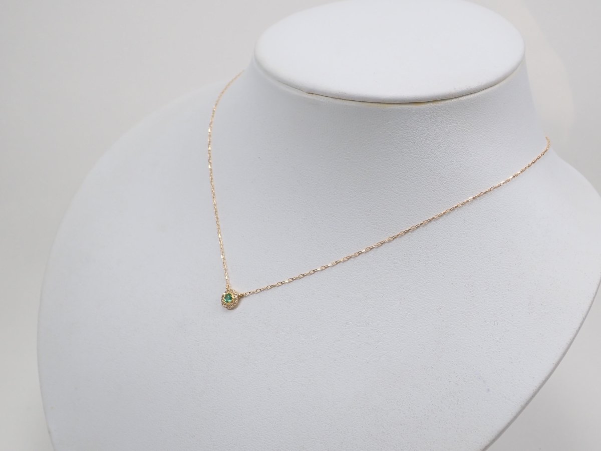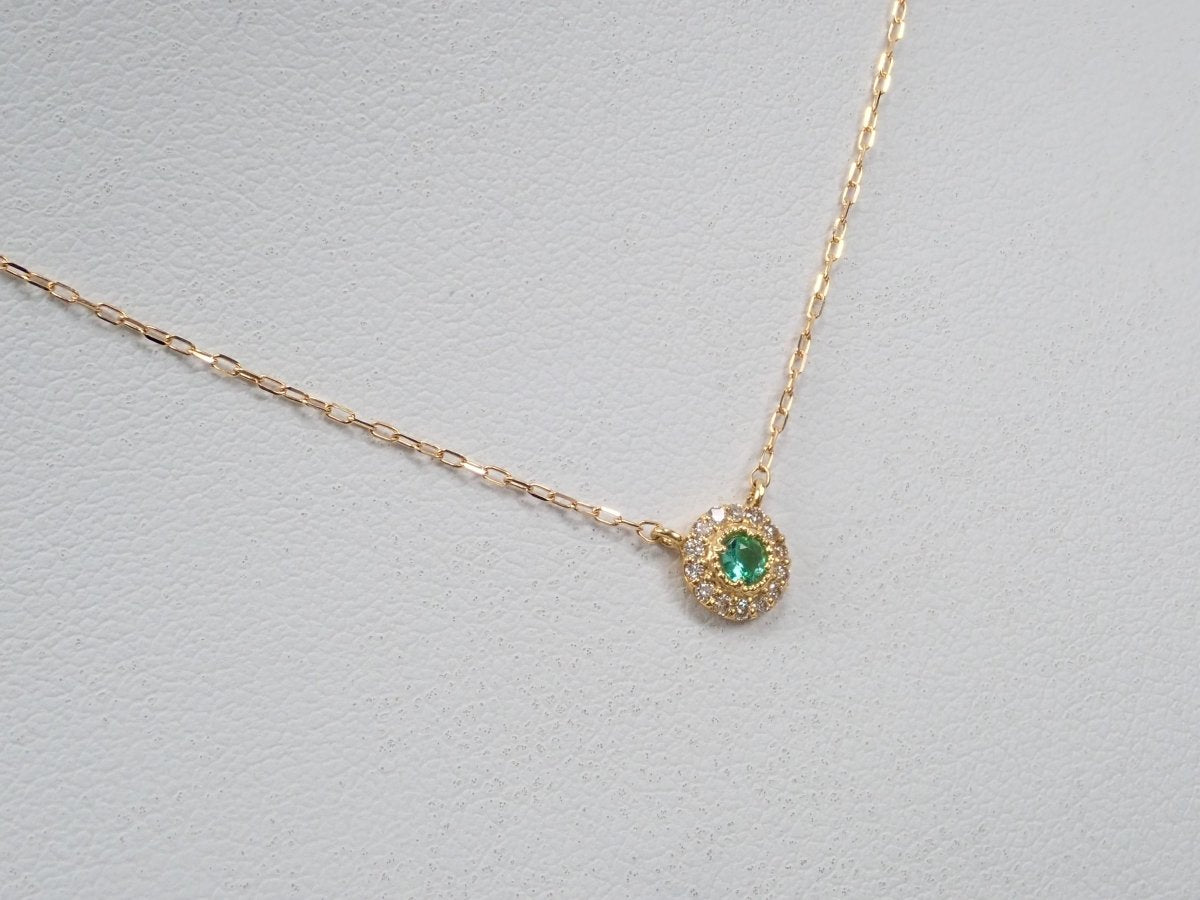美麗的祖母綠,具有清新、透明的綠色。寶石周圍的鑽石閃爍著白色光芒,增添了一絲魅力。圓形的造型營造出女性化的可愛氛圍。若戴在胸前,就能打造出優雅的造型♪