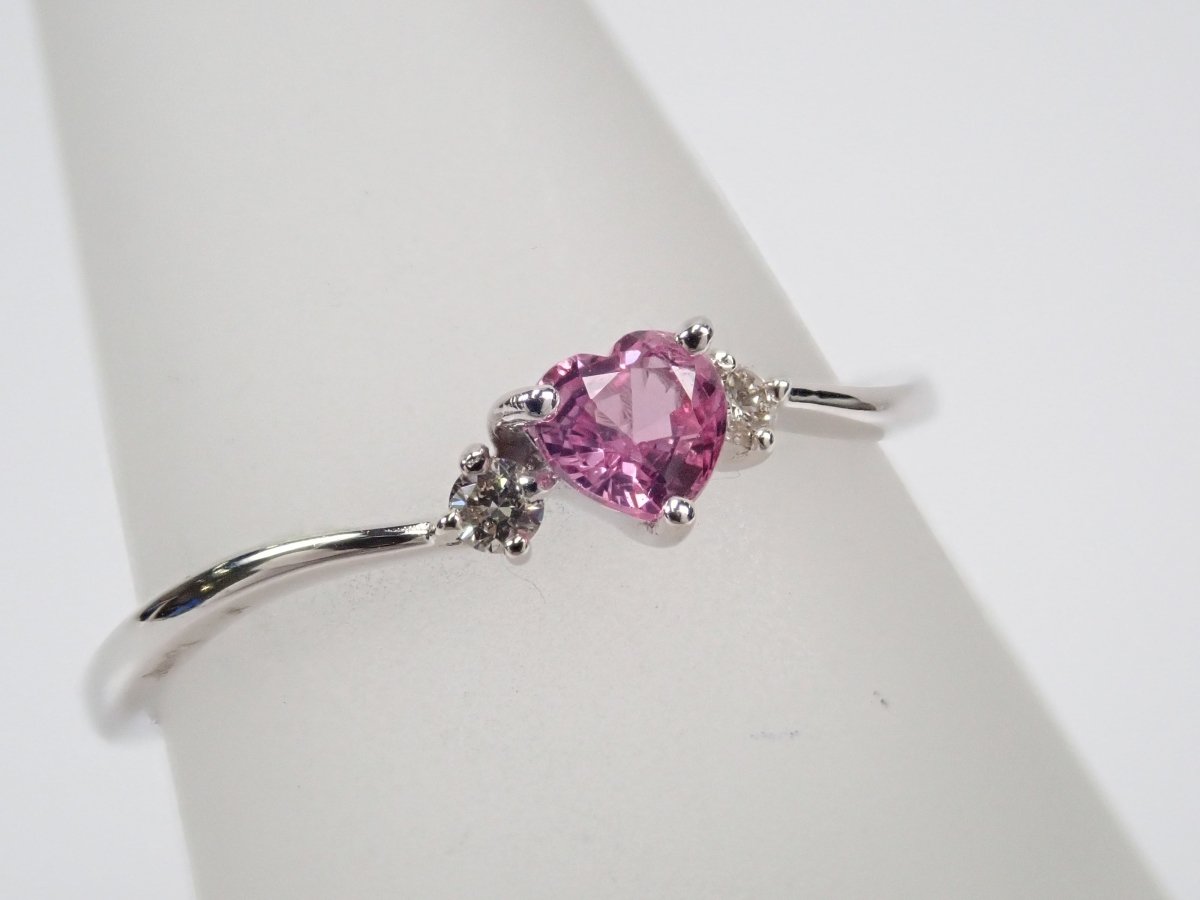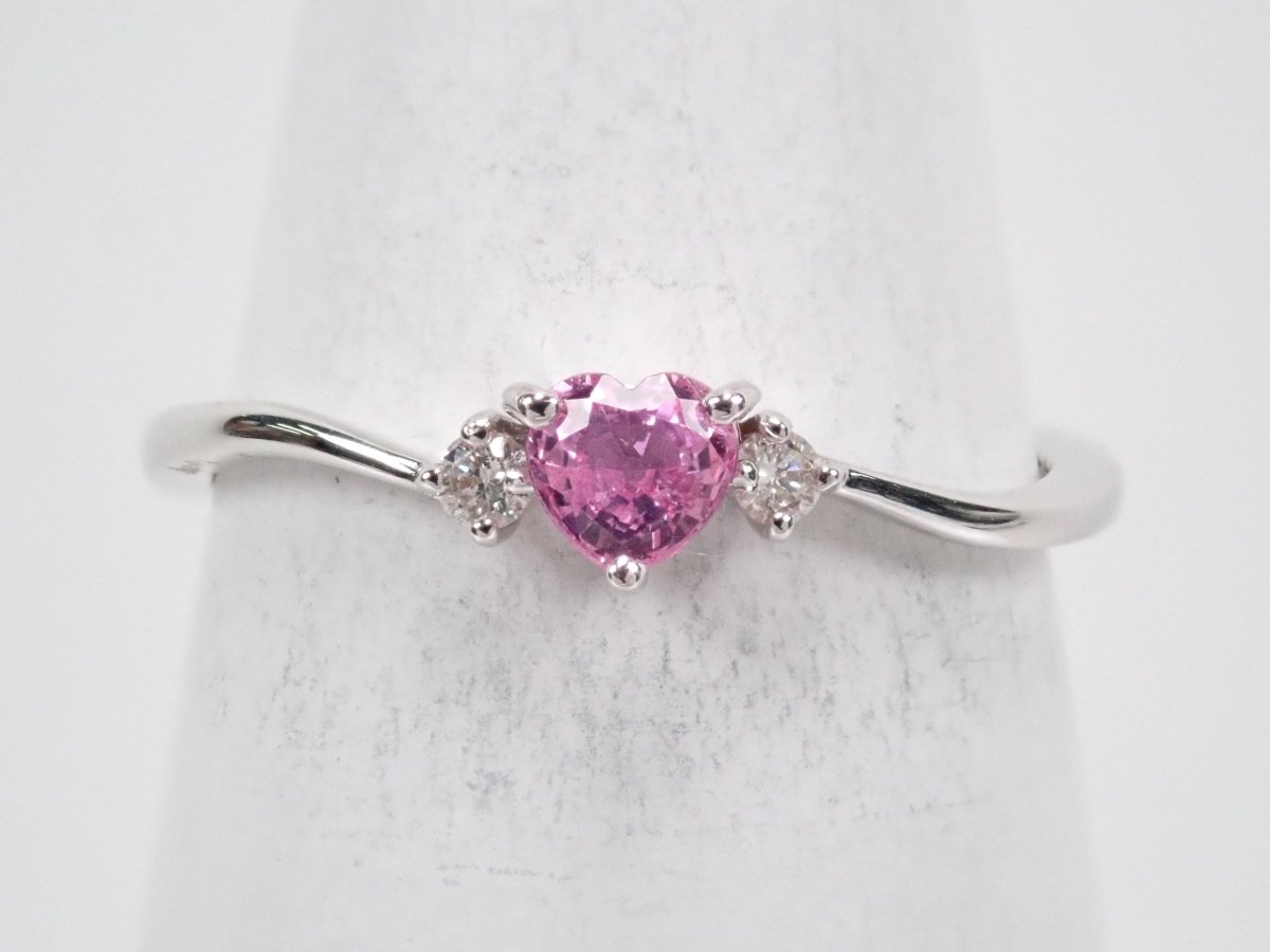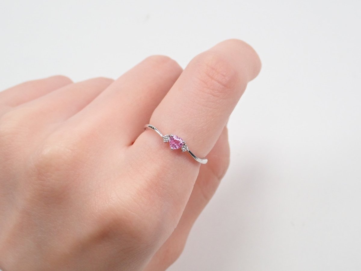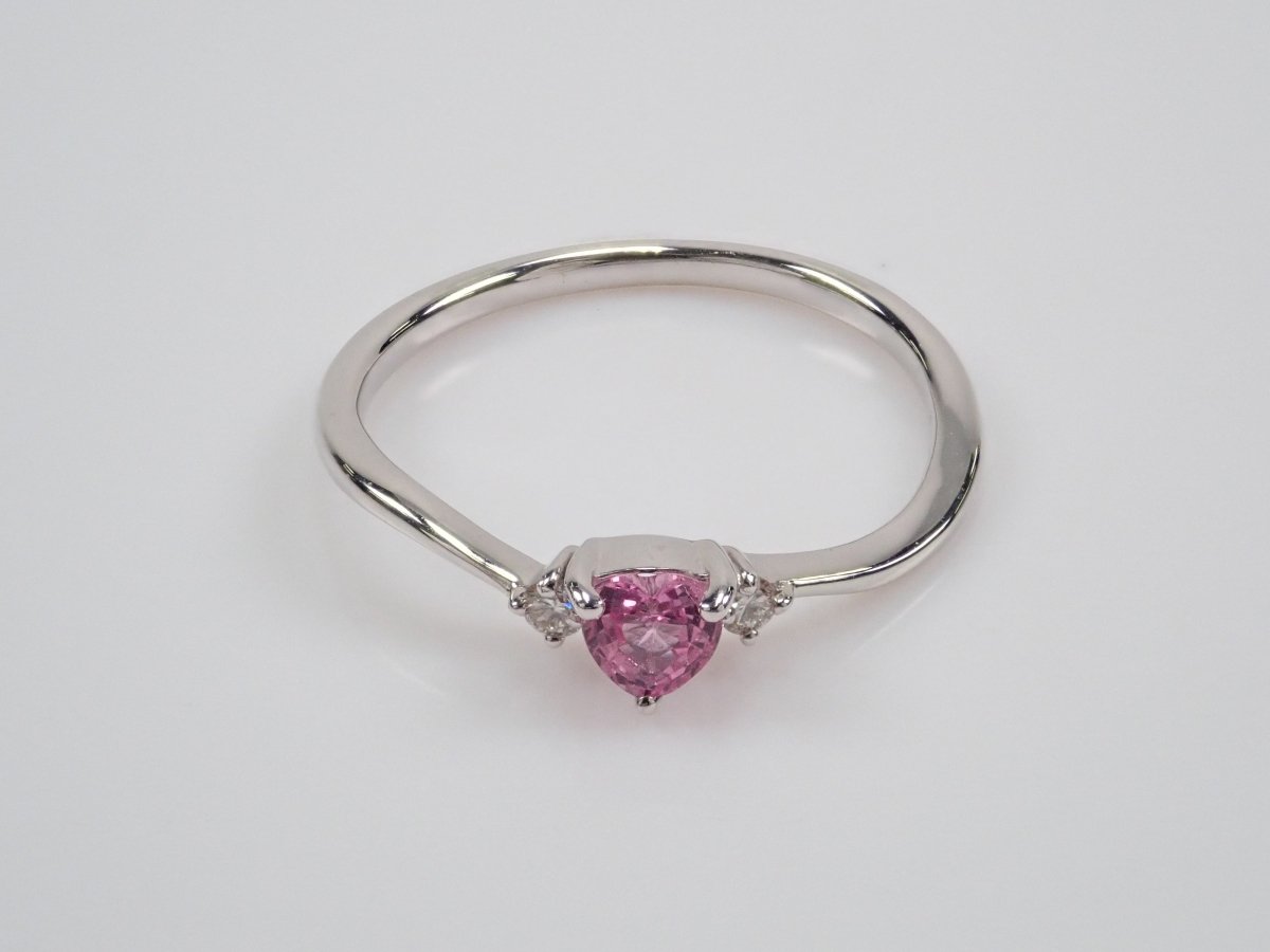 粉紅藍寶石的顏色略帶紫粉色,給人一種成熟可愛的感覺。心形的剪裁會讓你的心顫動。鑽石被包裹在珠寶中。流暢的弧形手臂營造出柔和的氛圍。