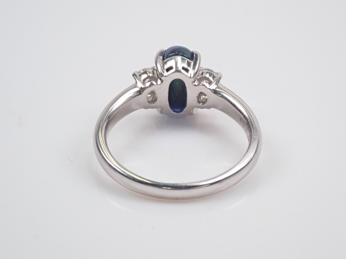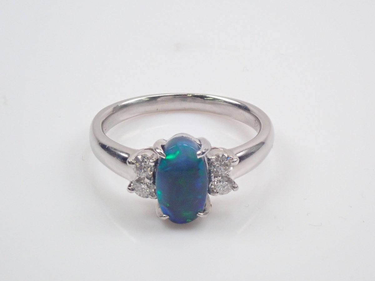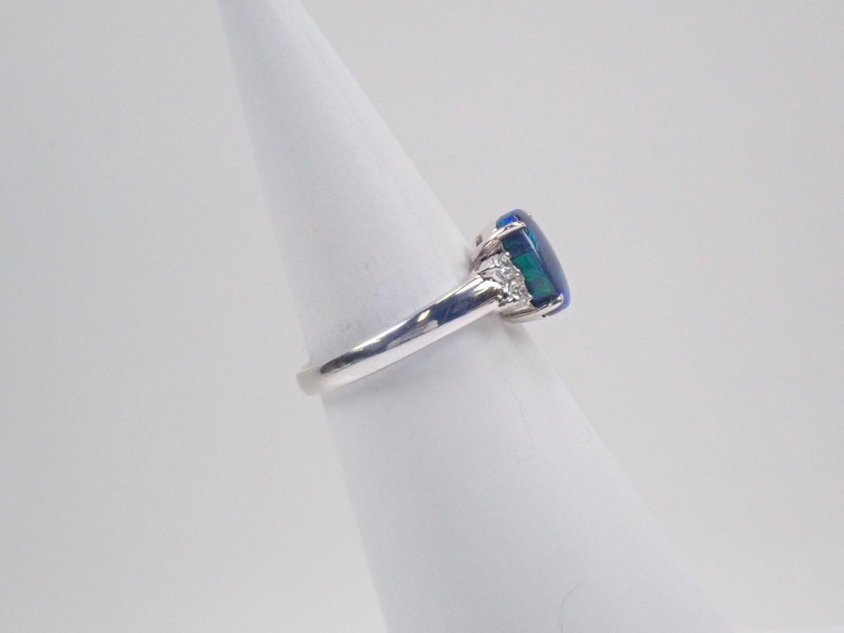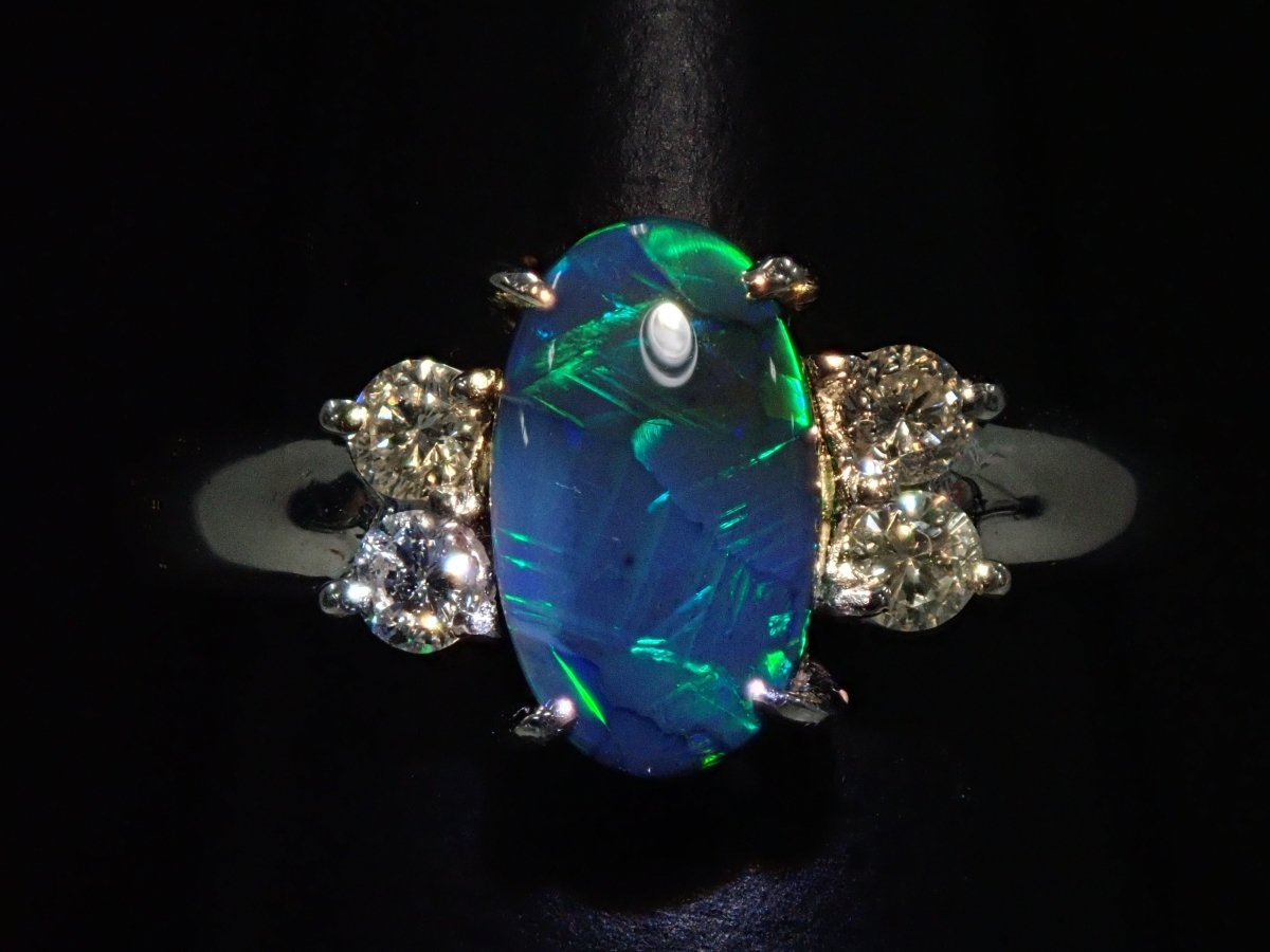 由形狀巧妙的黑蛋白石製成的戒指。根據角度和光線的不同,平靜的藍色主色上會呈現出充滿活力的綠色。副石上的鑽石也品質優良,光芒四射,凸顯黑歐泊的美麗。重量約5.9克。該鑽石為相當於VS~SI級的無色鑽石。 [ 多彩] 點擊此處查看產品清單。