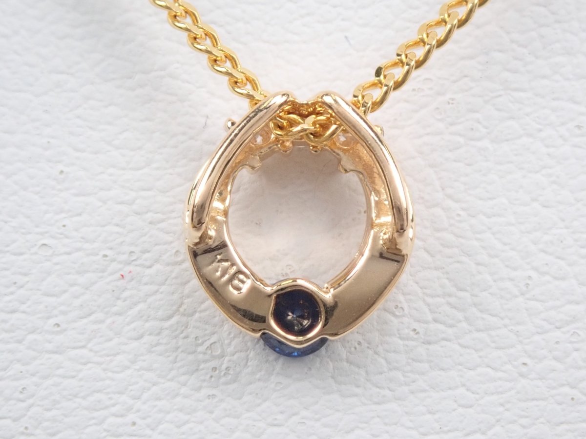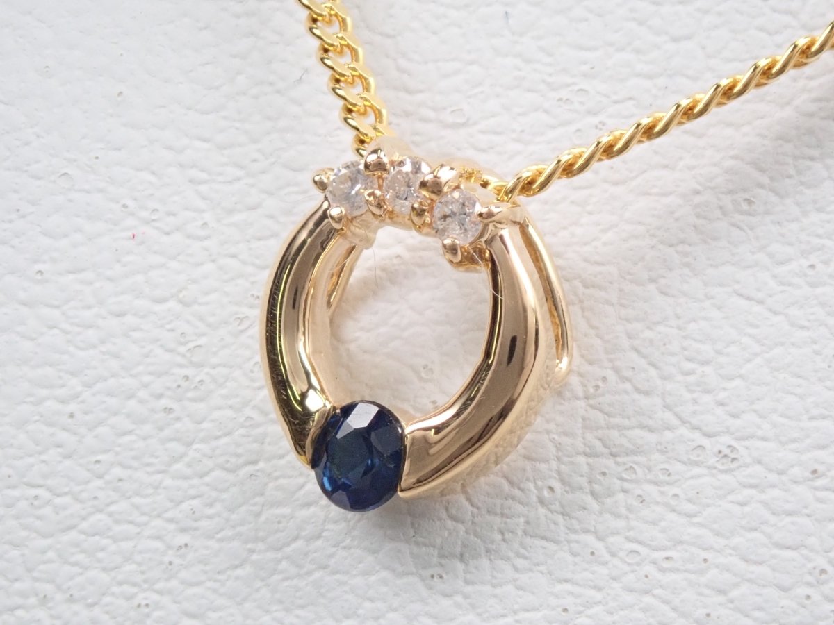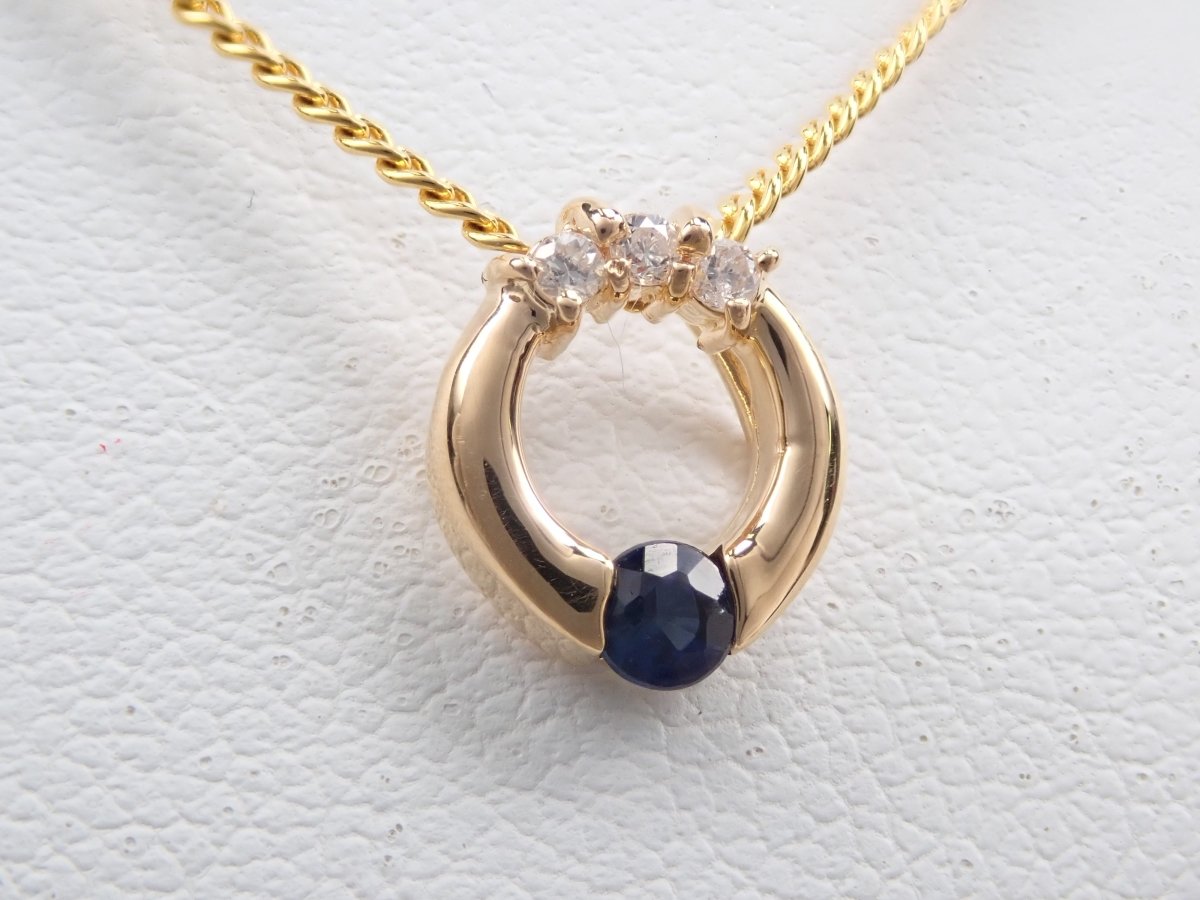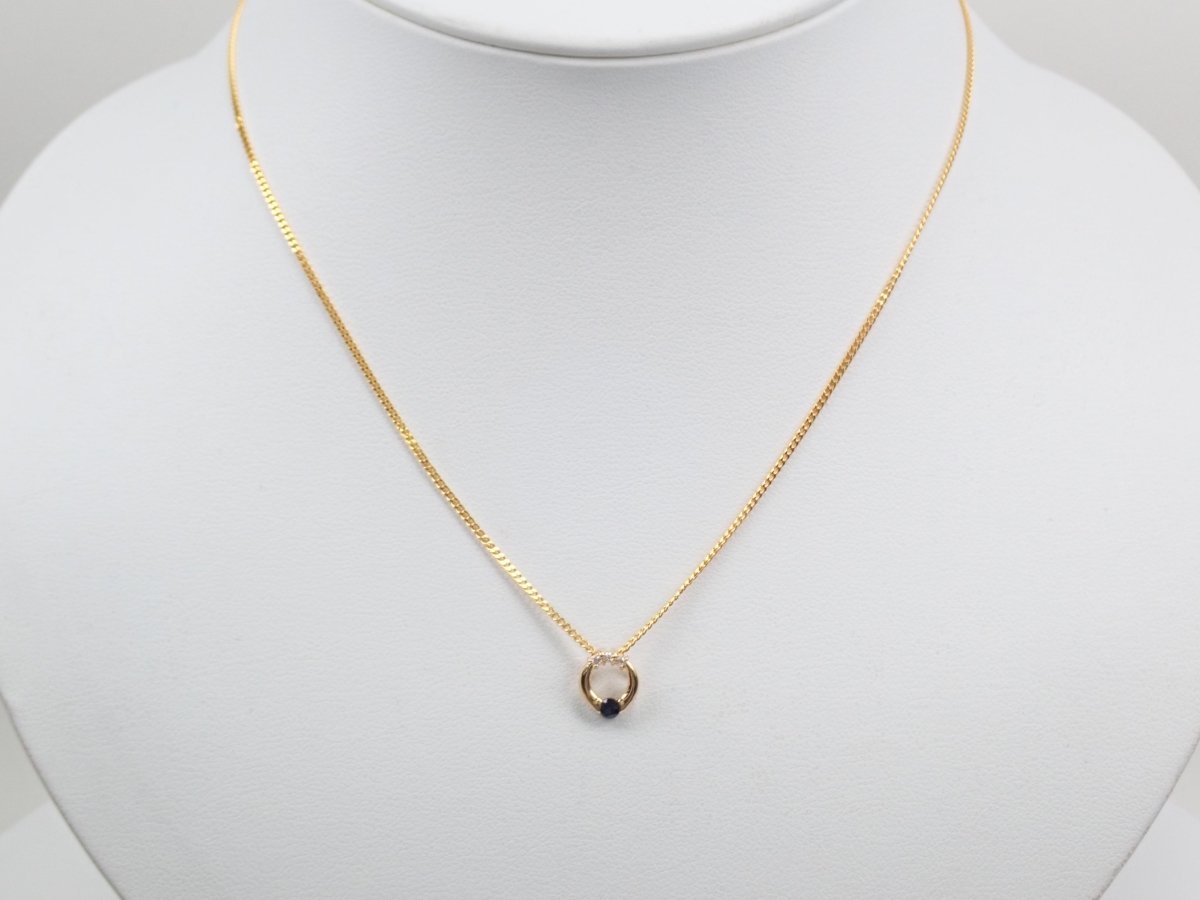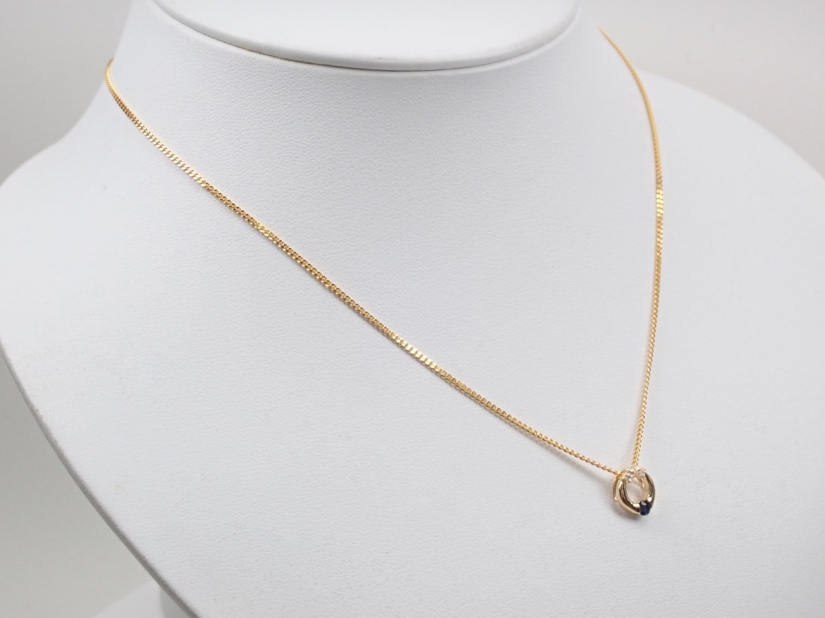 深色藍寶石製成的項鍊頂部。圓形圖案具有永恆的設計,尺寸恰到好處,非常適合日常使用。黃金與寶石藍的對比非常美麗。重量約0.8公克。該鑽石為相當於SI~I級的無色鑽石。