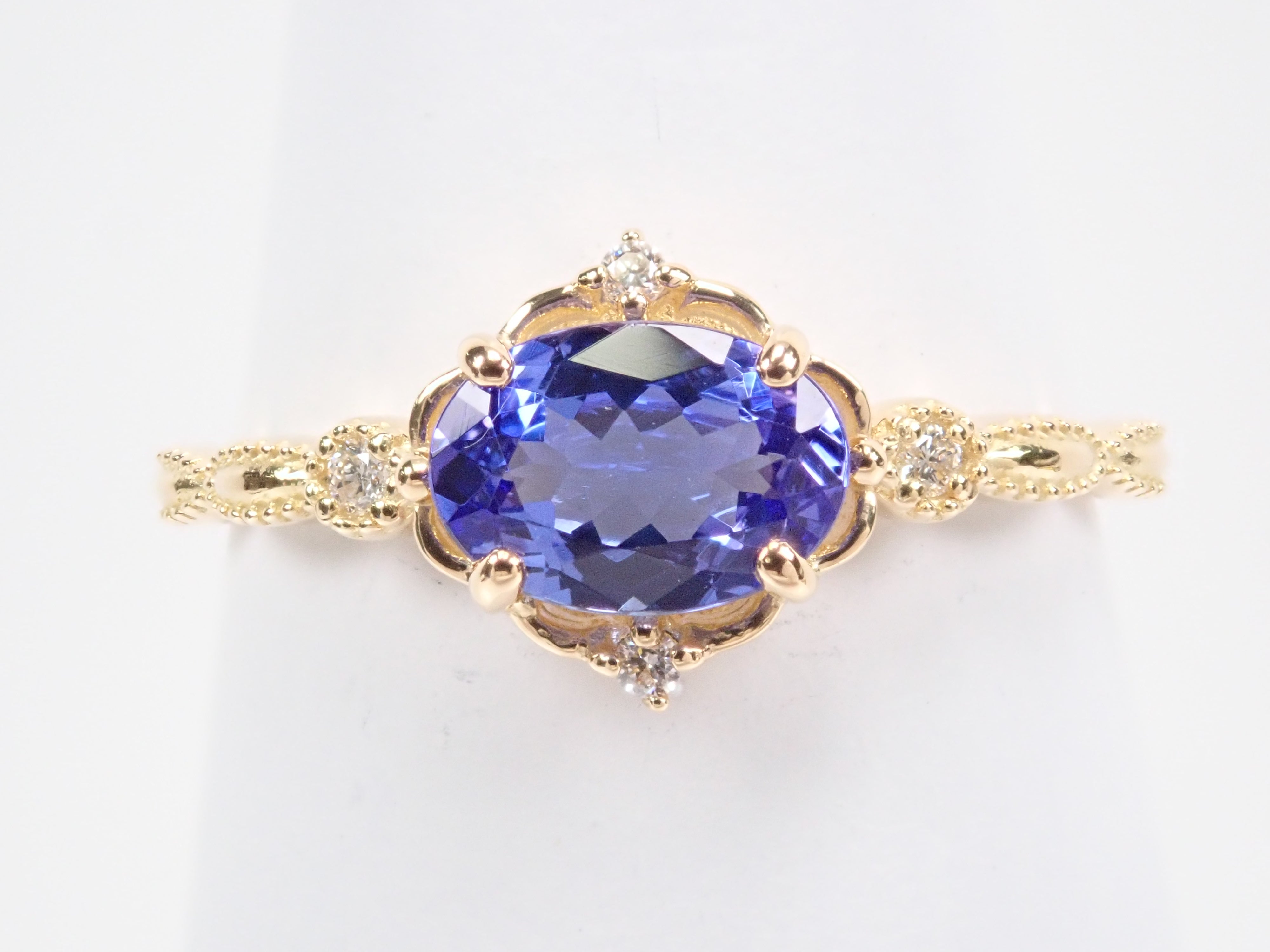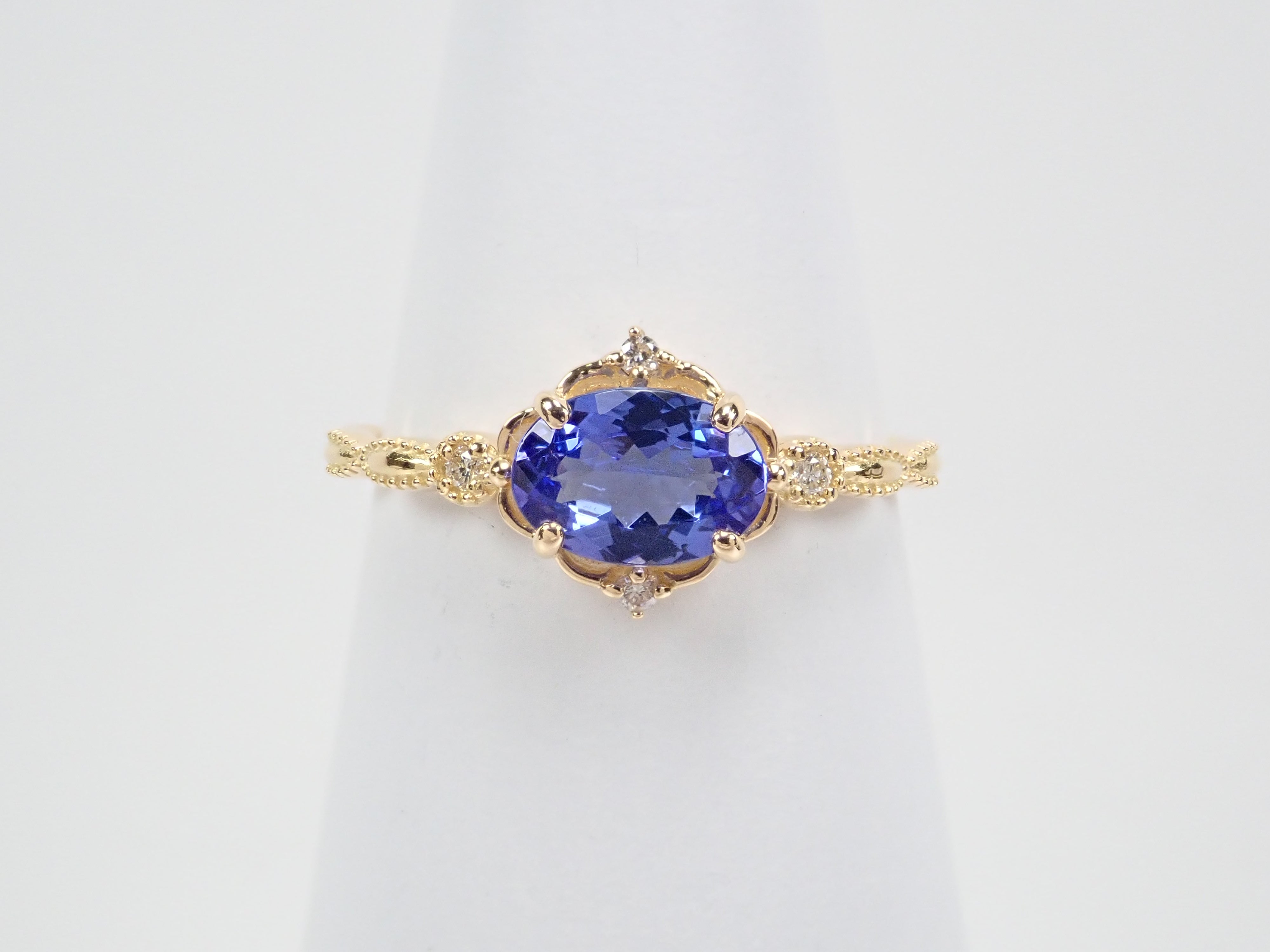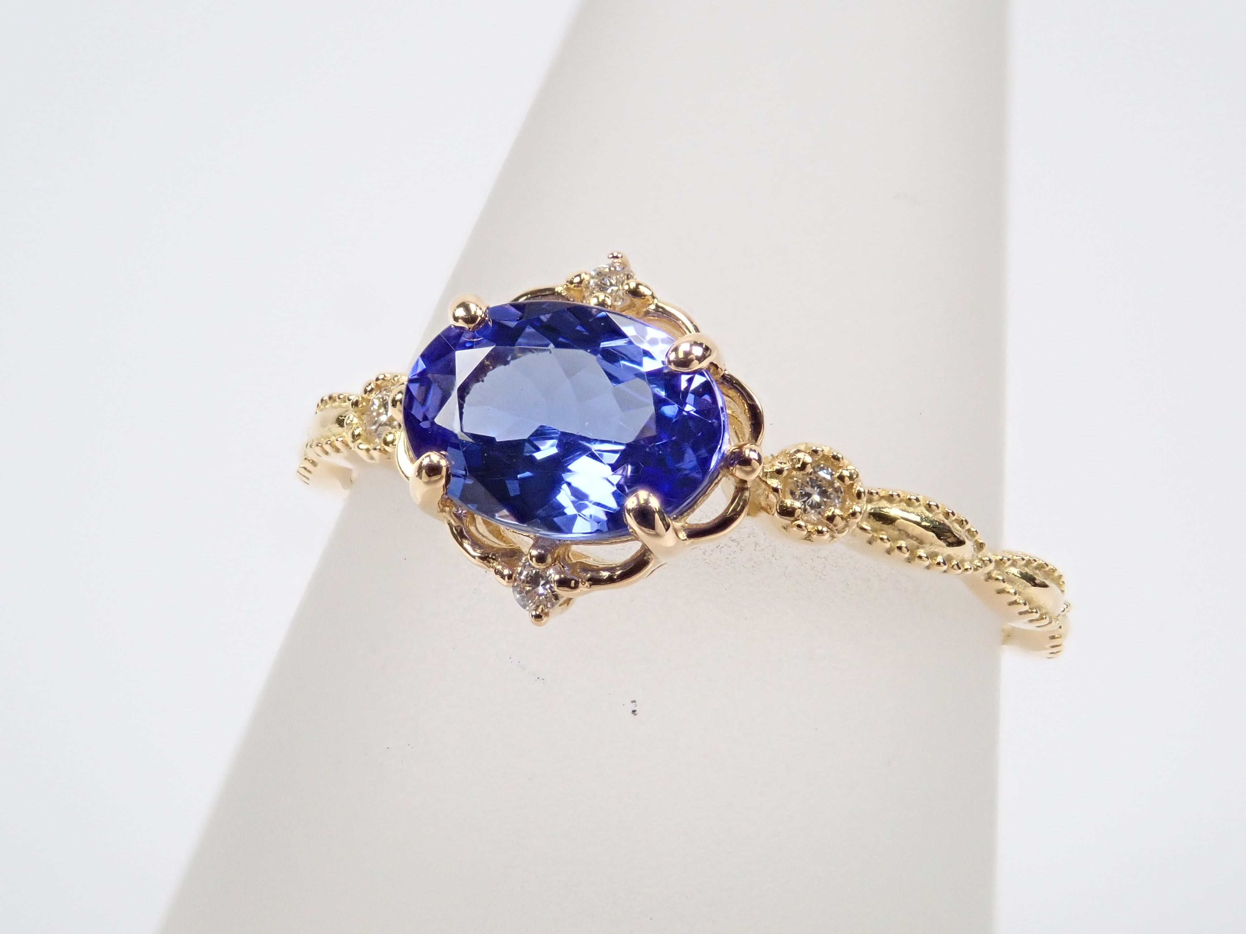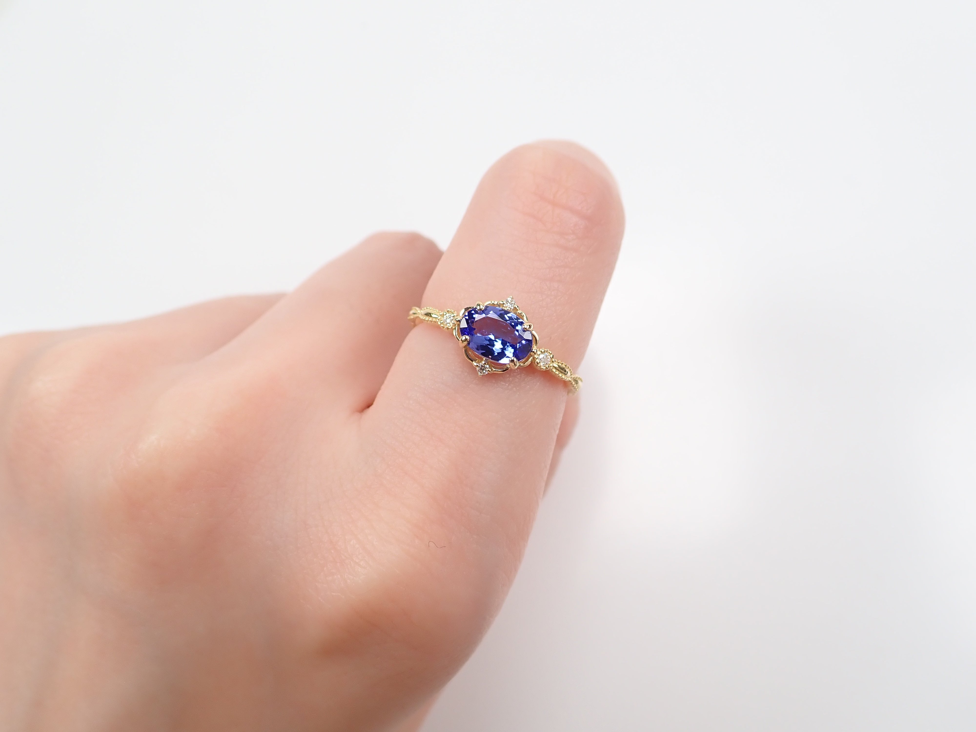坦桑石具有美麗的透明群青色。珠寶周圍的框架像花瓣一樣可愛。修長的兩辮臂呈鋸狀,既凸顯了珠寶的魅力,也營造出精緻溫柔的氛圍。