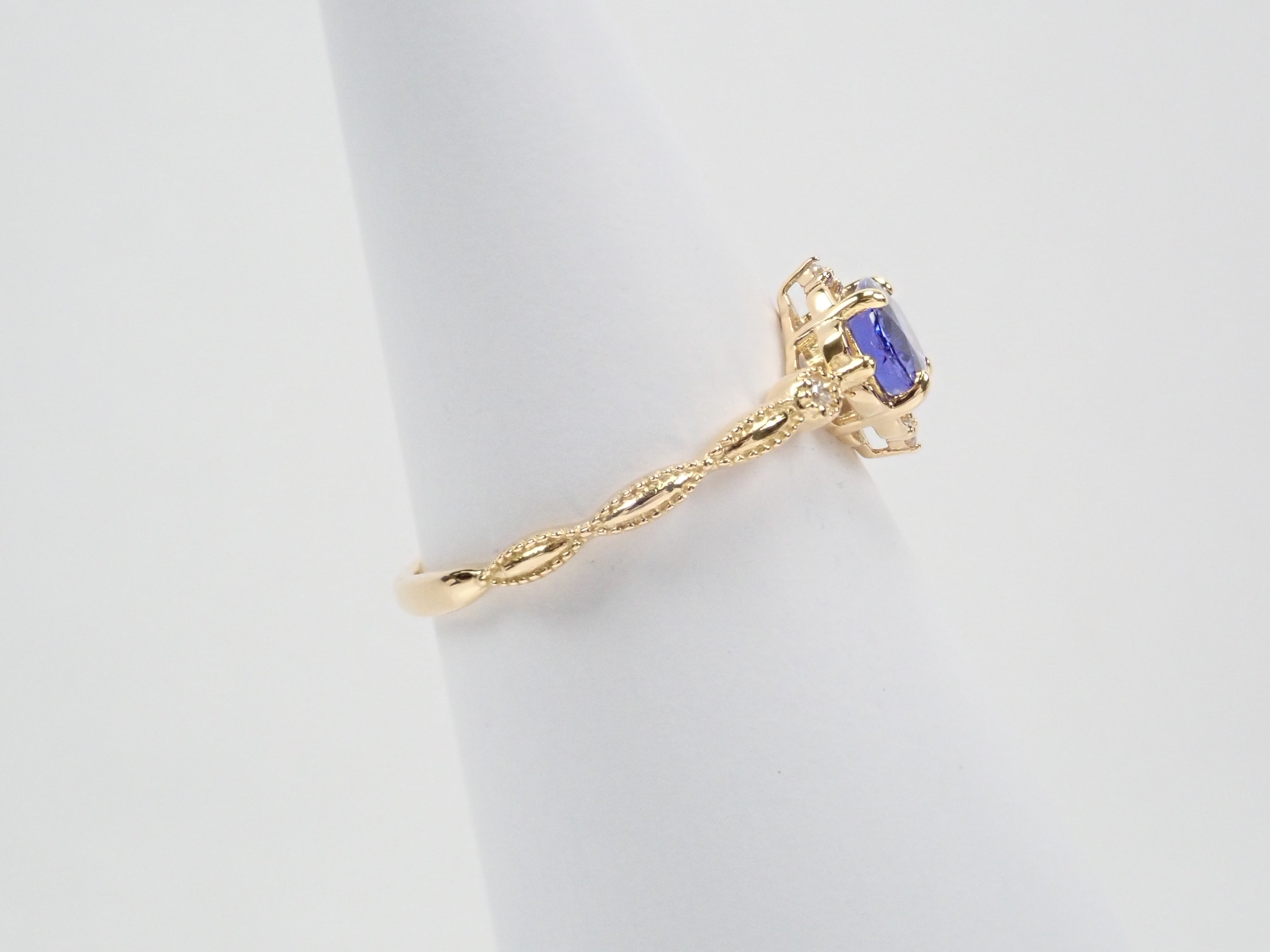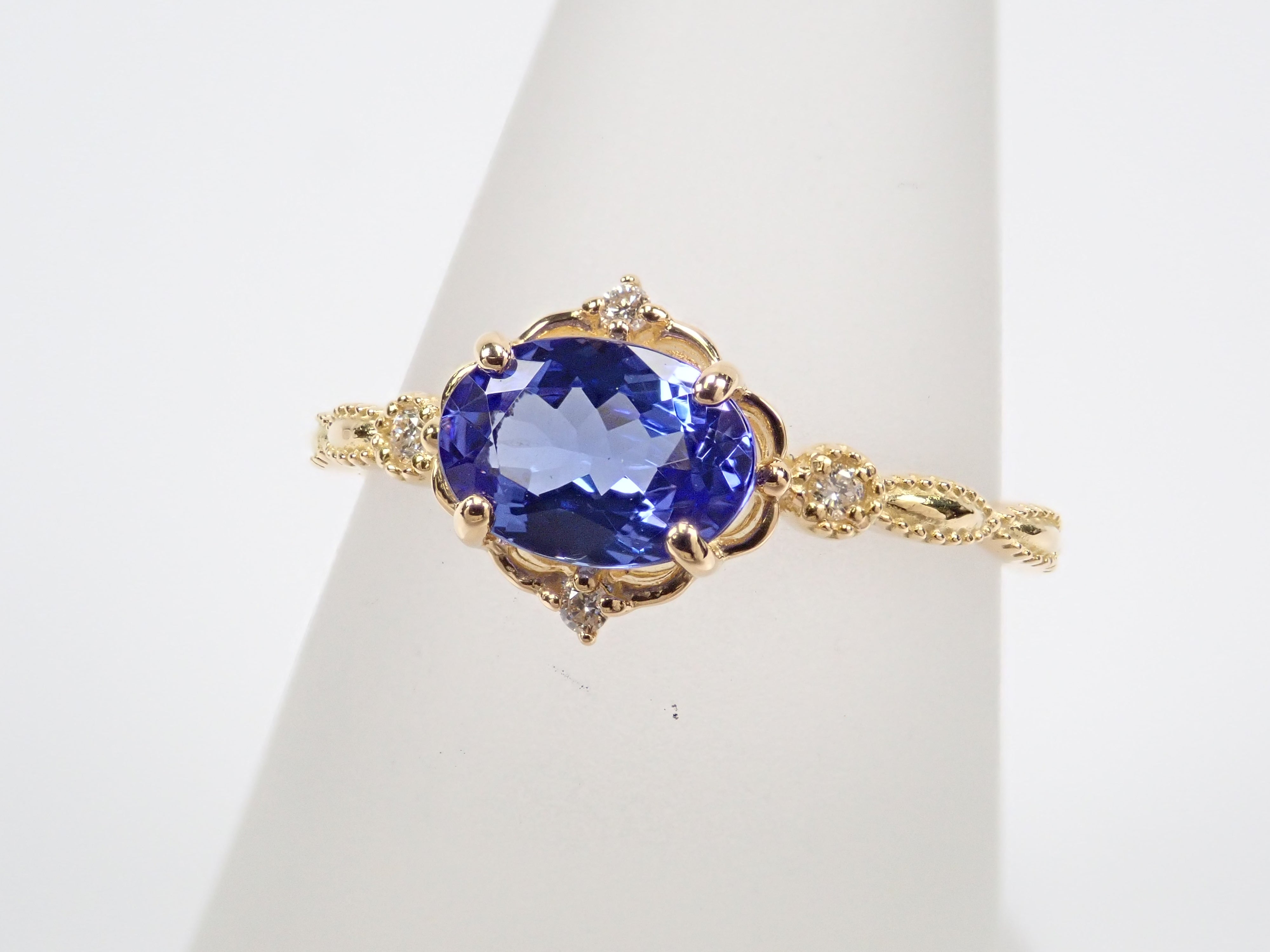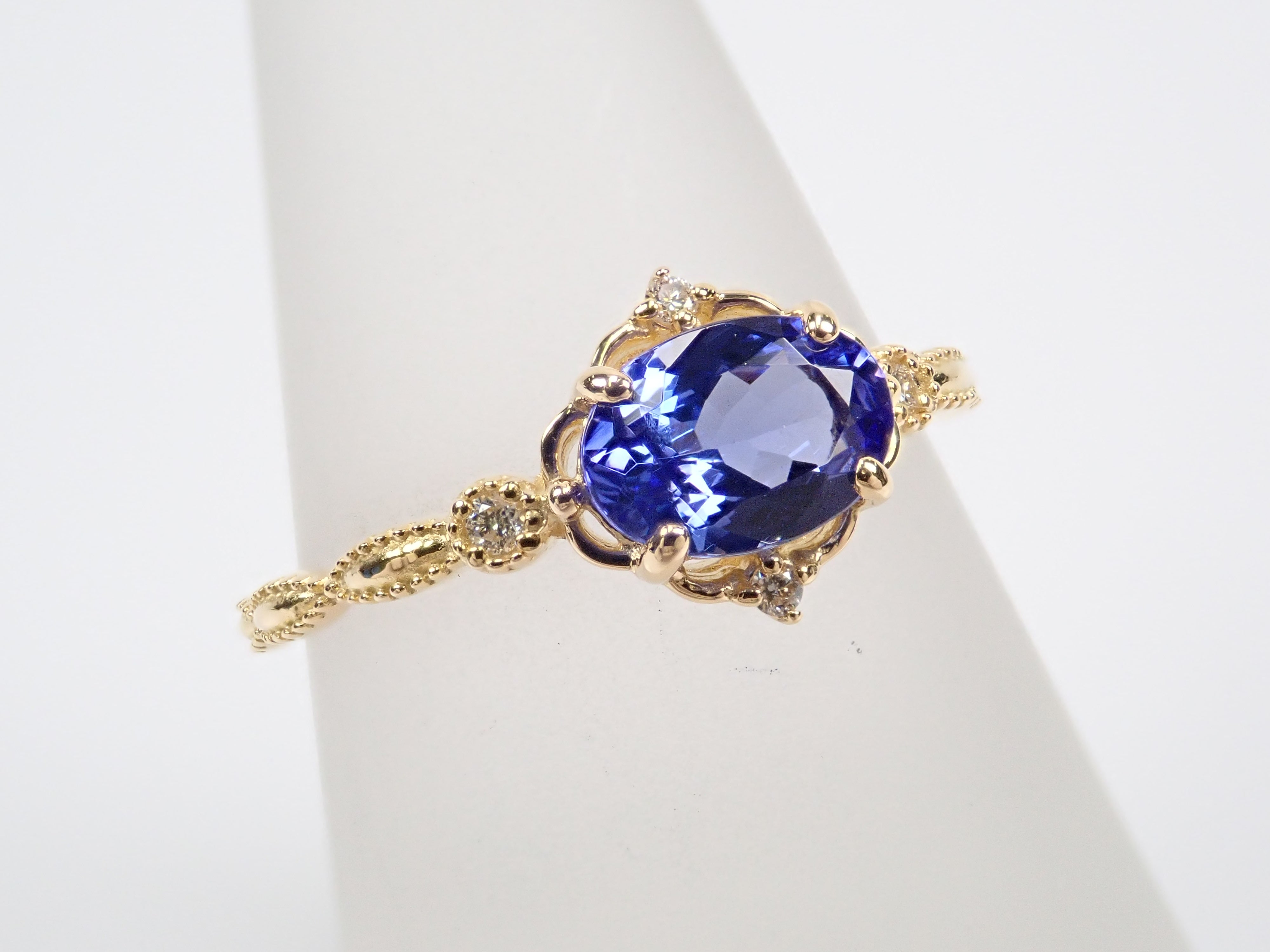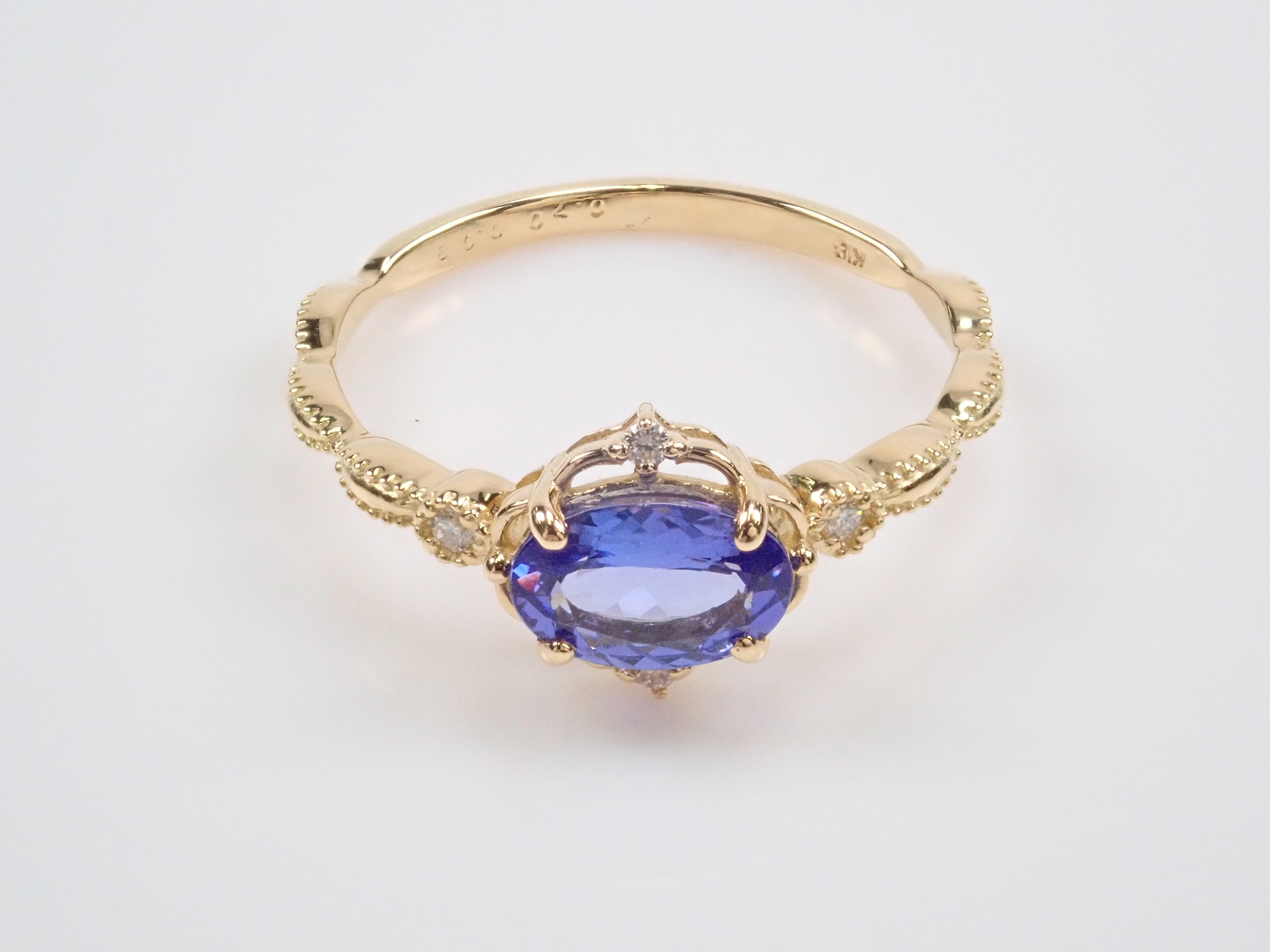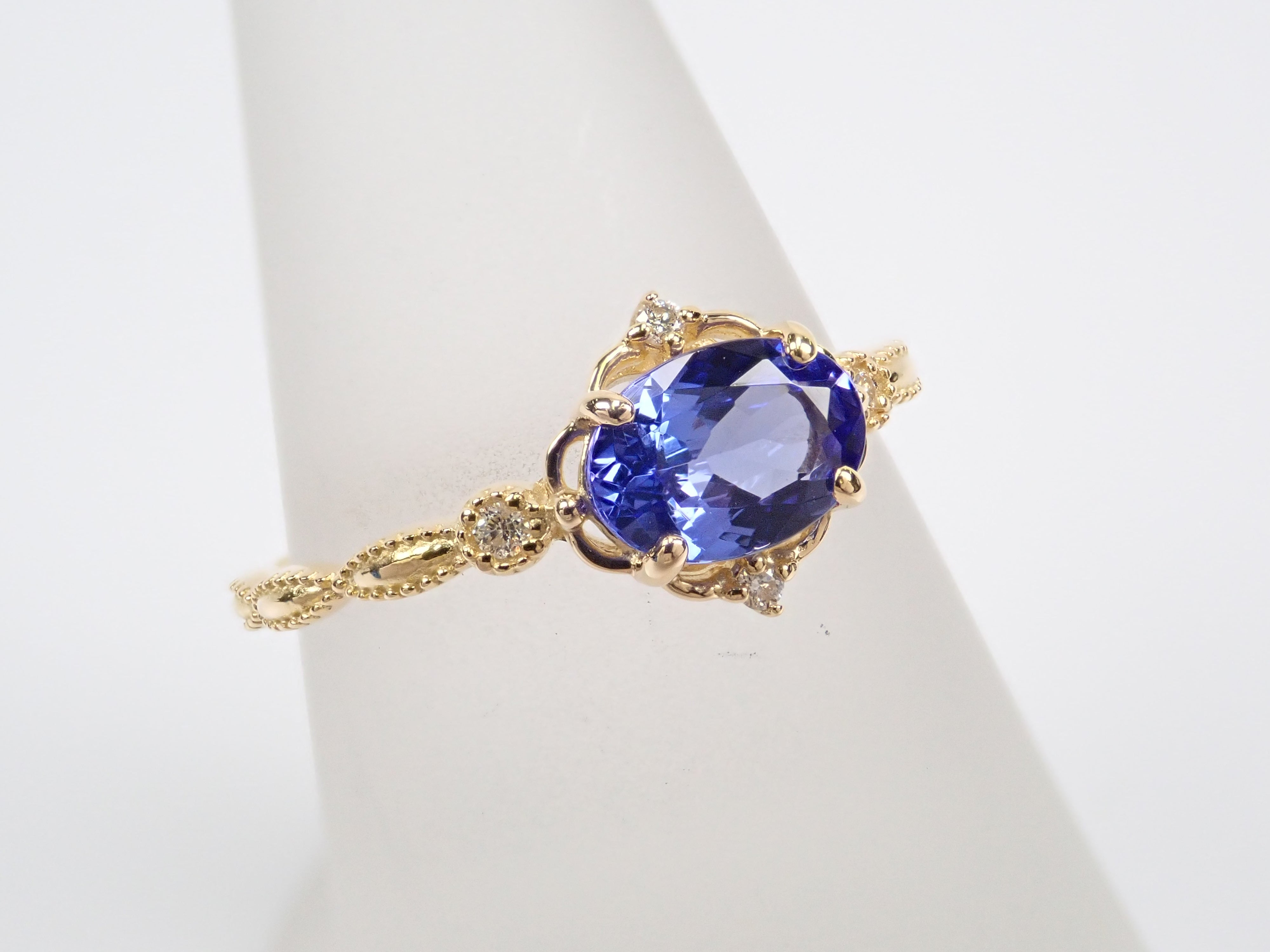 坦桑石具有美麗的透明群青色。珠寶周圍的框架像花瓣一樣可愛。修長的兩辮臂呈鋸狀,既凸顯了珠寶的魅力,也營造出精緻溫柔的氛圍。