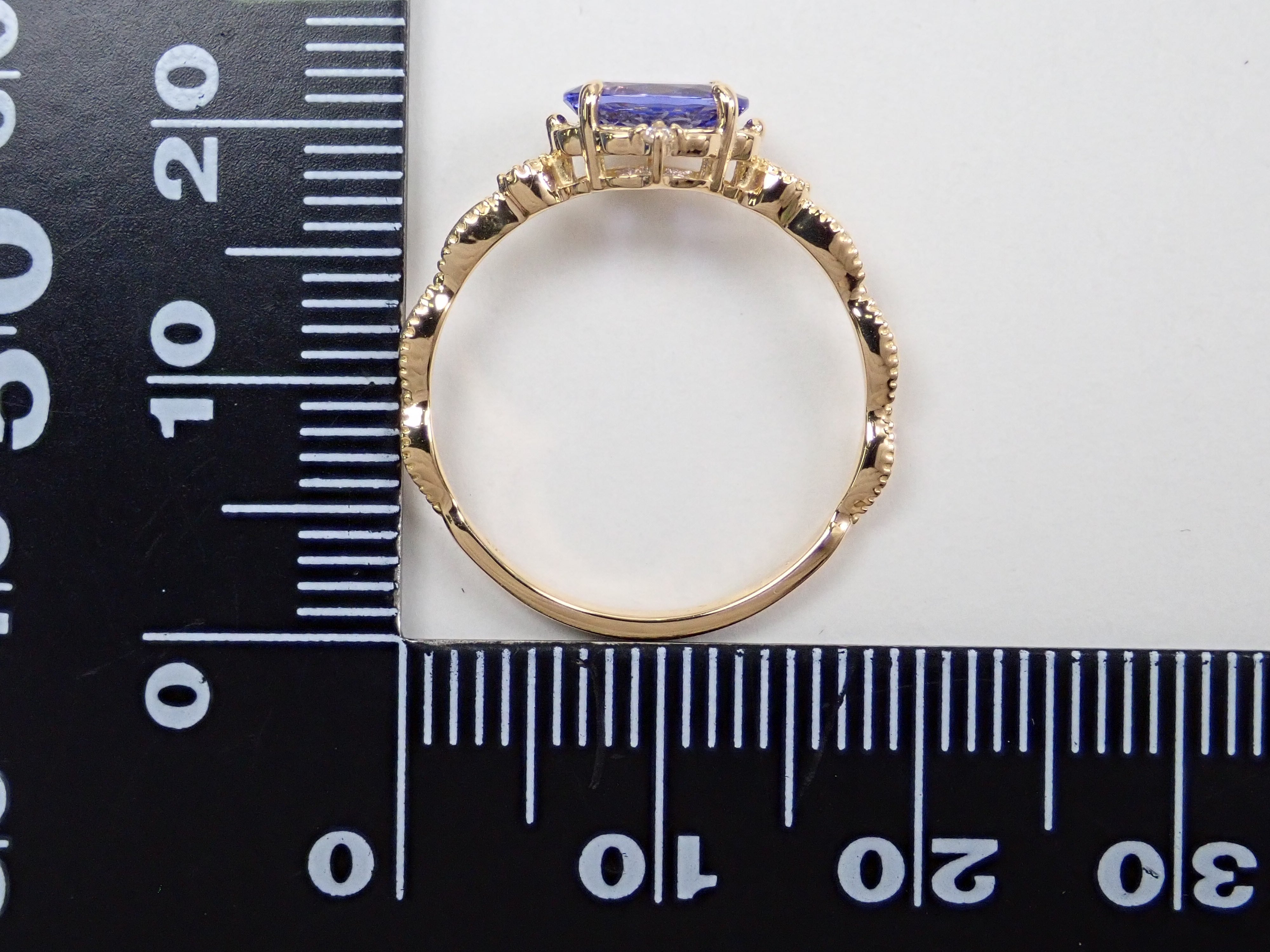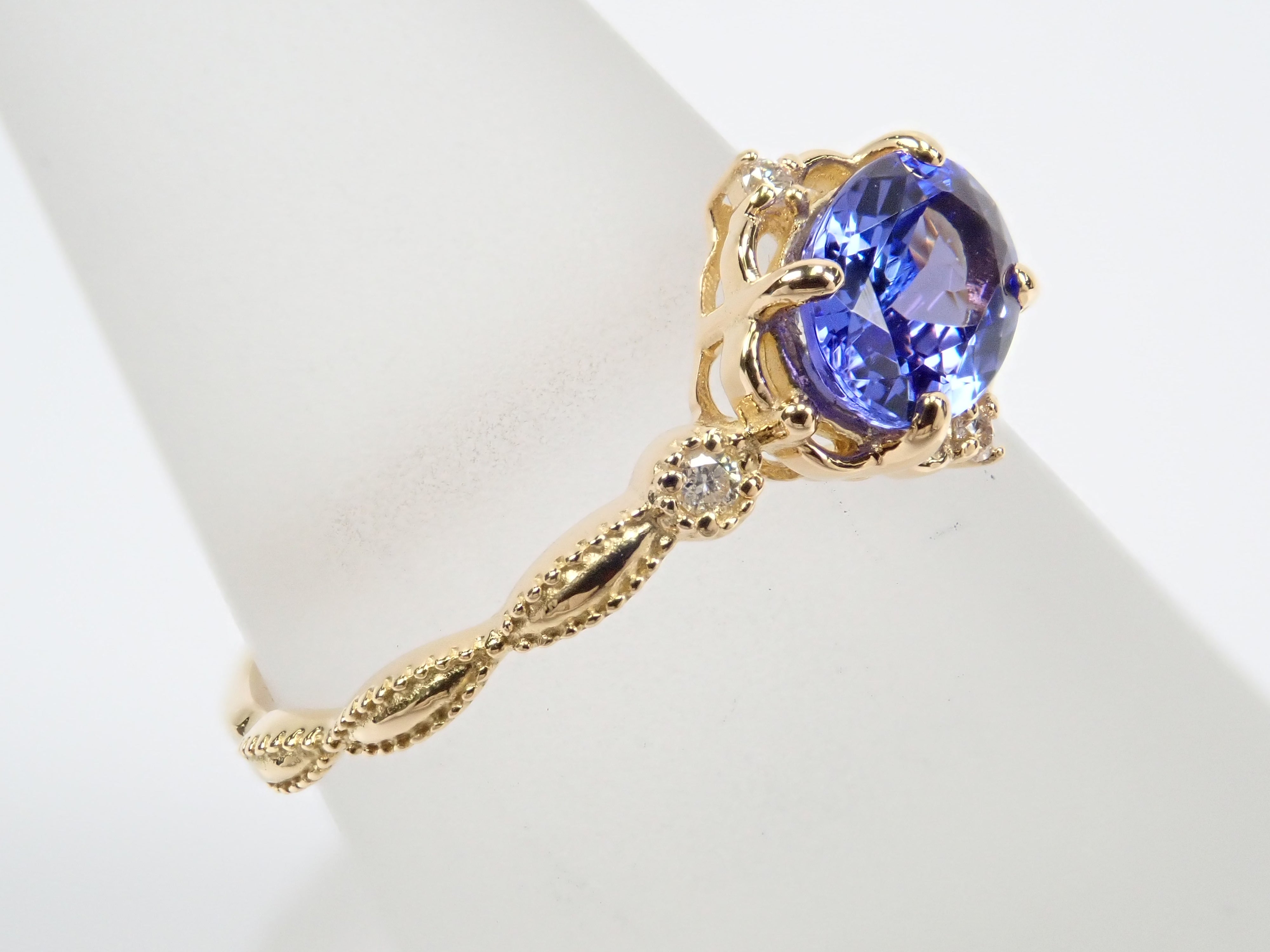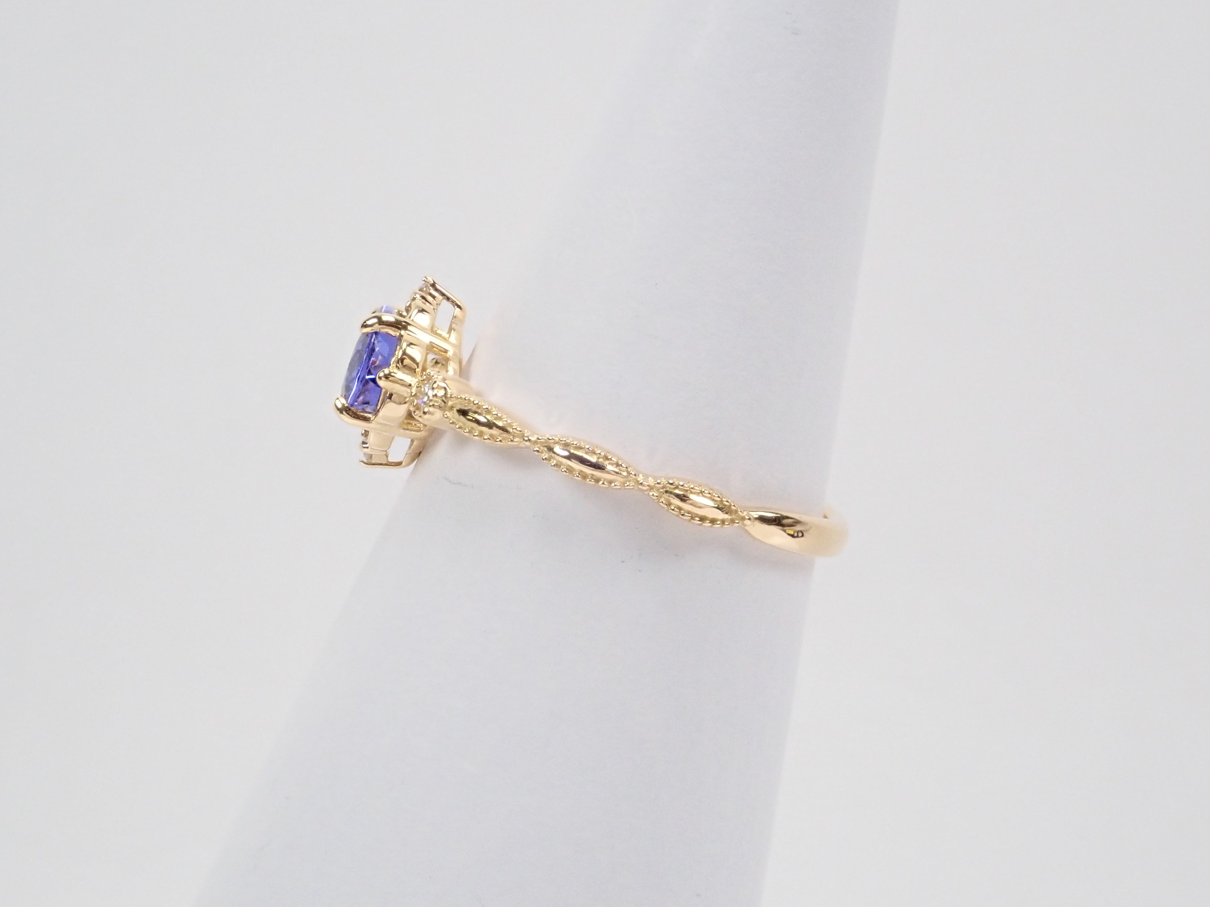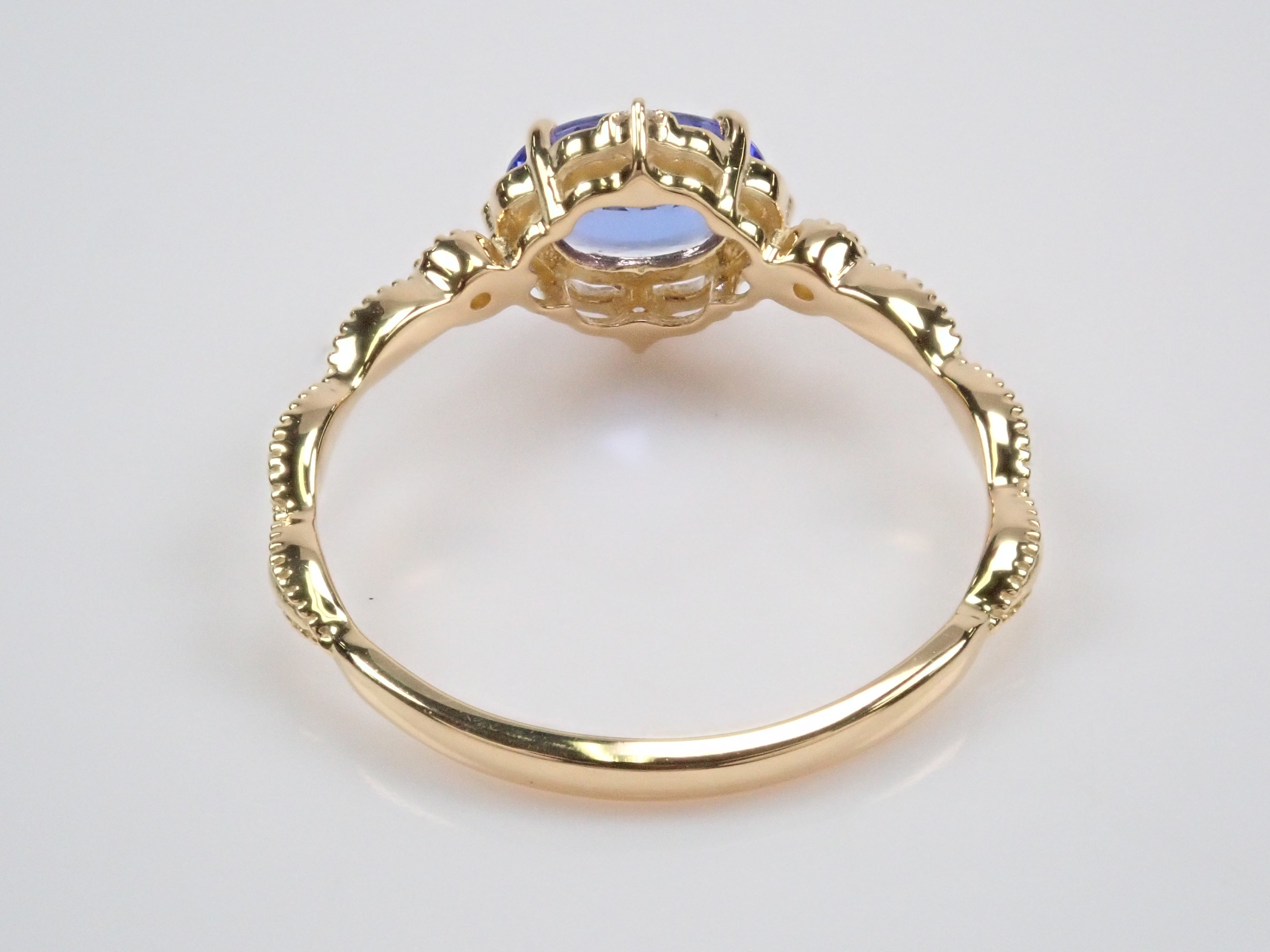 坦桑石具有美麗的透明群青色。珠寶周圍的框架像花瓣一樣可愛。修長的兩辮臂呈鋸狀,既凸顯了珠寶的魅力,也營造出精緻溫柔的氛圍。