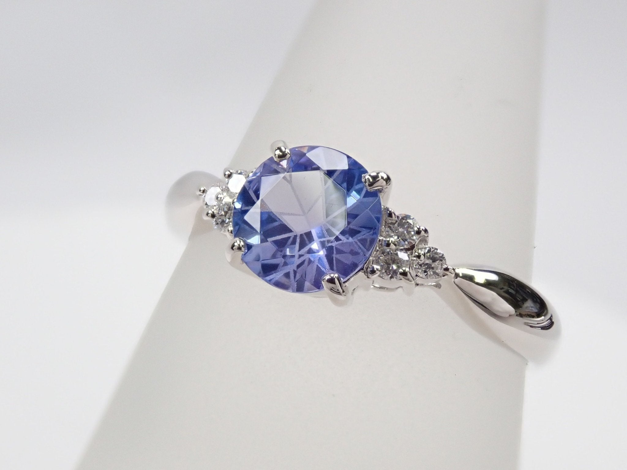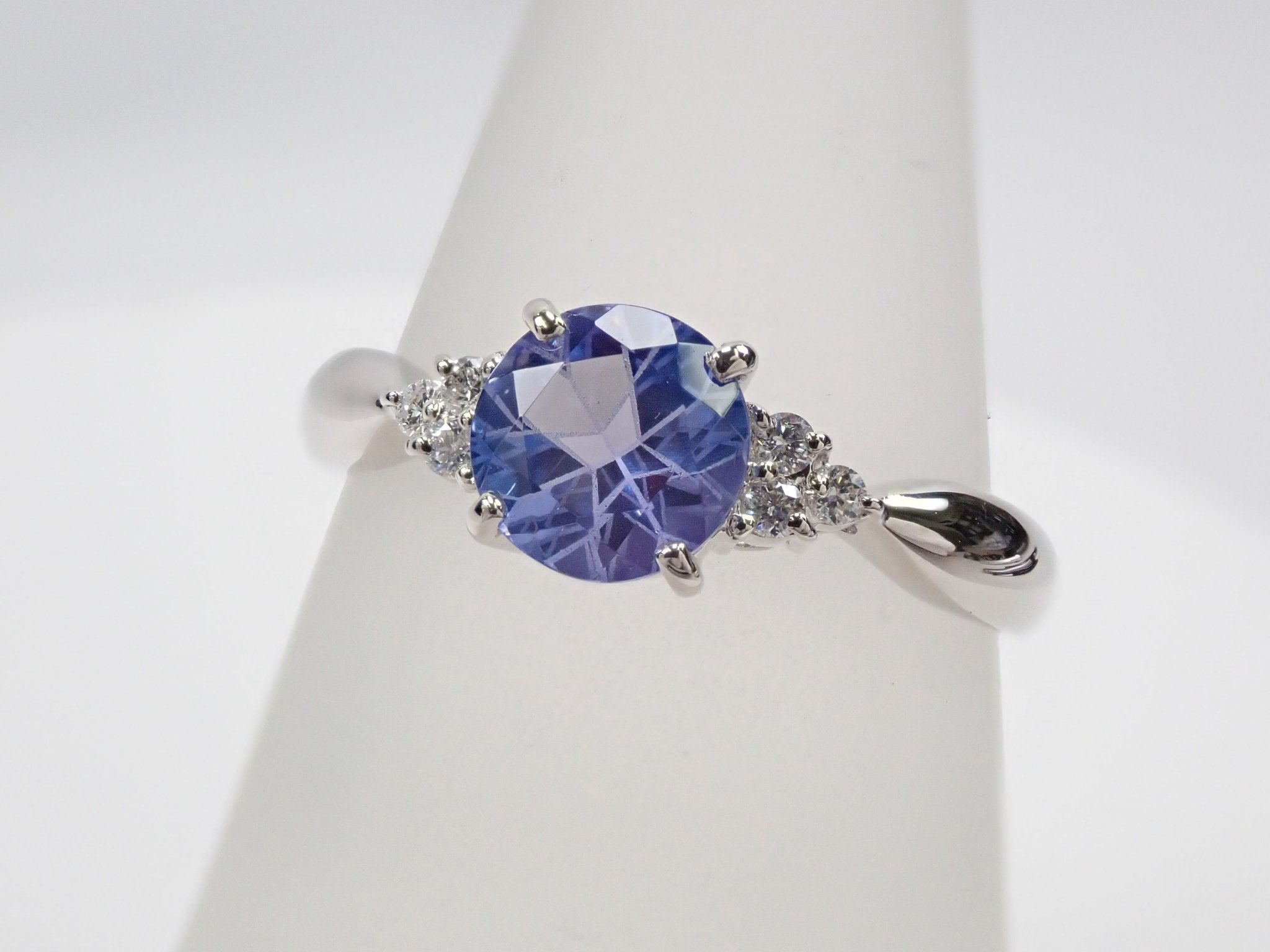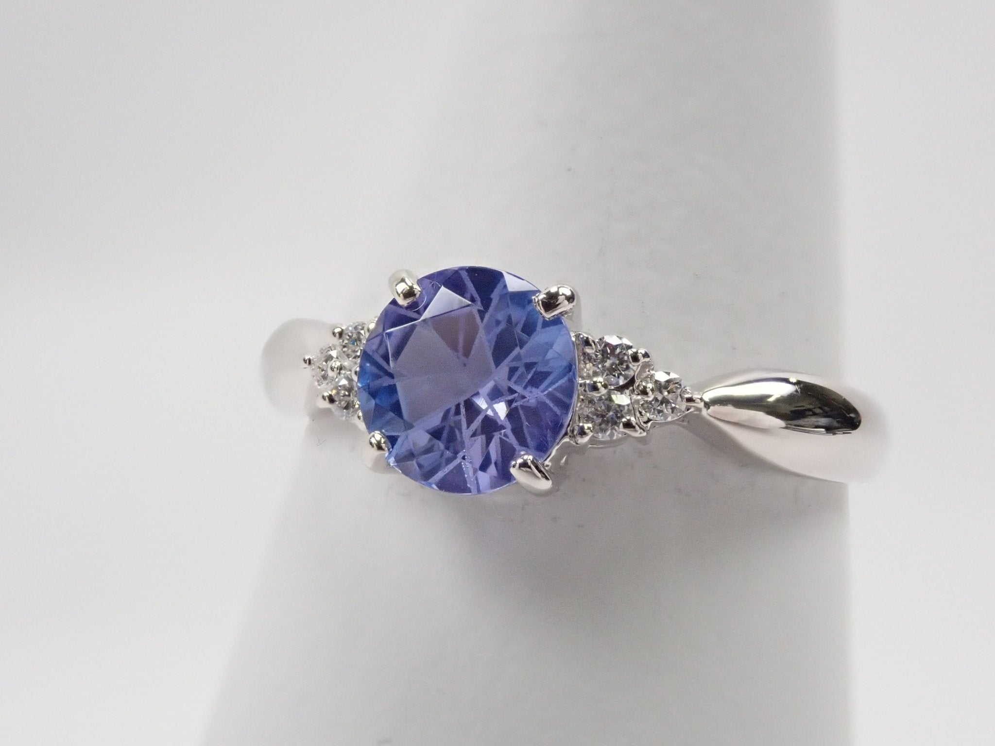 柔和的紫色坦桑石,因工匠的精緻切割而閃閃發光。每邊放置三顆鑽石。我想,這竟然是一枚有著特殊感覺的戒指。