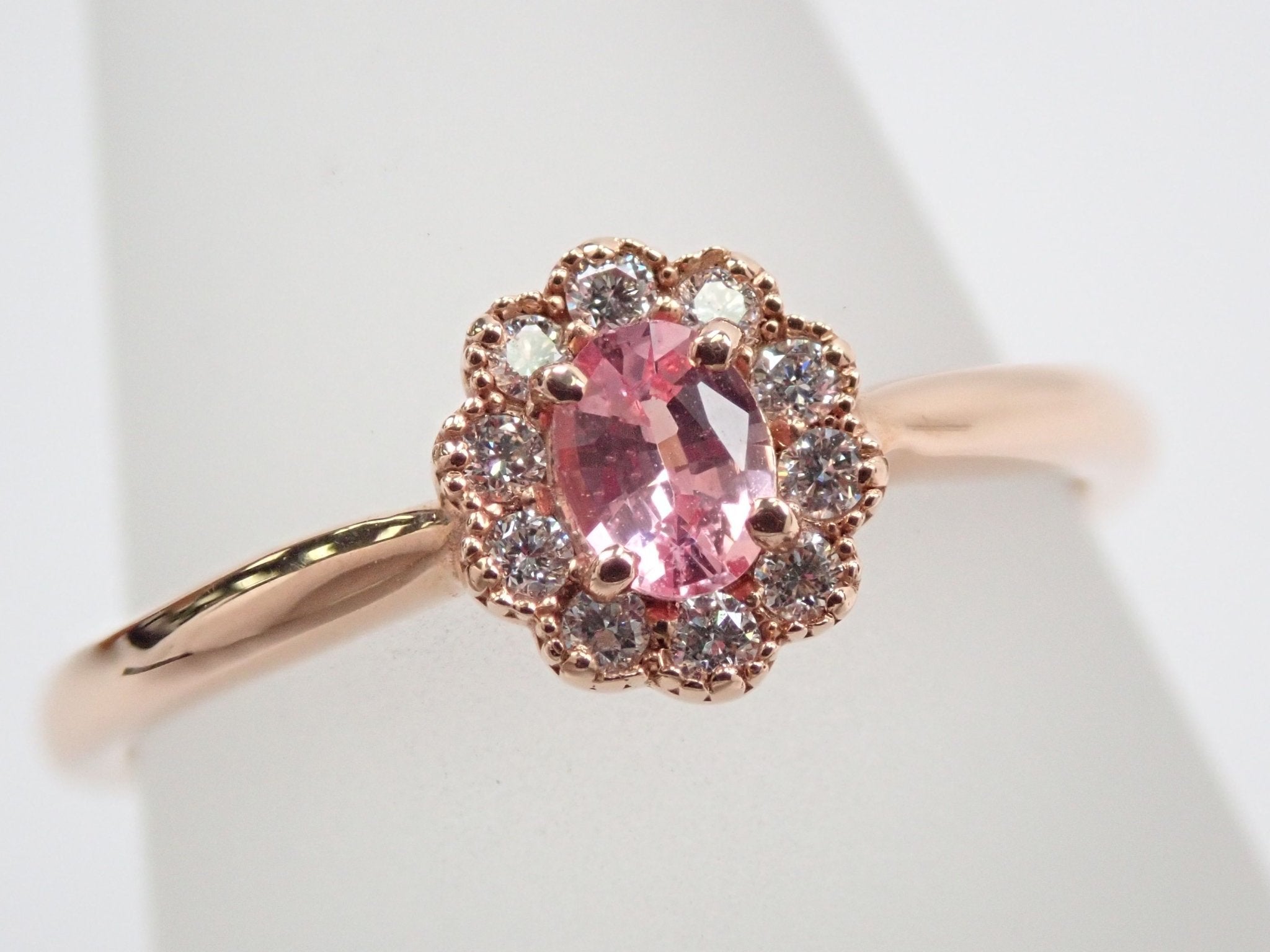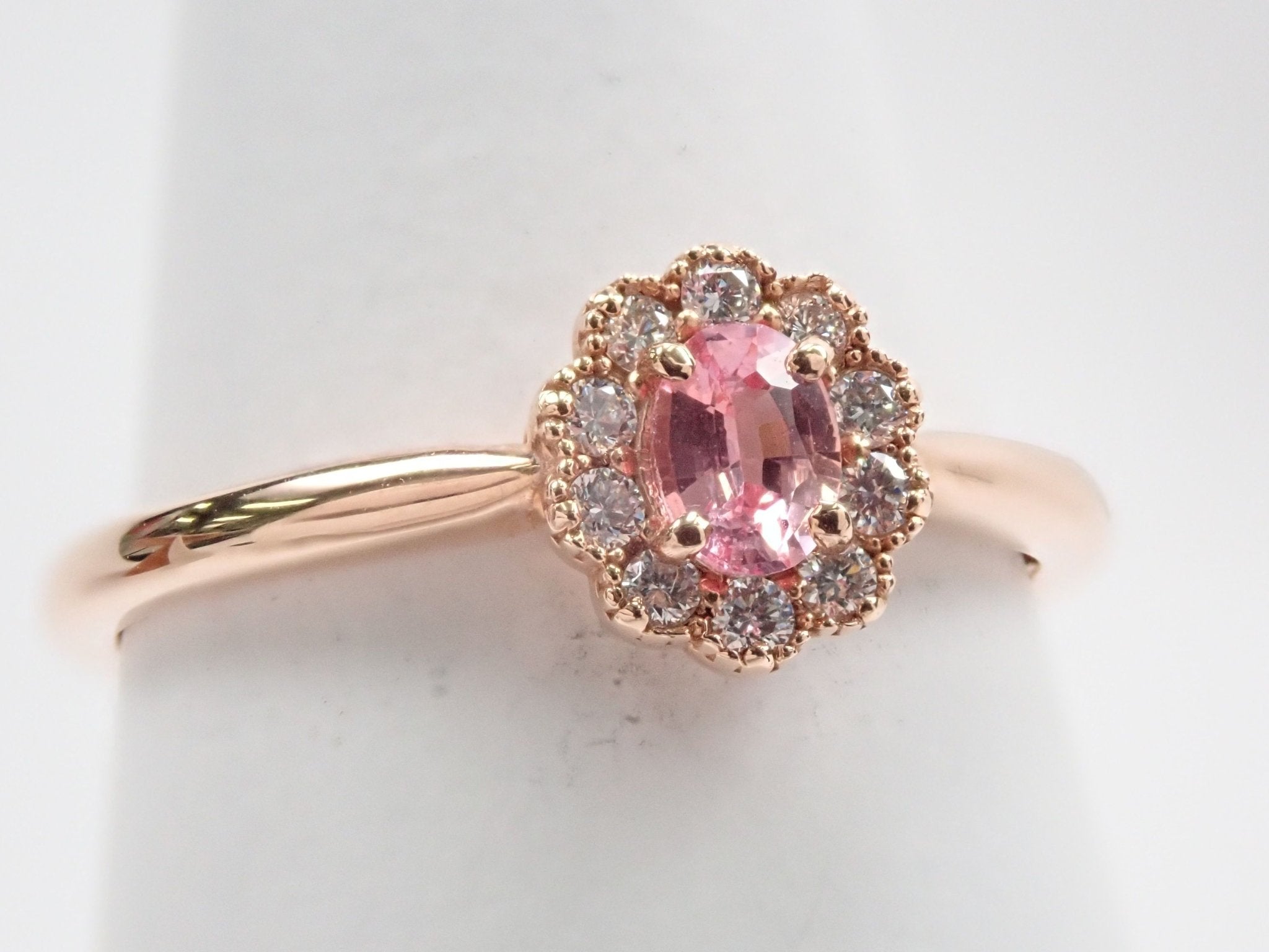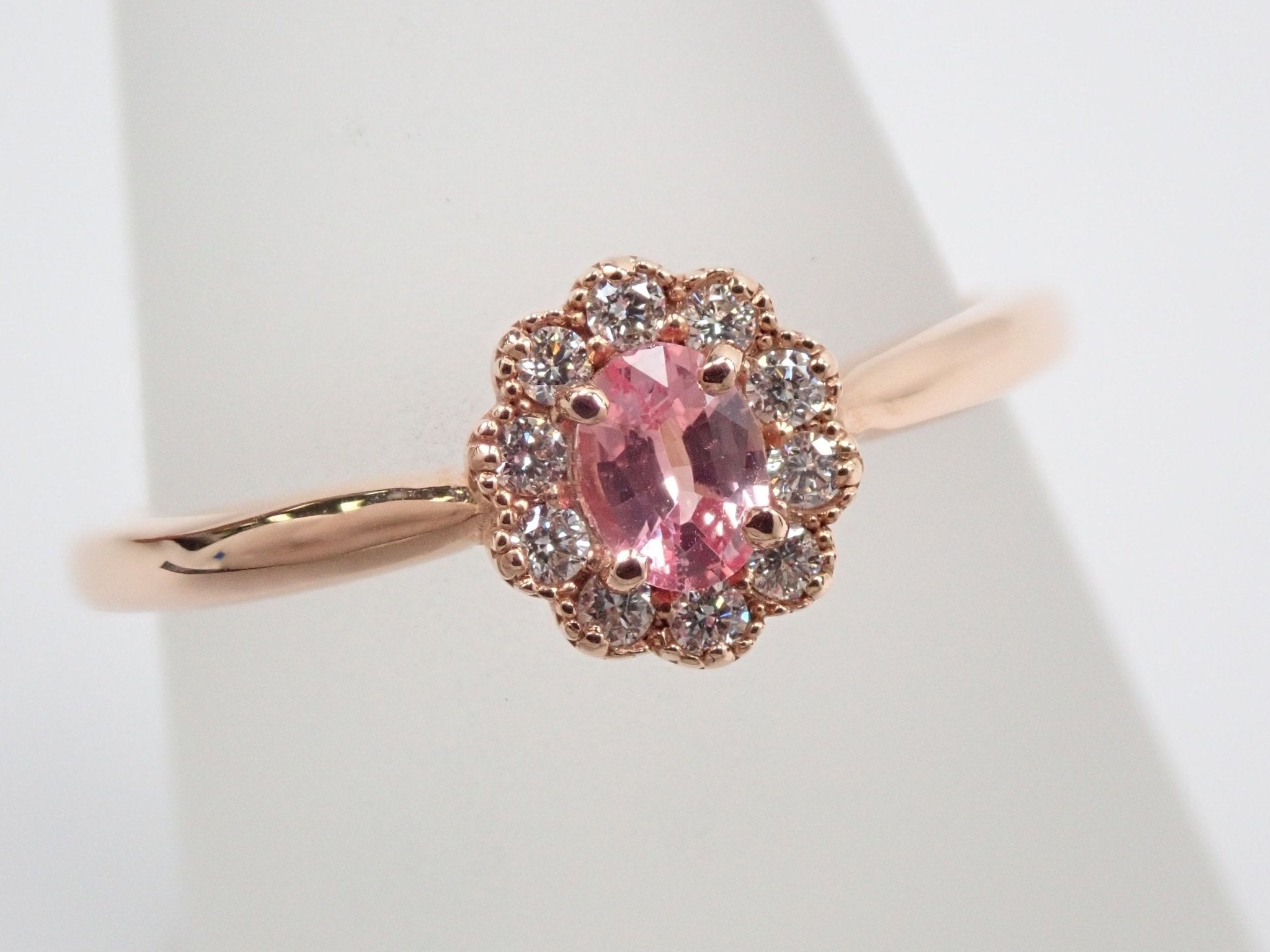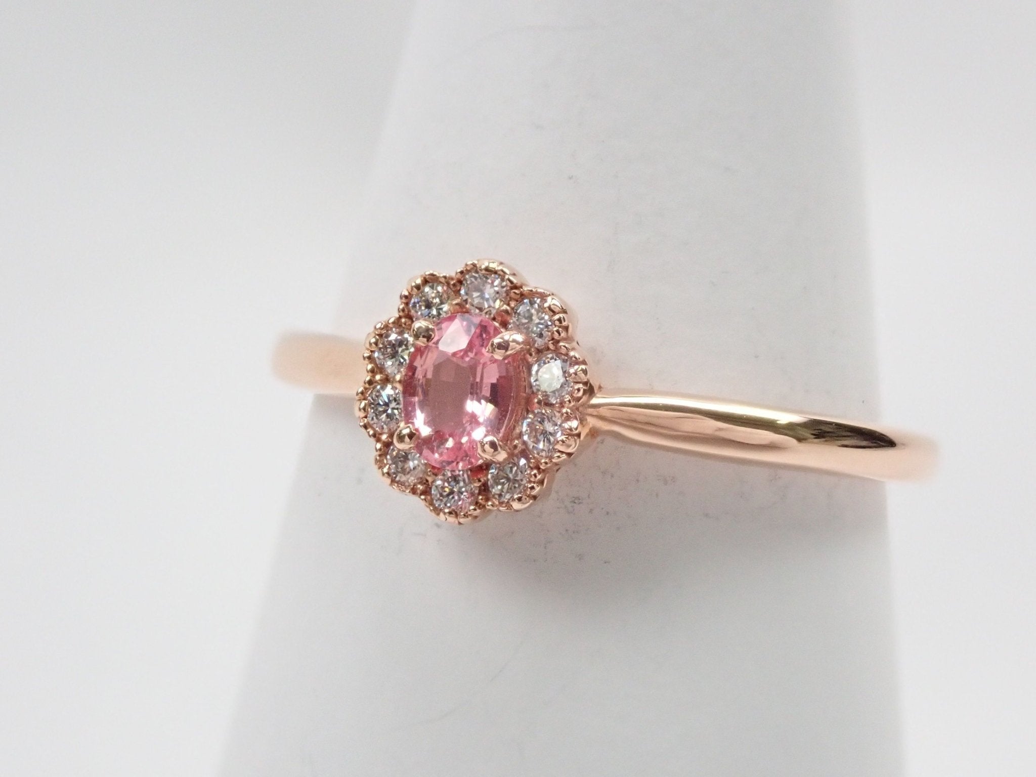 可愛的花朵圖案戒指。帕帕拉恰藍寶石在中心閃閃發光。因為是粉金色,所以我認為它與皮膚融合得很好。