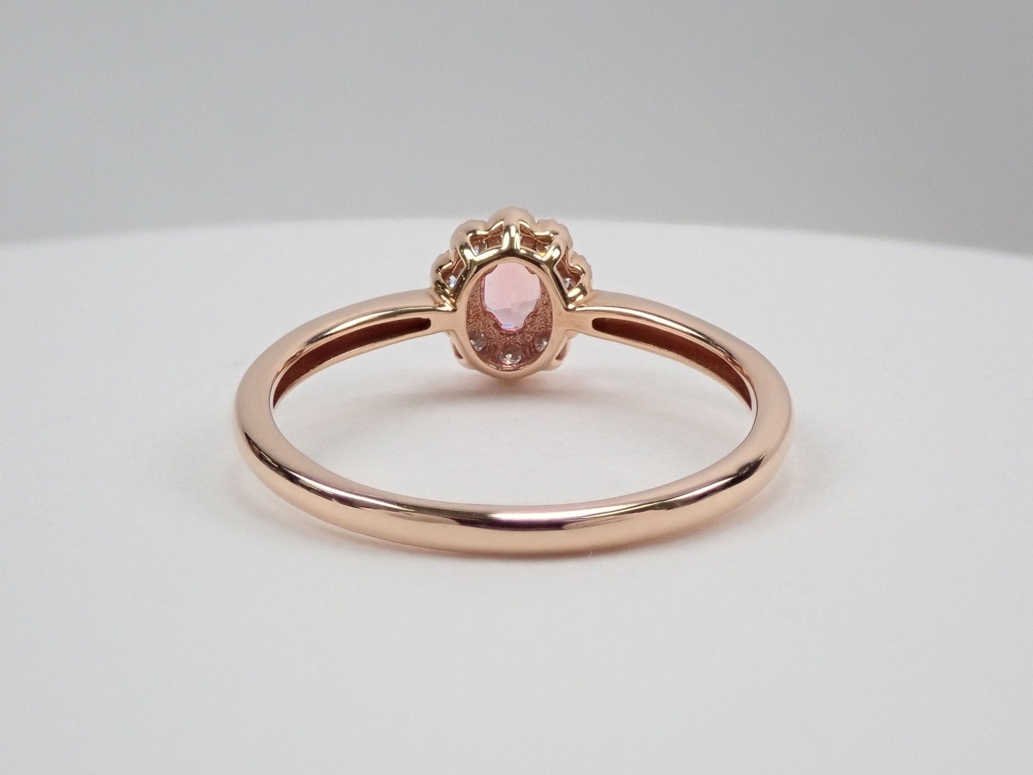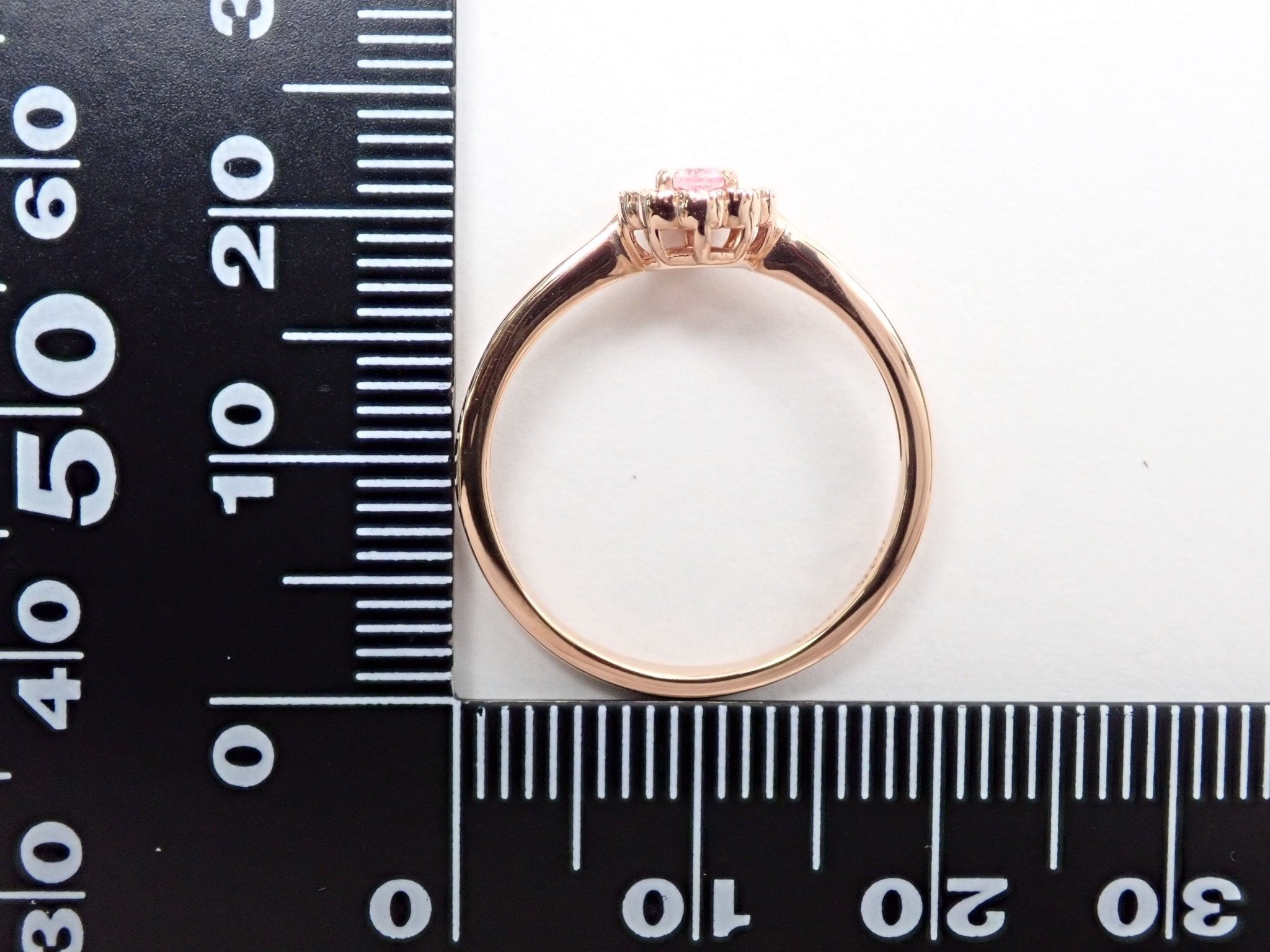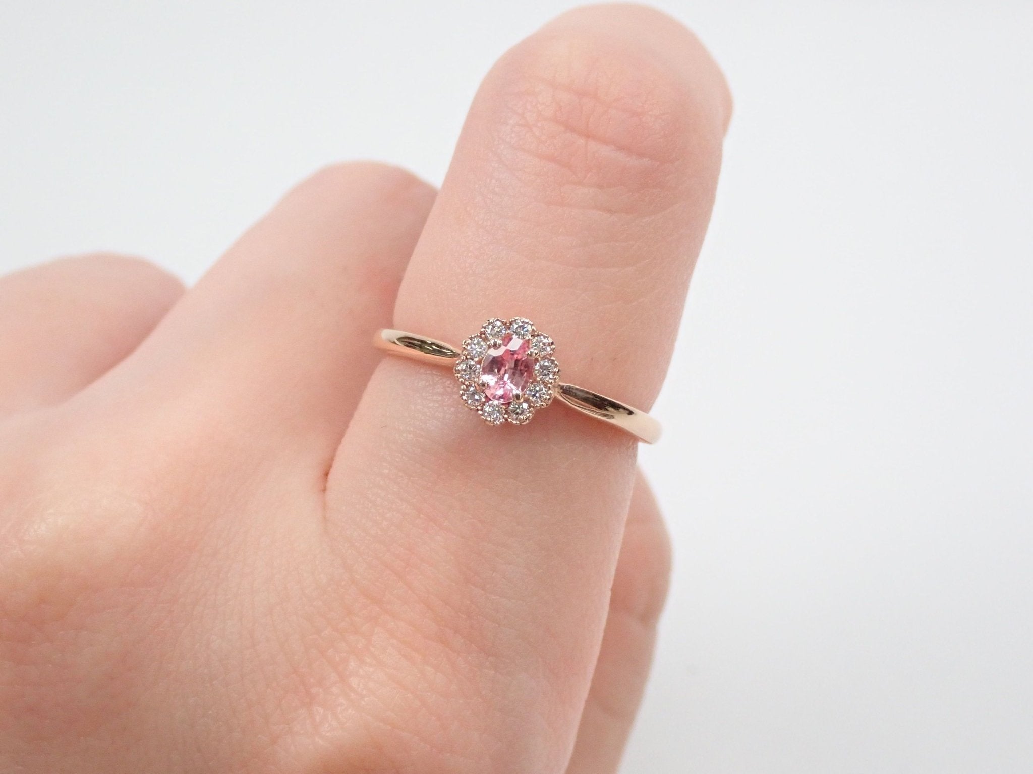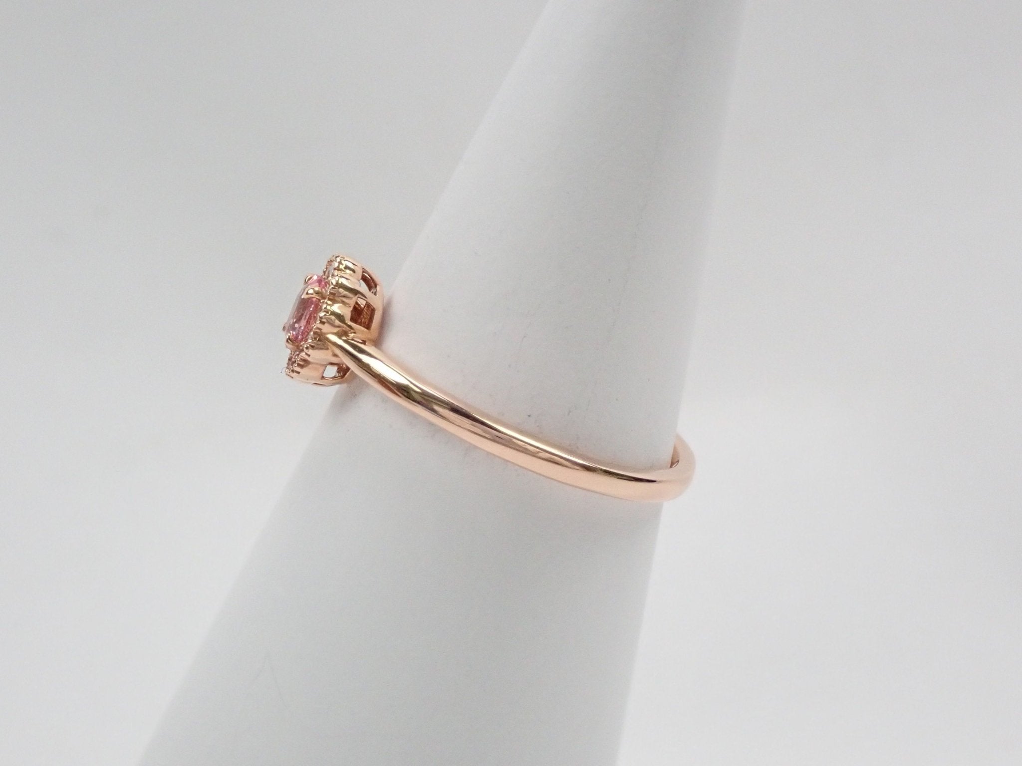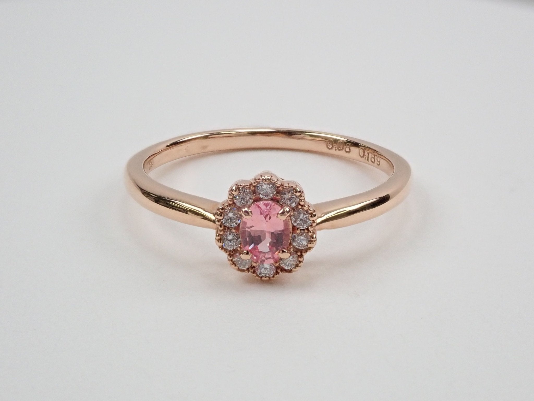 可愛的花朵圖案戒指。帕帕拉恰藍寶石在中心閃閃發光。因為是粉金色,所以我認為它與皮膚融合得很好。