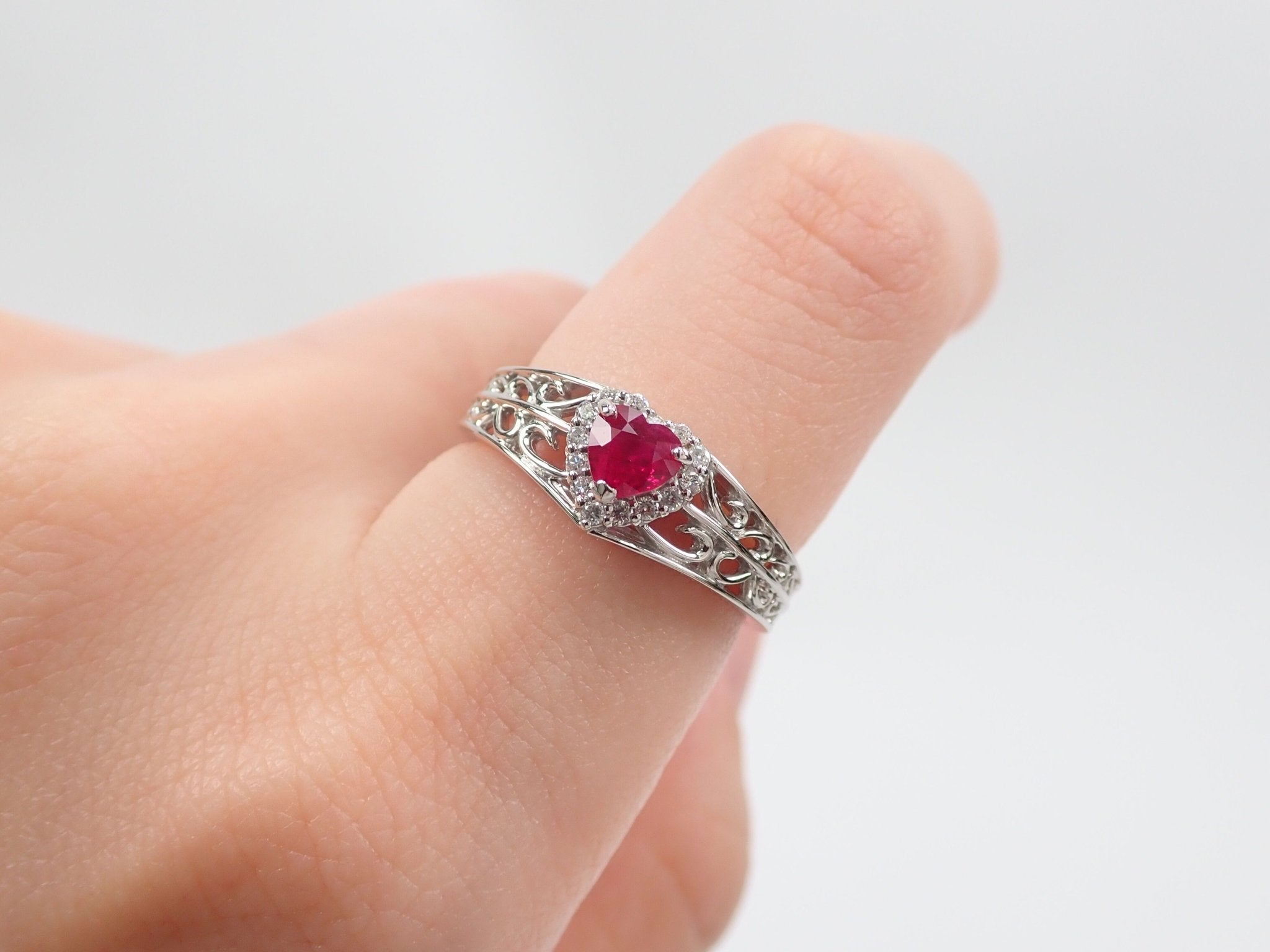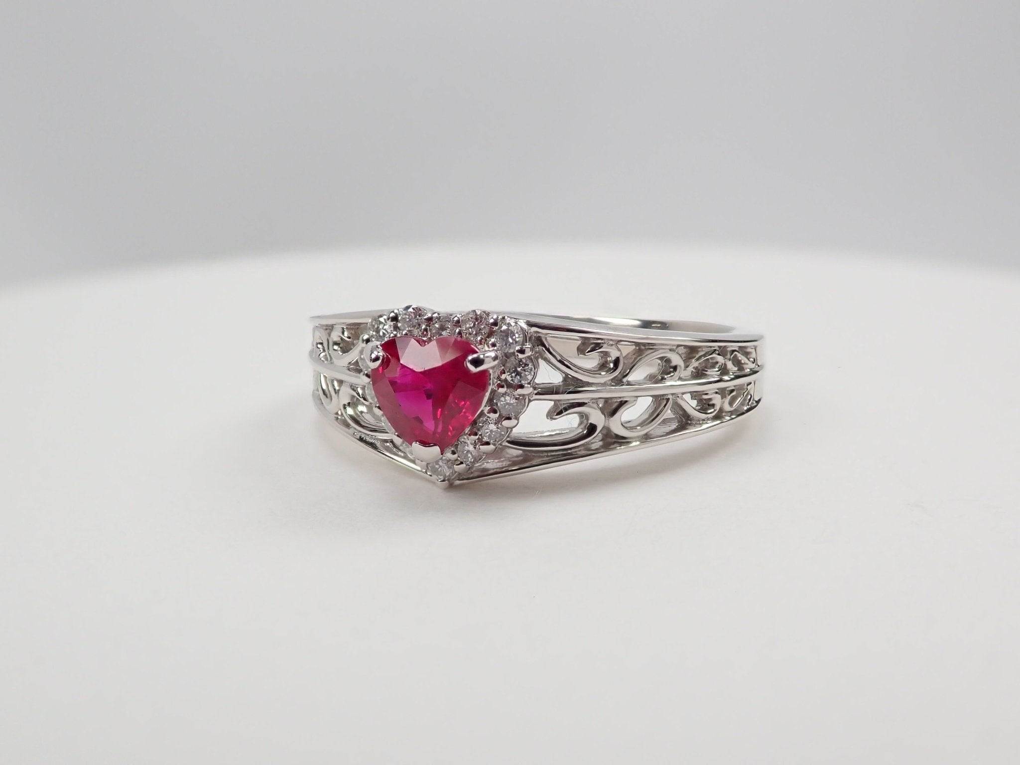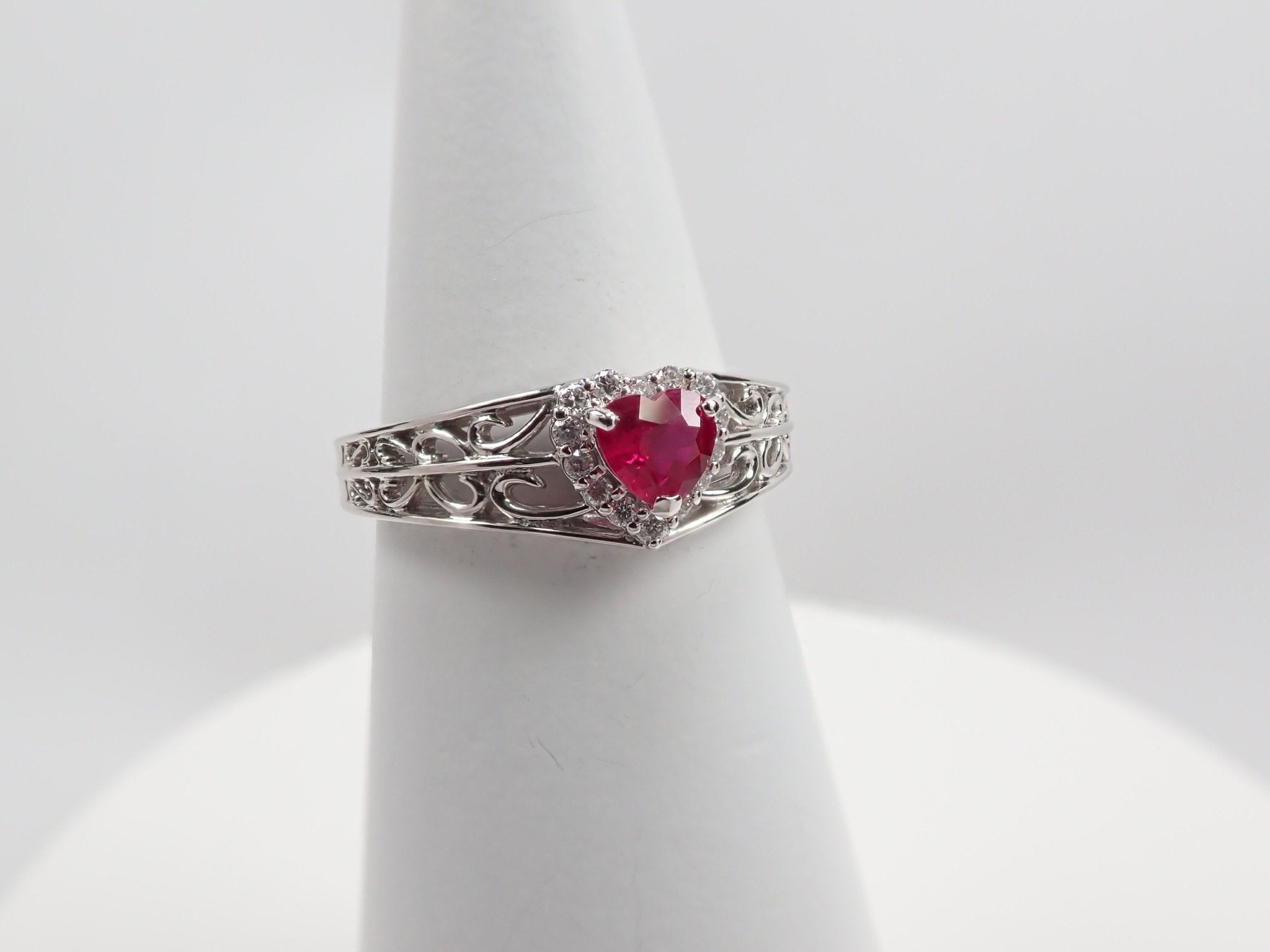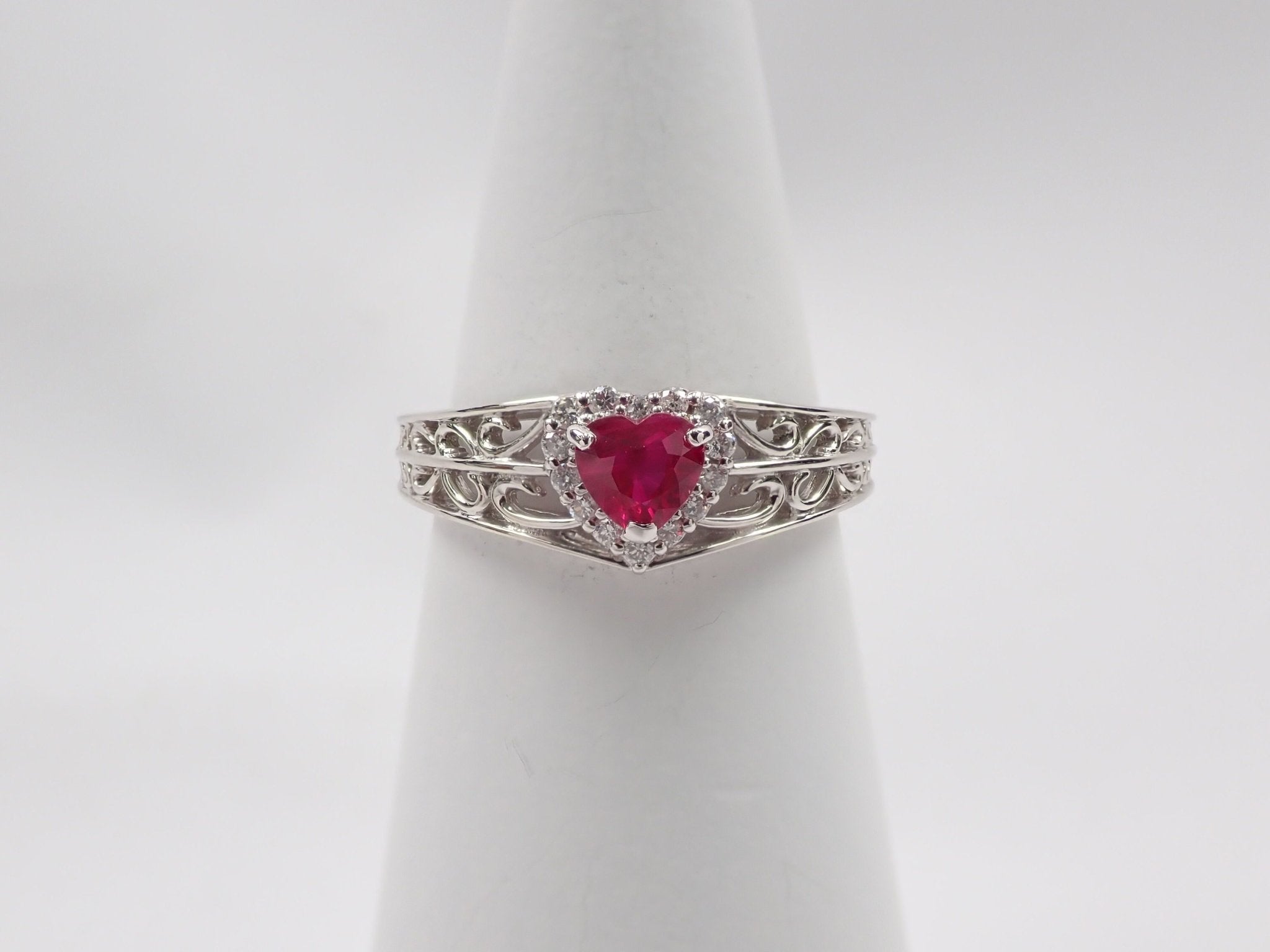 中心是一顆閃閃發光的心形緬甸鴿血紅紅寶石。 Vision Blood Ruby 深厚美麗的紅色非常吸引人,讓您無法將目光從它身上移開。阿拉伯式花紋圖案和米粒鑽給人一種復古的印象。結果發現這是一枚非常可愛的戒指。 Nakaishi 紅寶石附有 GIA 真品證書。這是由鬆散的 Karatz 製成的珠寶。
