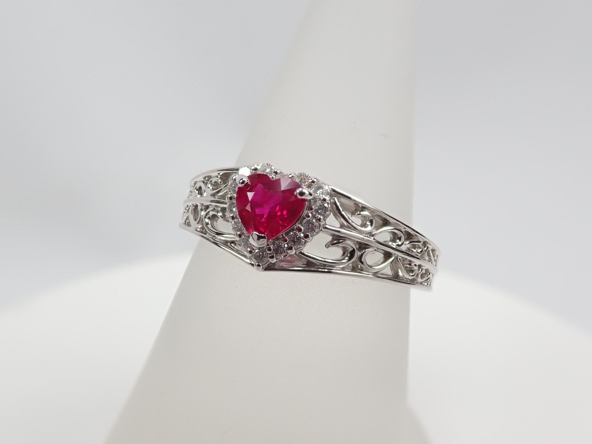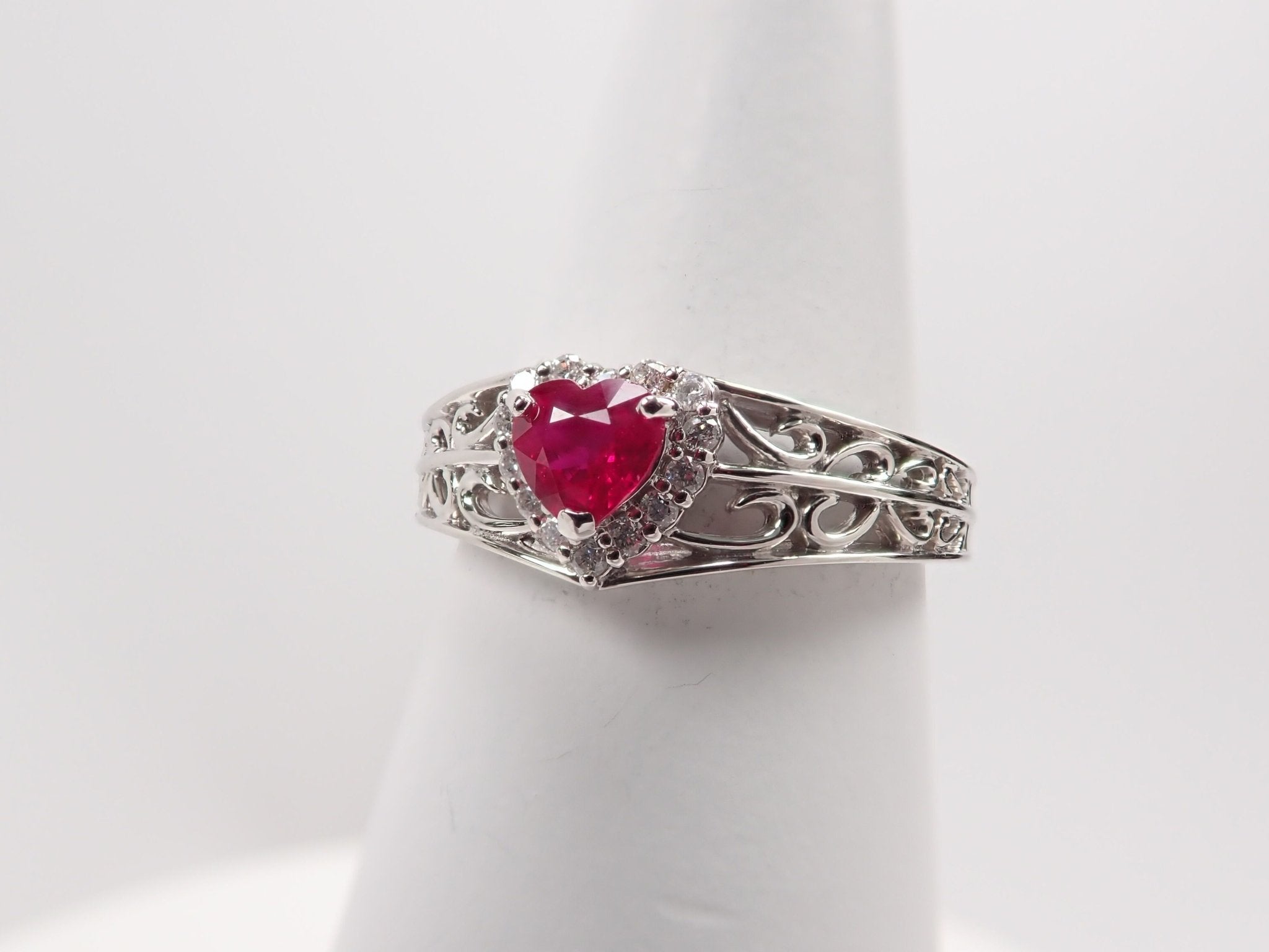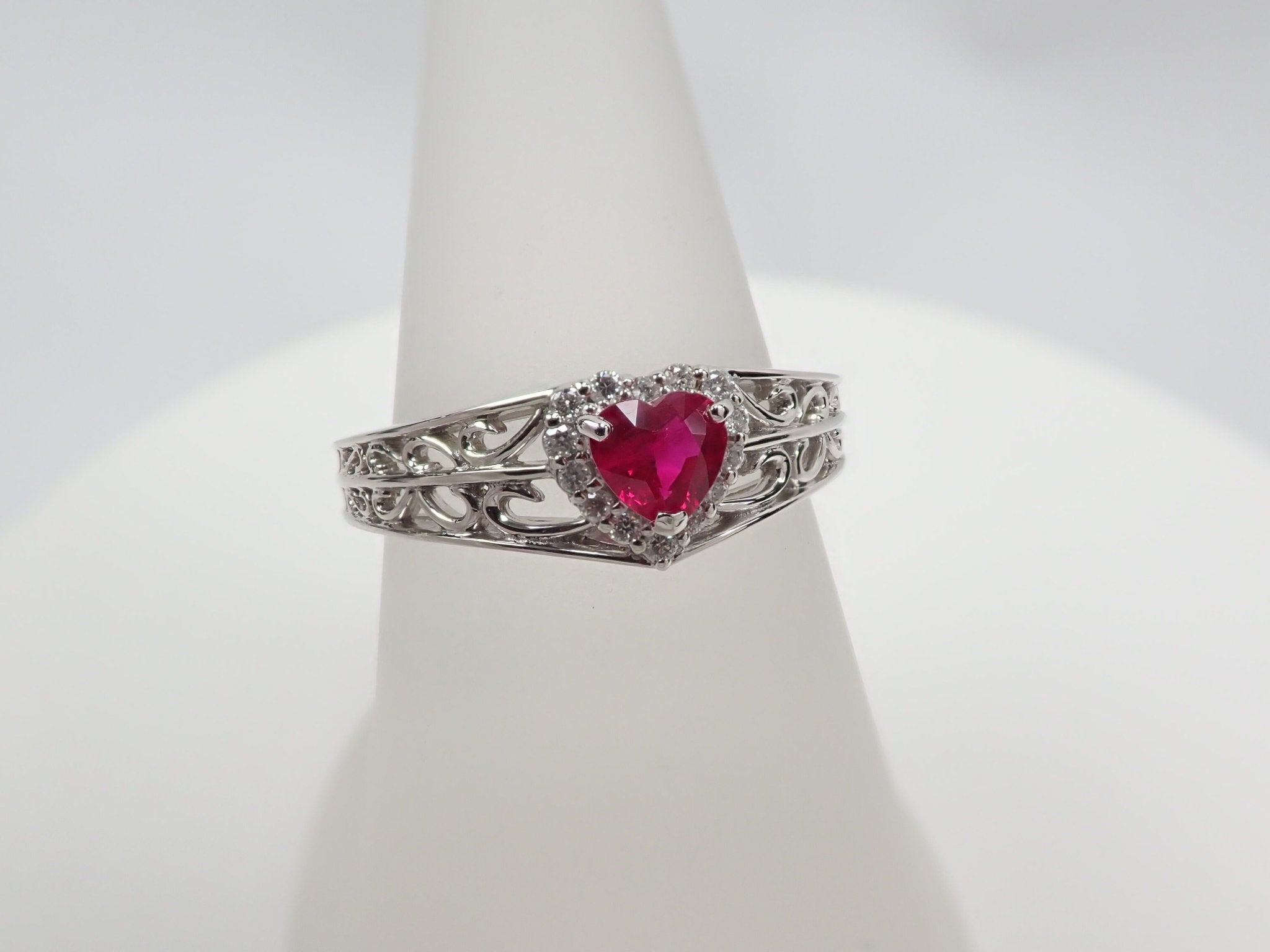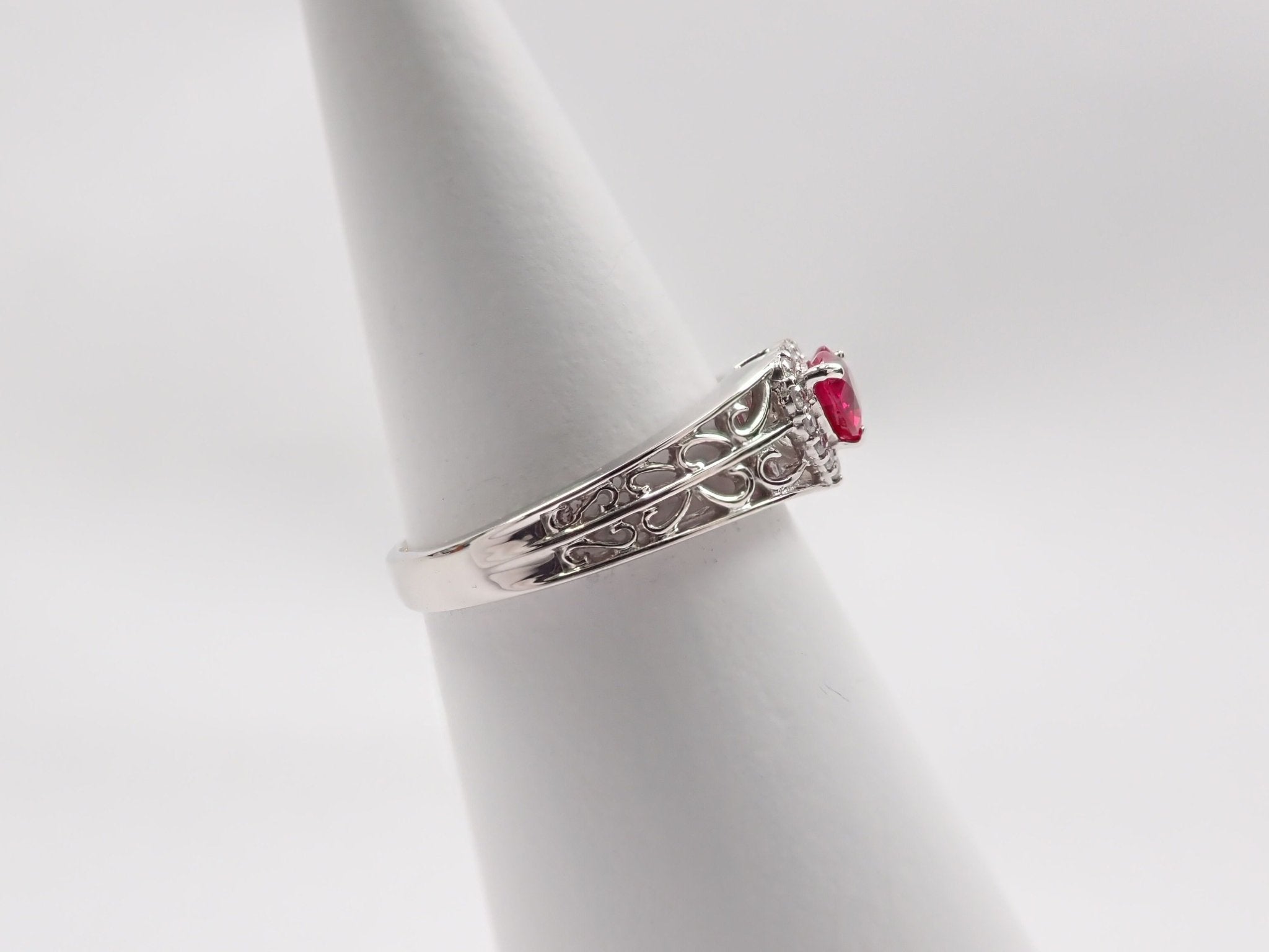中心是一顆閃閃發光的心形緬甸鴿血紅紅寶石。 Vision Blood Ruby 深厚美麗的紅色非常吸引人,讓您無法將目光從它身上移開。阿拉伯式花紋圖案和米粒鑽給人一種復古的印象。結果發現這是一枚非常可愛的戒指。 Nakaishi 紅寶石附有 GIA 真品證書。這是由鬆散的 Karatz 製成的珠寶。