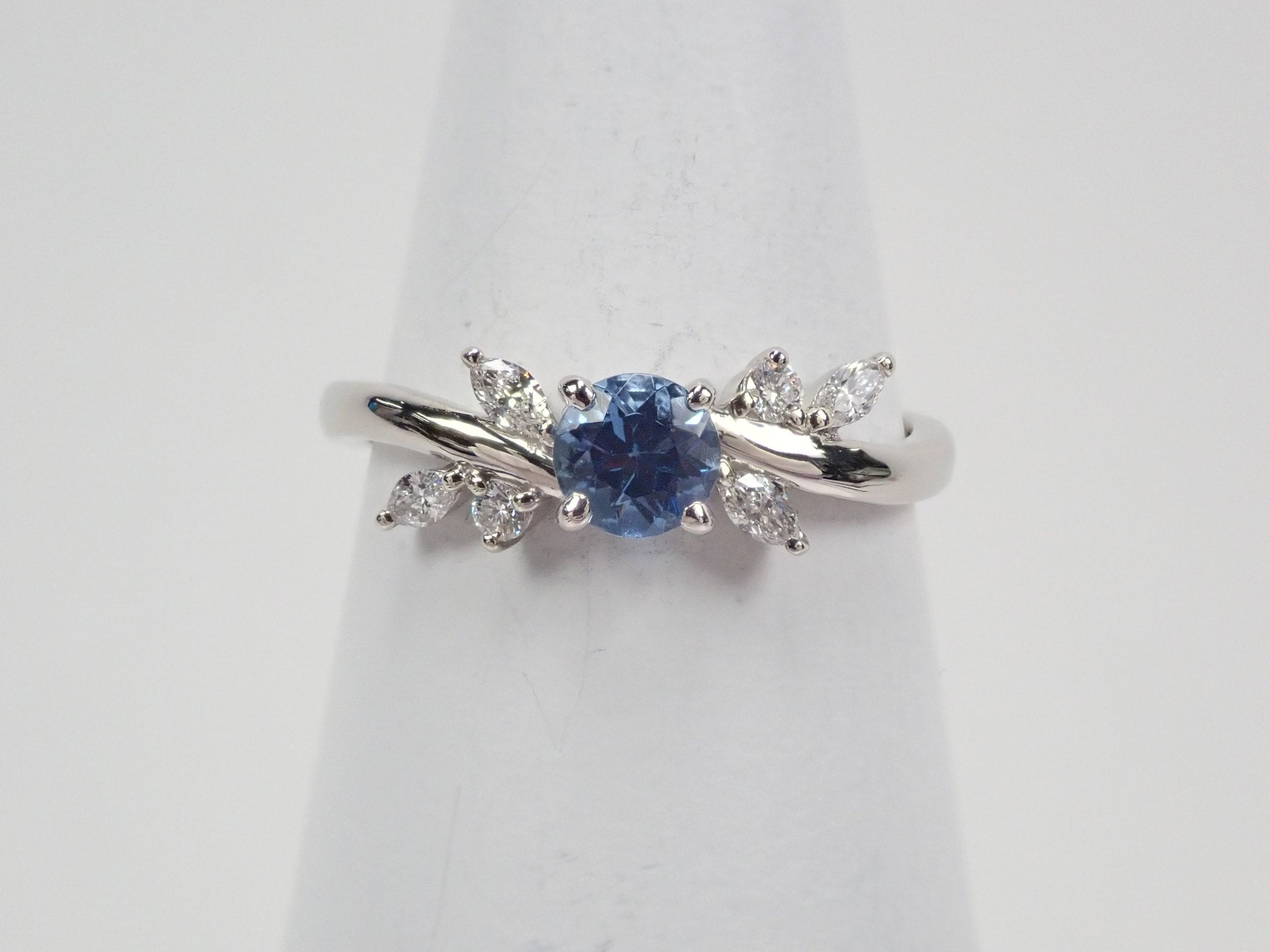 美麗的藍色讓人一見傾心,在鑲嵌的欖尖形和圓形鑽石的襯托下顯得更加璀璨奪目。