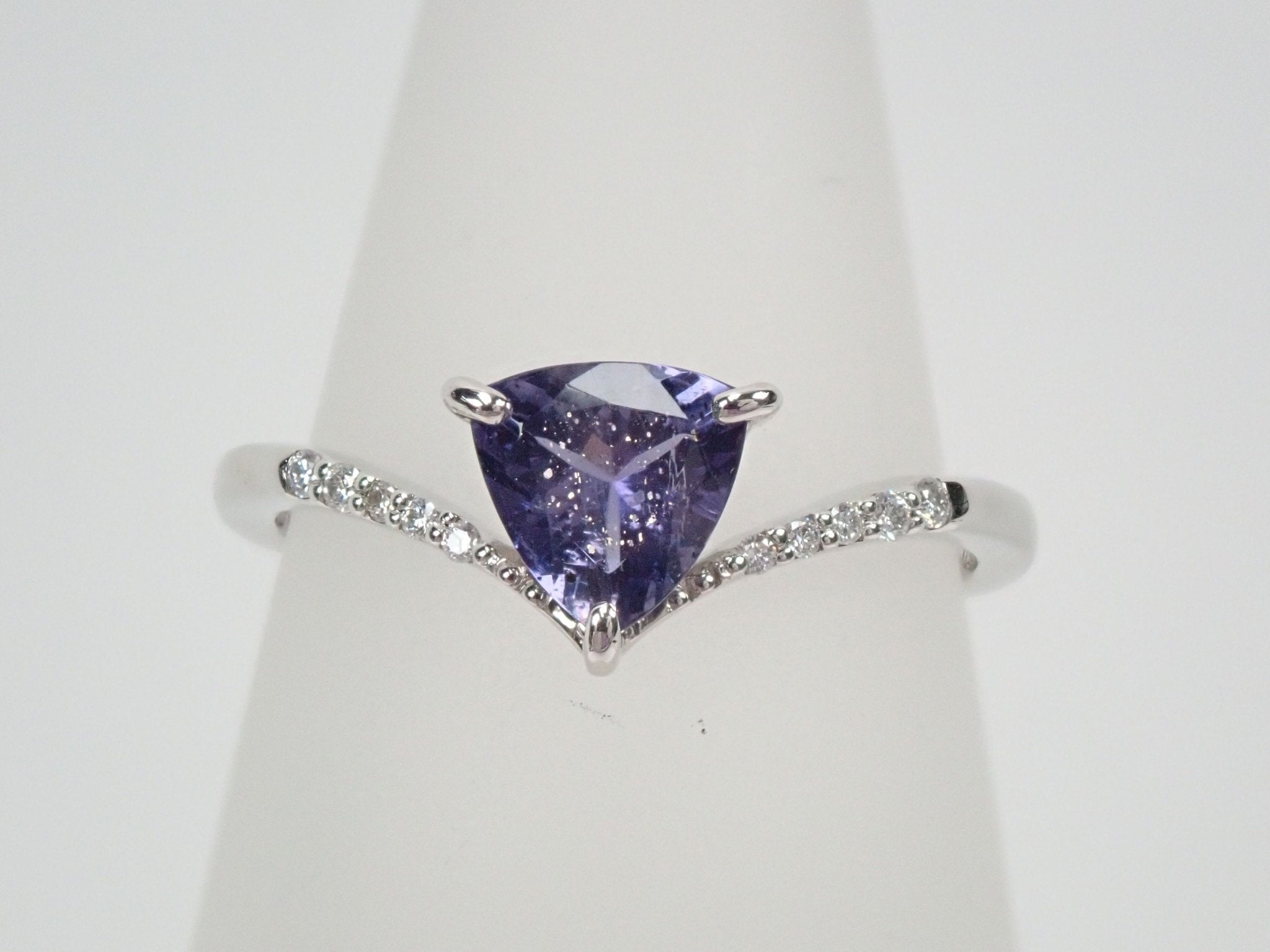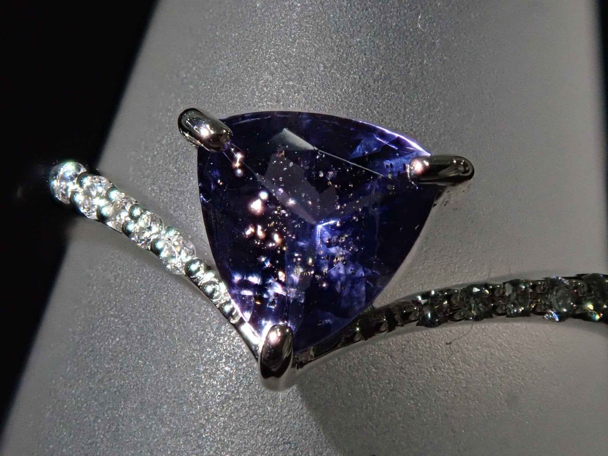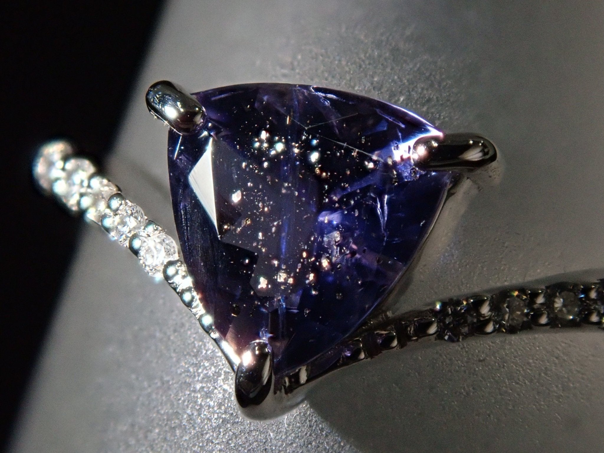 堇青石日光石戒指,V 臂和三角形切割,給人精緻華麗的印象。它深藍紫色的體色閃爍著神奇的光芒。它會給你一種彷彿在仰望夜空的浪漫感覺。