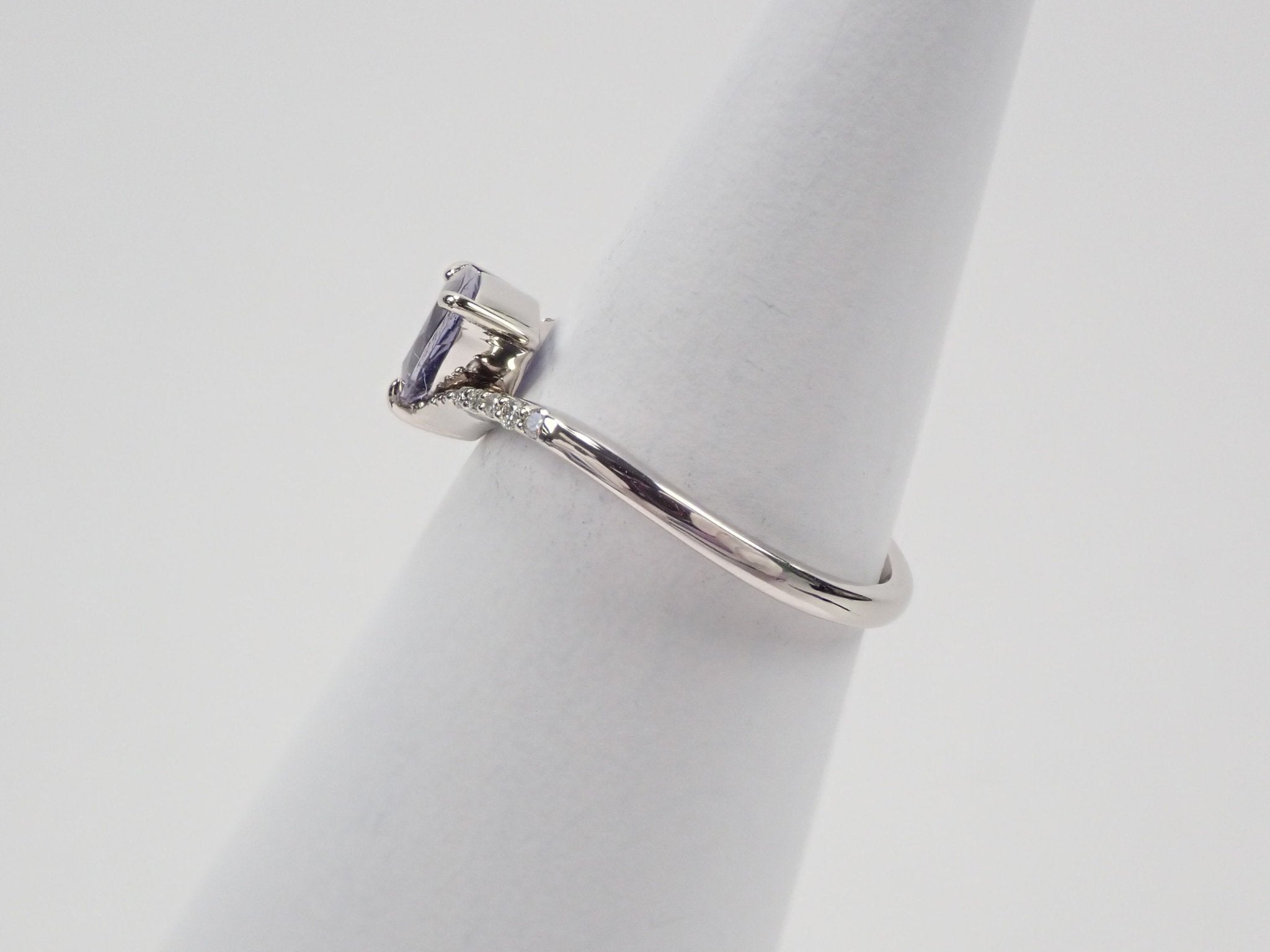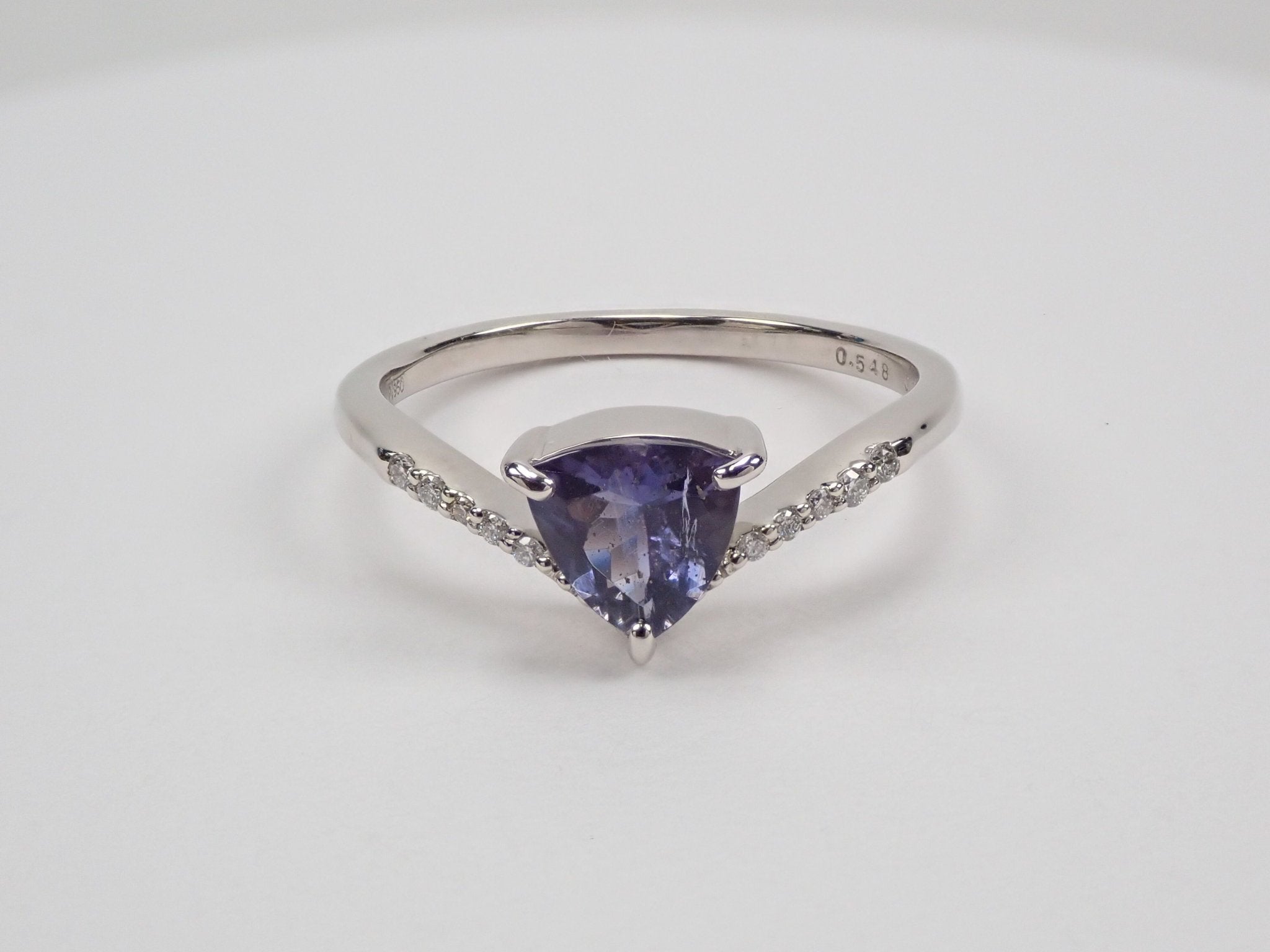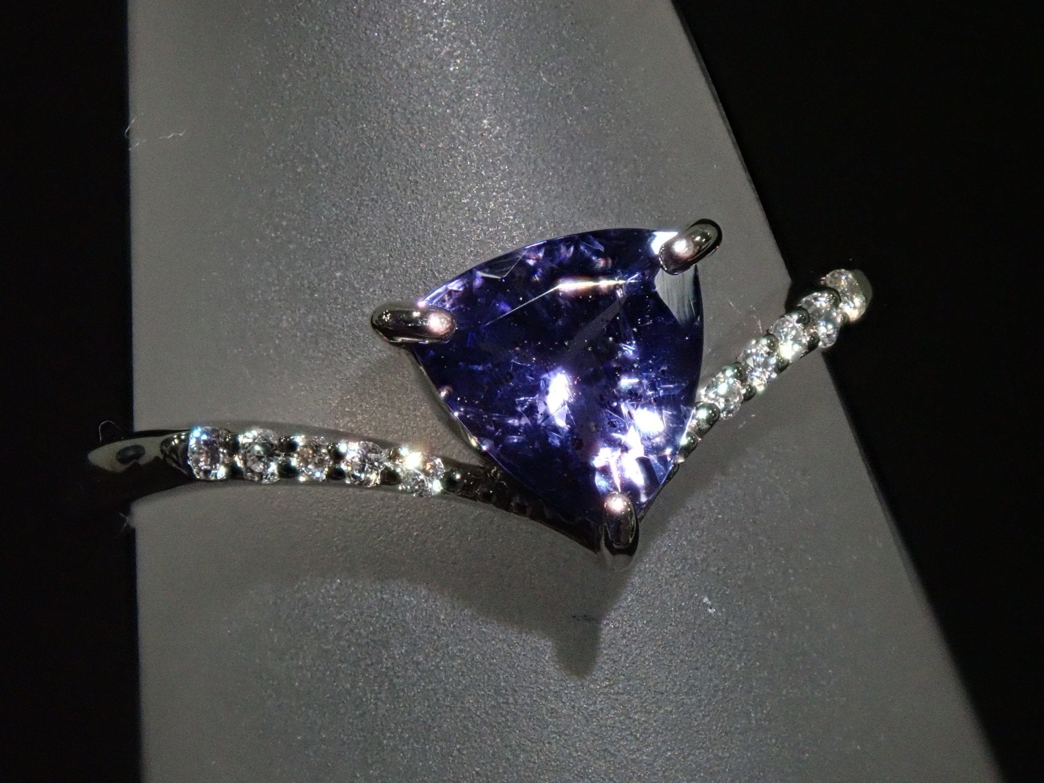 堇青石日光石戒指,V 臂和三角形切割,給人精緻華麗的印象。它深藍紫色的體色閃爍著神奇的光芒。它會給你一種彷彿在仰望夜空的浪漫感覺。