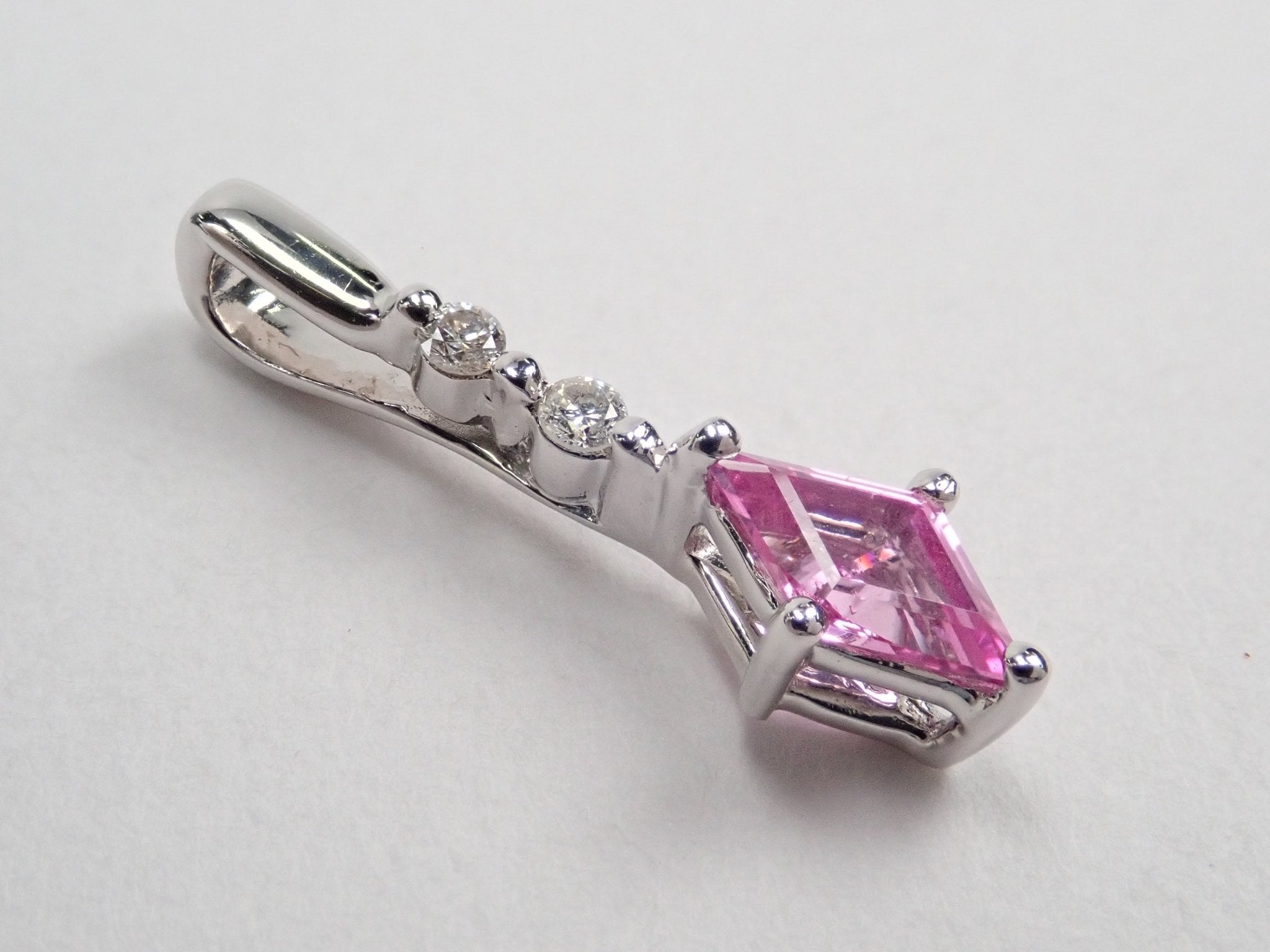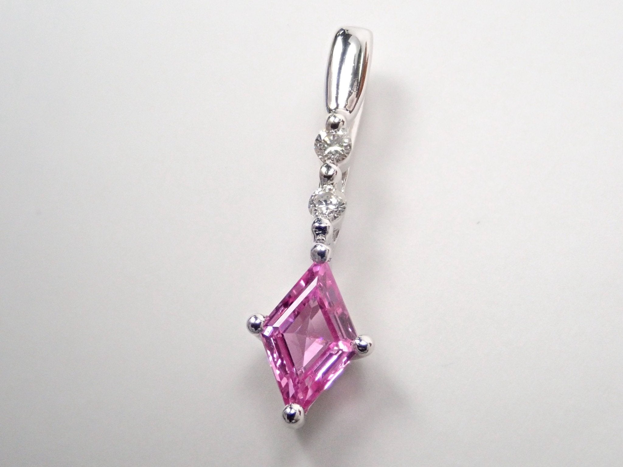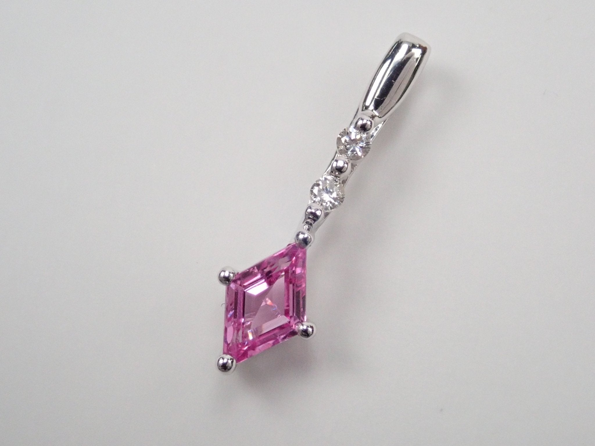 可愛的粉紅色藍寶石,會讓您心動不已。菱形切工給人一種銳利的印象,但又不會顯得過於甜美。垂直長的吊墜頭也可以用作辦公室服裝。