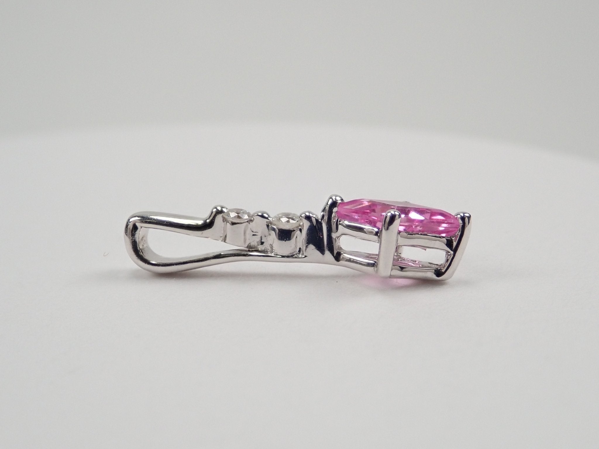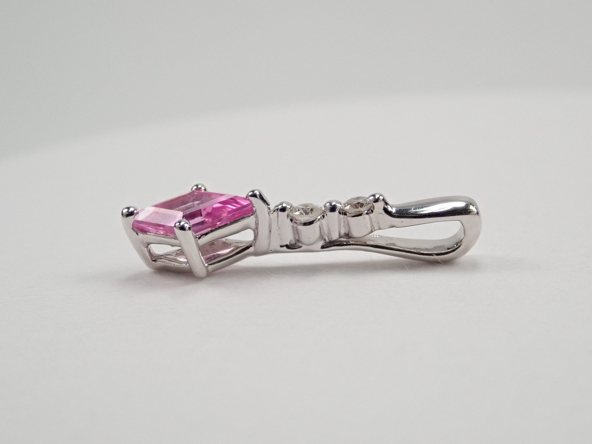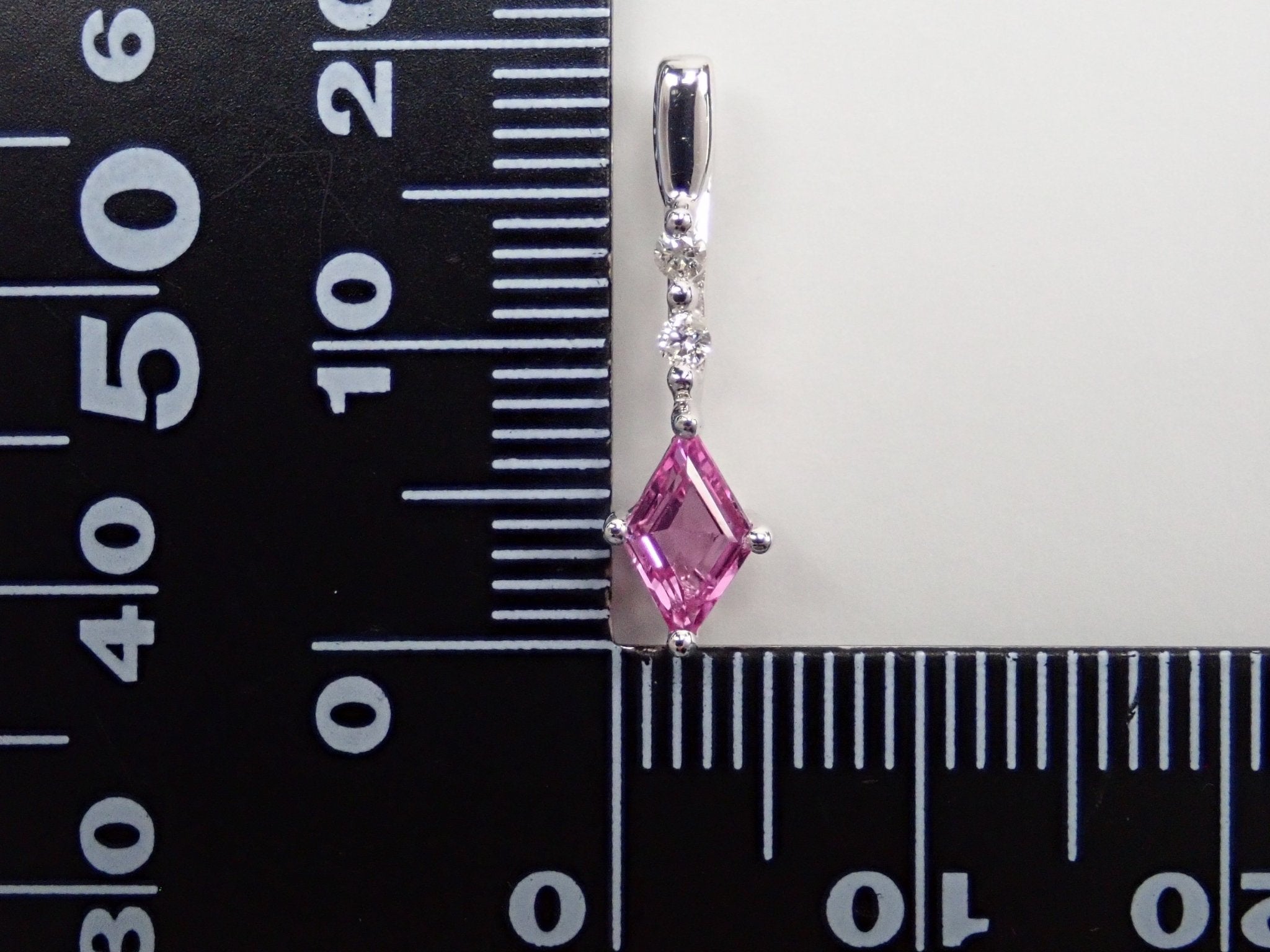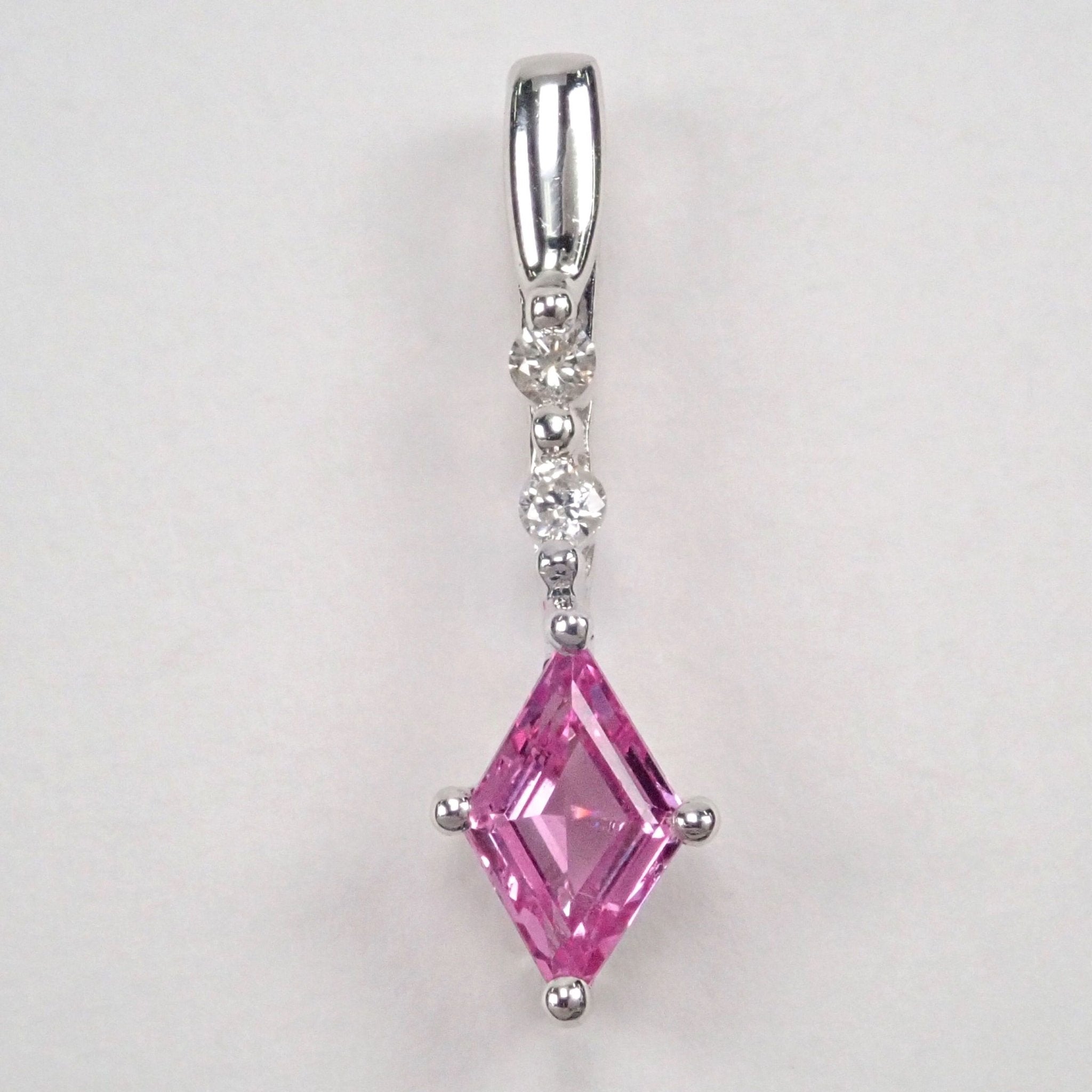 可愛的粉紅色藍寶石,會讓您心動不已。菱形切工給人一種銳利的印象,但又不會顯得過於甜美。垂直長的吊墜頭也可以用作辦公室服裝。