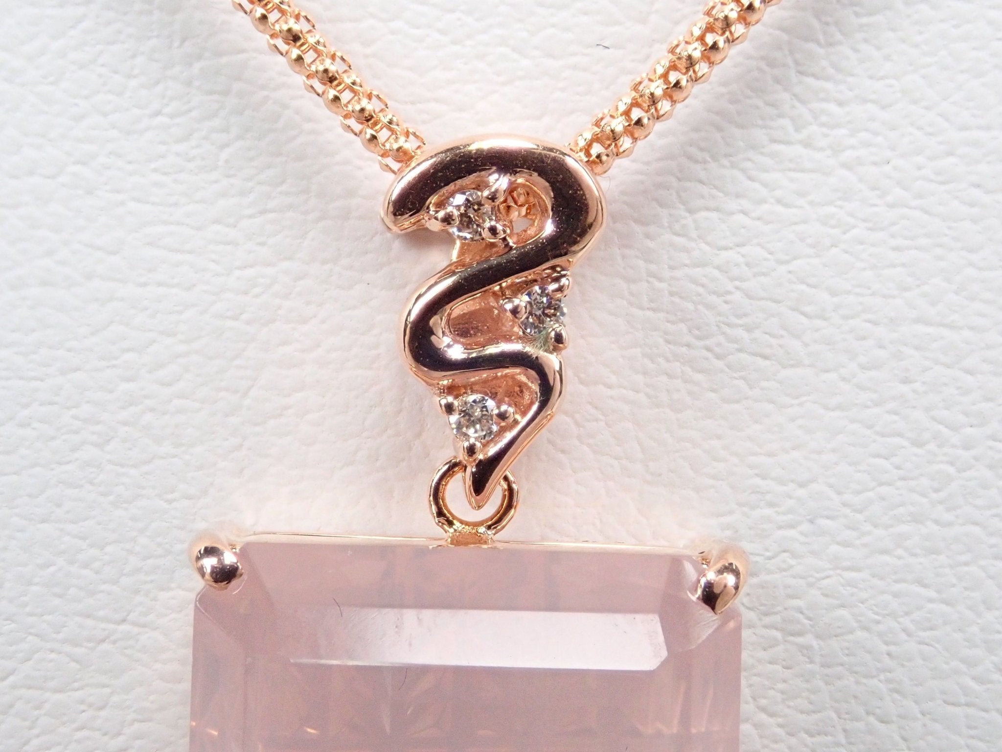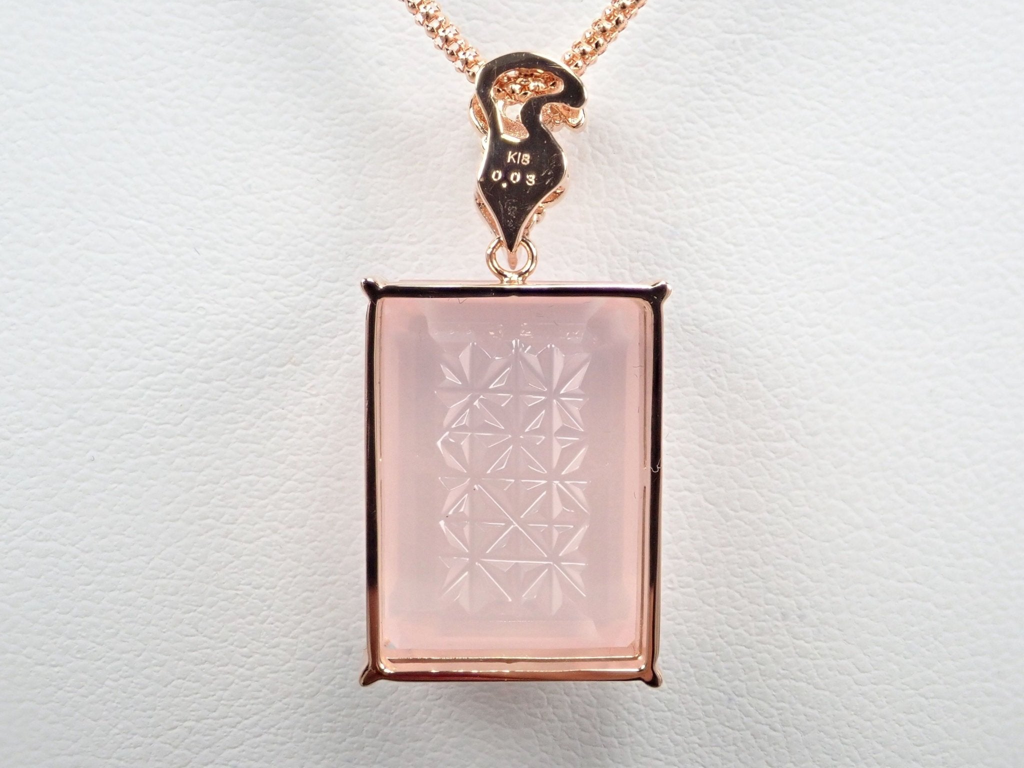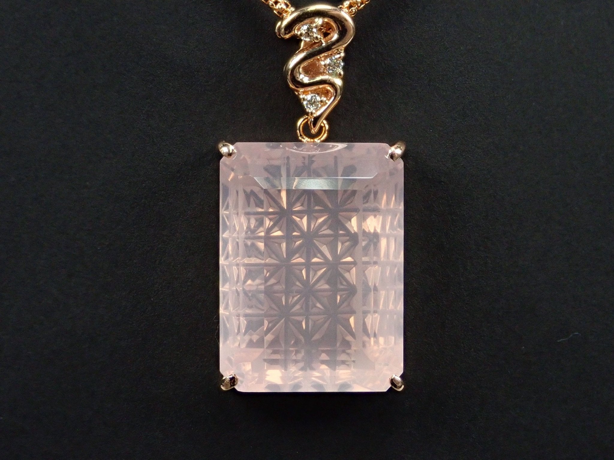 這款18K玫瑰石英項鍊鑲嵌甲州切子(Koshu Kiriko)和玫瑰石英。這顆11克拉的大玫瑰石英切割優雅流暢,柔和的粉紅色與玫瑰金完美融合。吊墜上鑲嵌一顆鑽石,鏈條為堅固的桑葚鏈,足以支撐頂部。這是一款精心製作的吊墜。盡情欣賞其精雕細琢的線條。