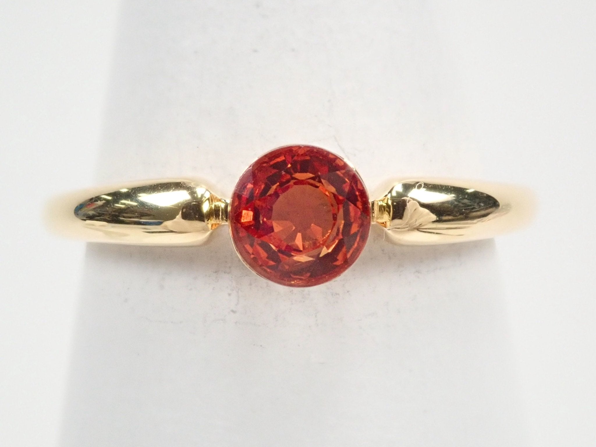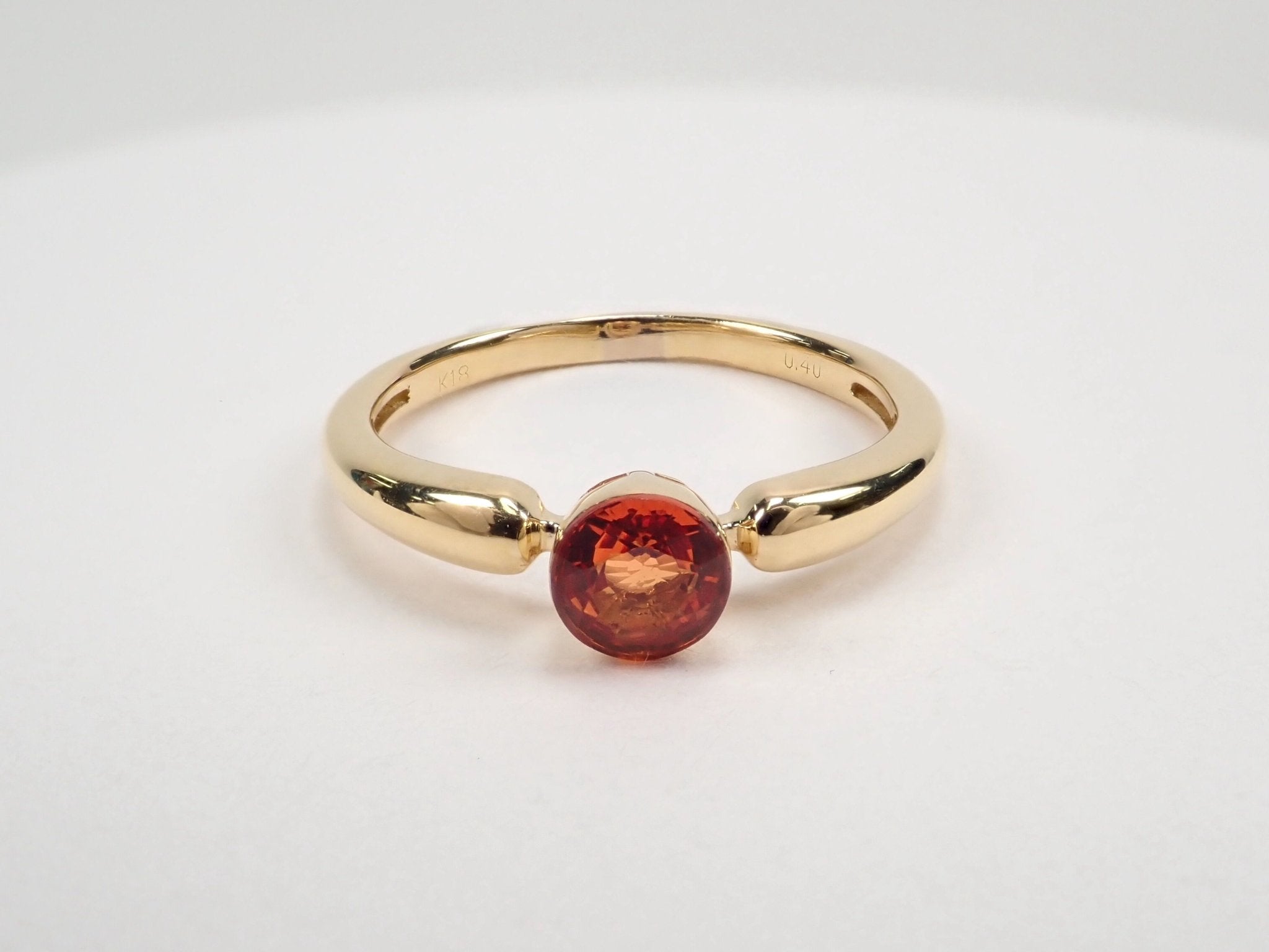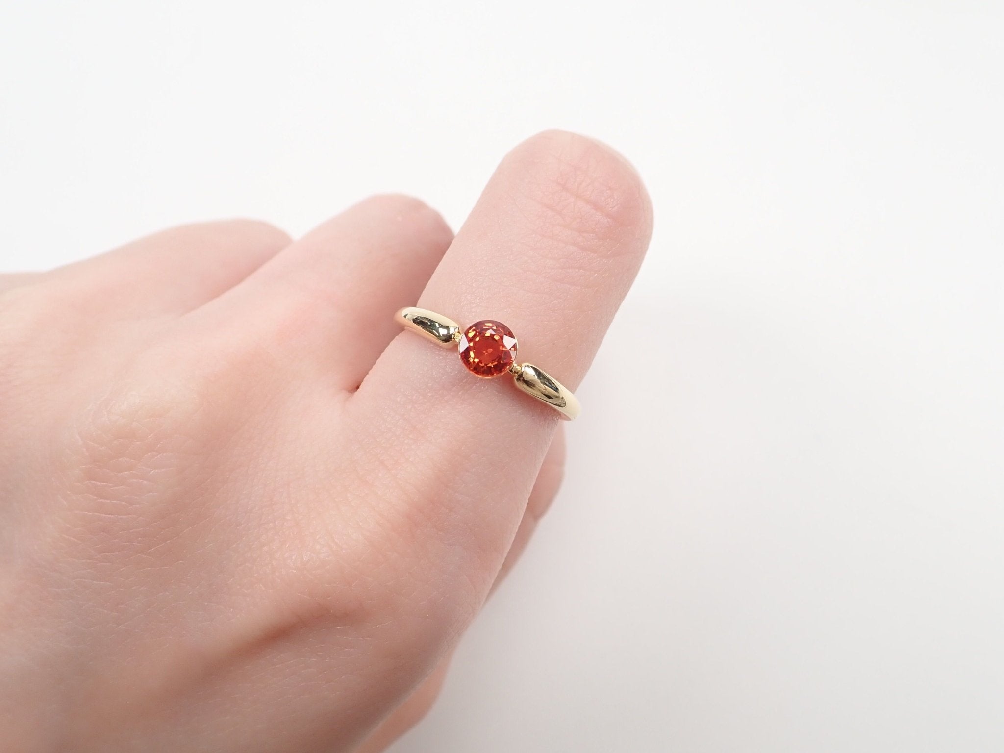 橘子石榴石戒指。略帶黃橙色的石榴石被稱為柑橘石榴石,其新鮮、濃鬱的橙色顏色與柑橘的果實一模一樣。寬鬆的封口使其看起來就像一顆橘子石榴石漂浮在黃金框架的中間。