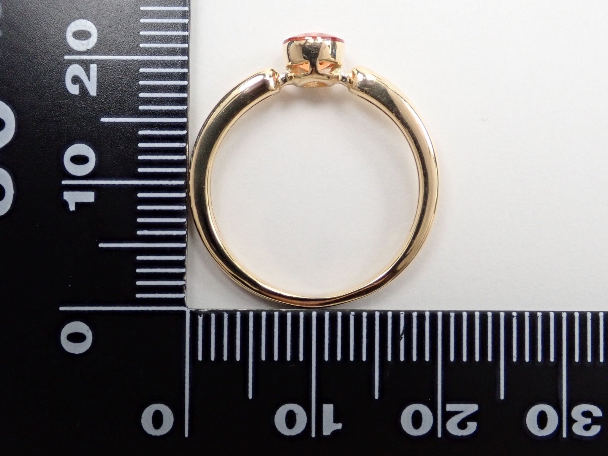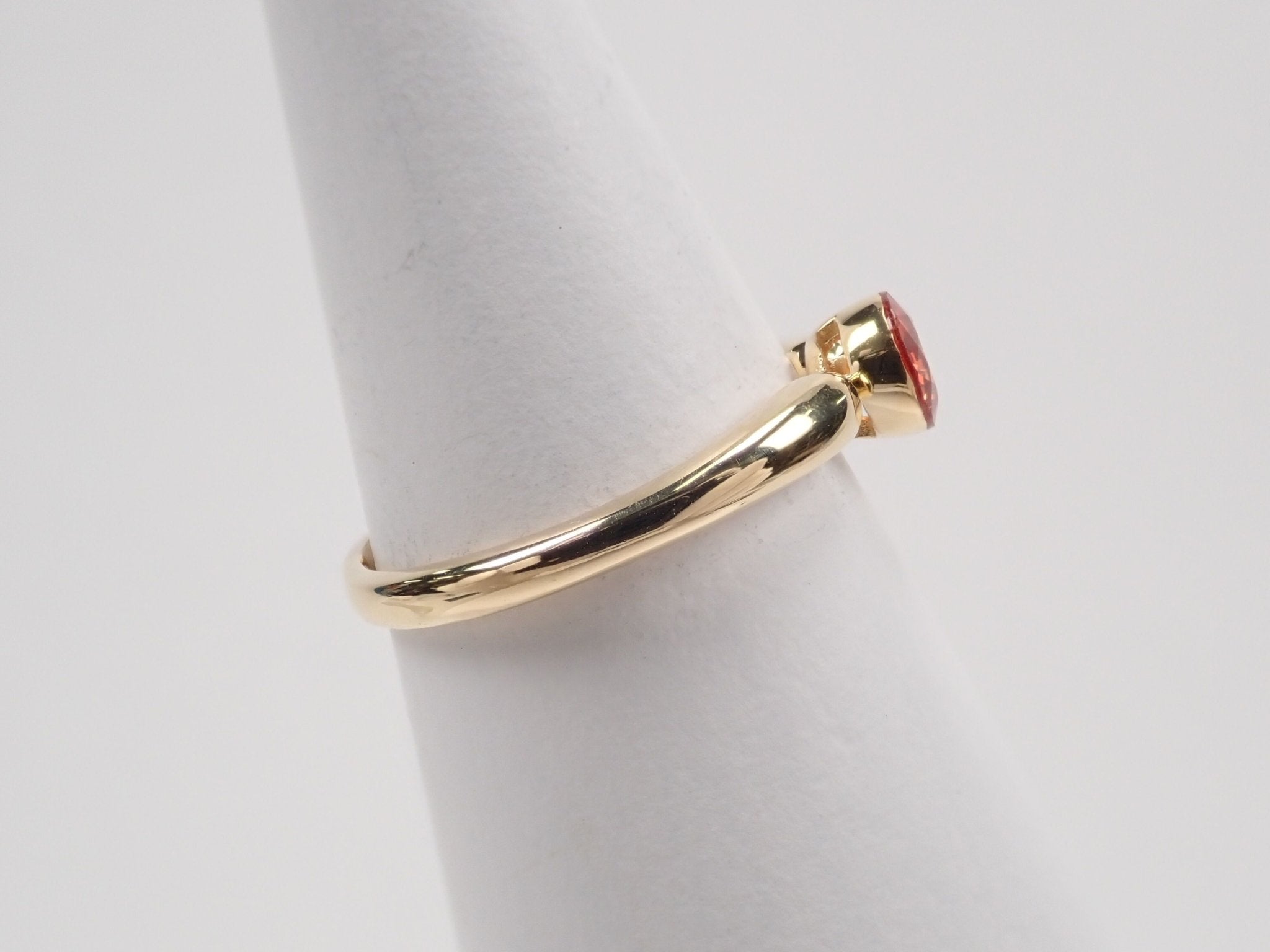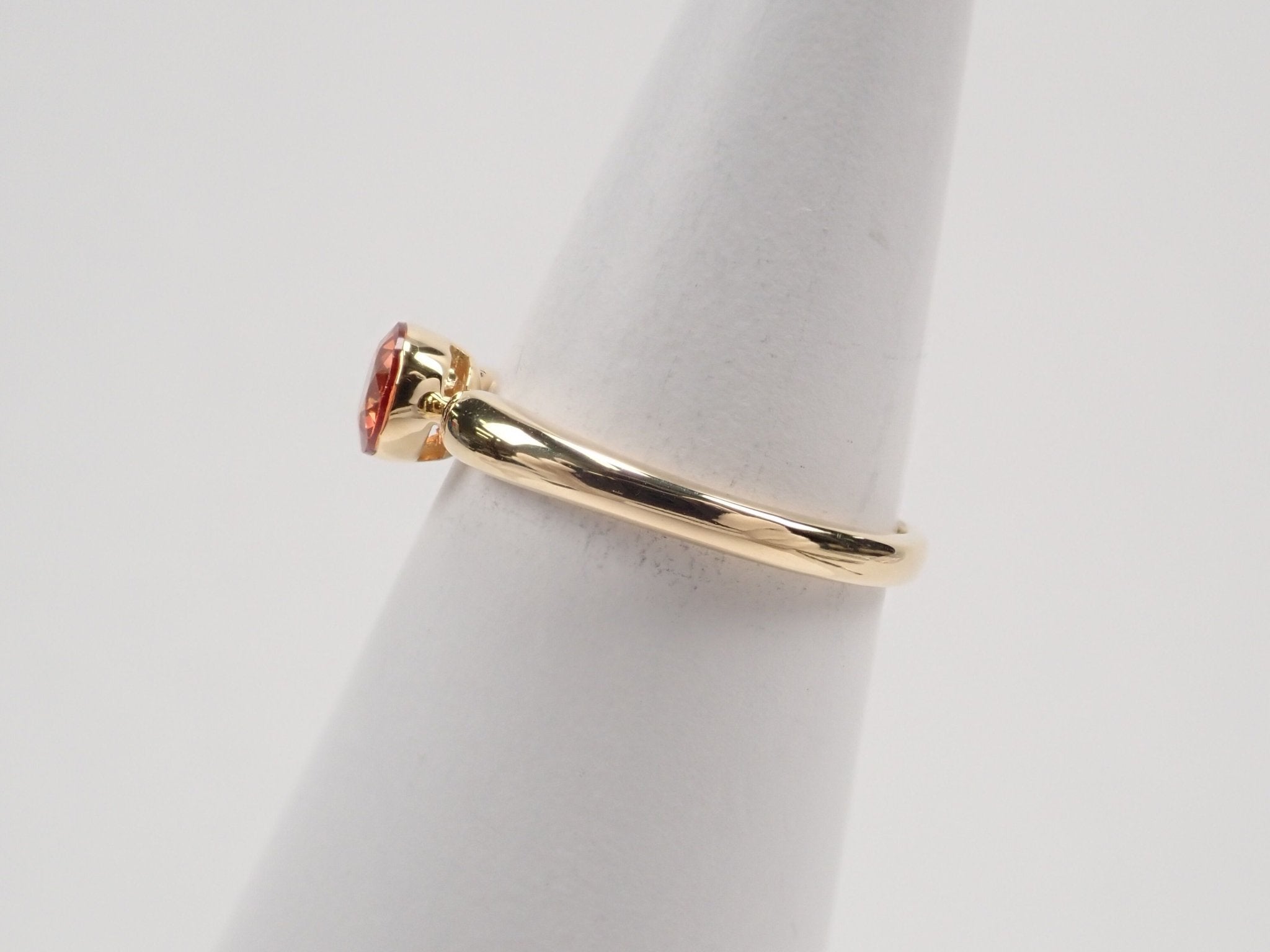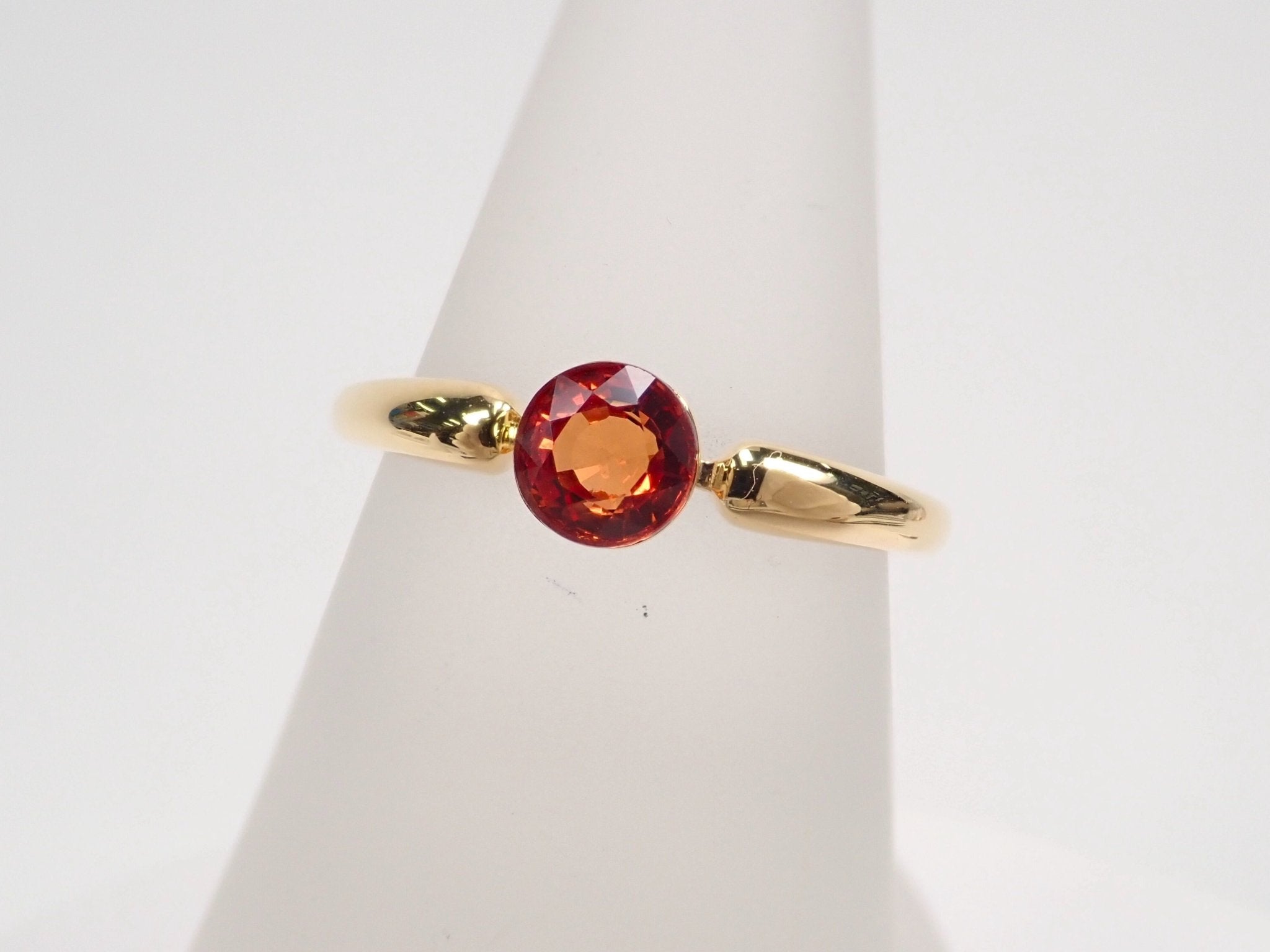 橘子石榴石戒指。略帶黃橙色的石榴石被稱為柑橘石榴石,其新鮮、濃鬱的橙色顏色與柑橘的果實一模一樣。寬鬆的封口使其看起來就像一顆橘子石榴石漂浮在黃金框架的中間。
