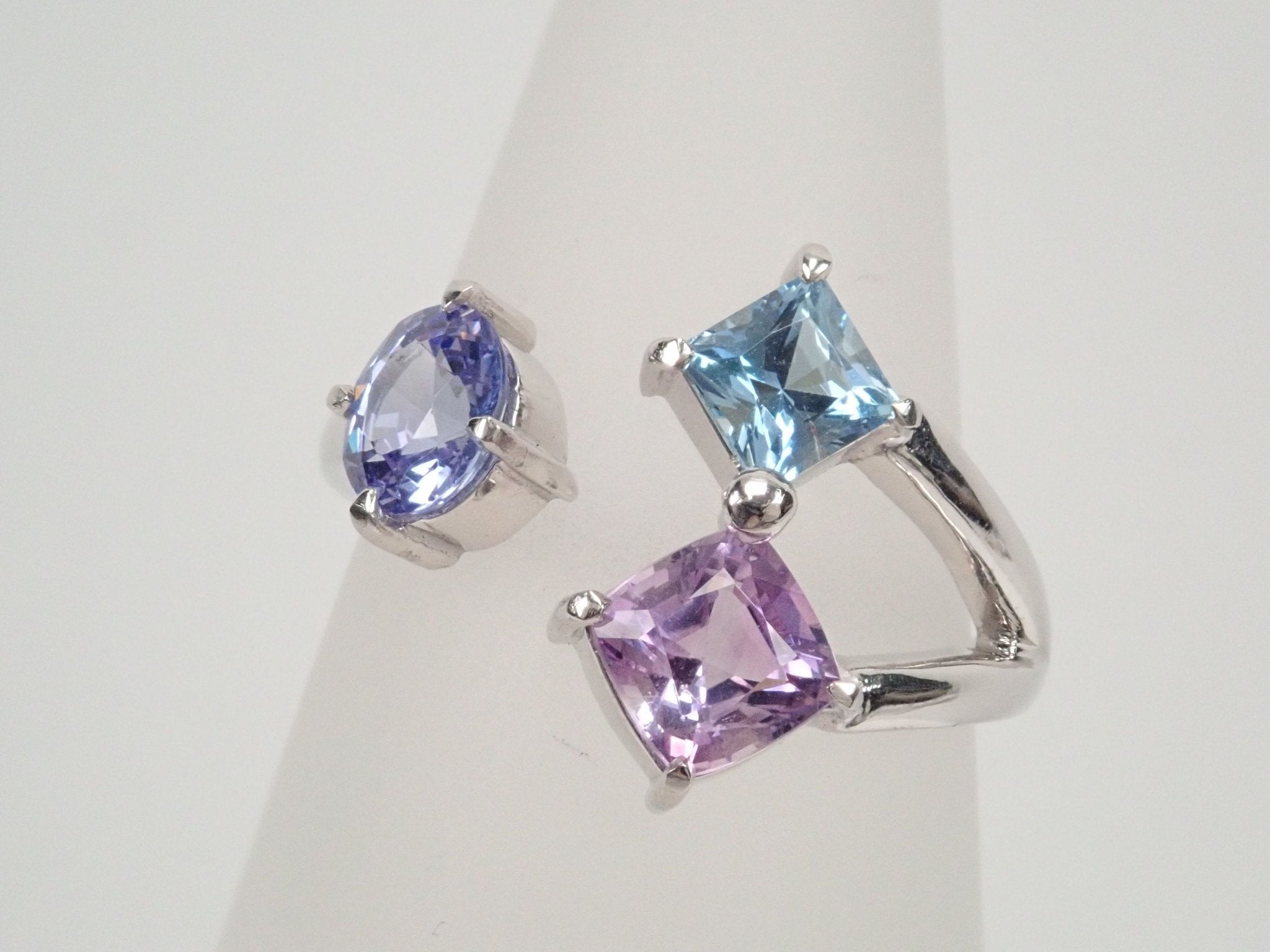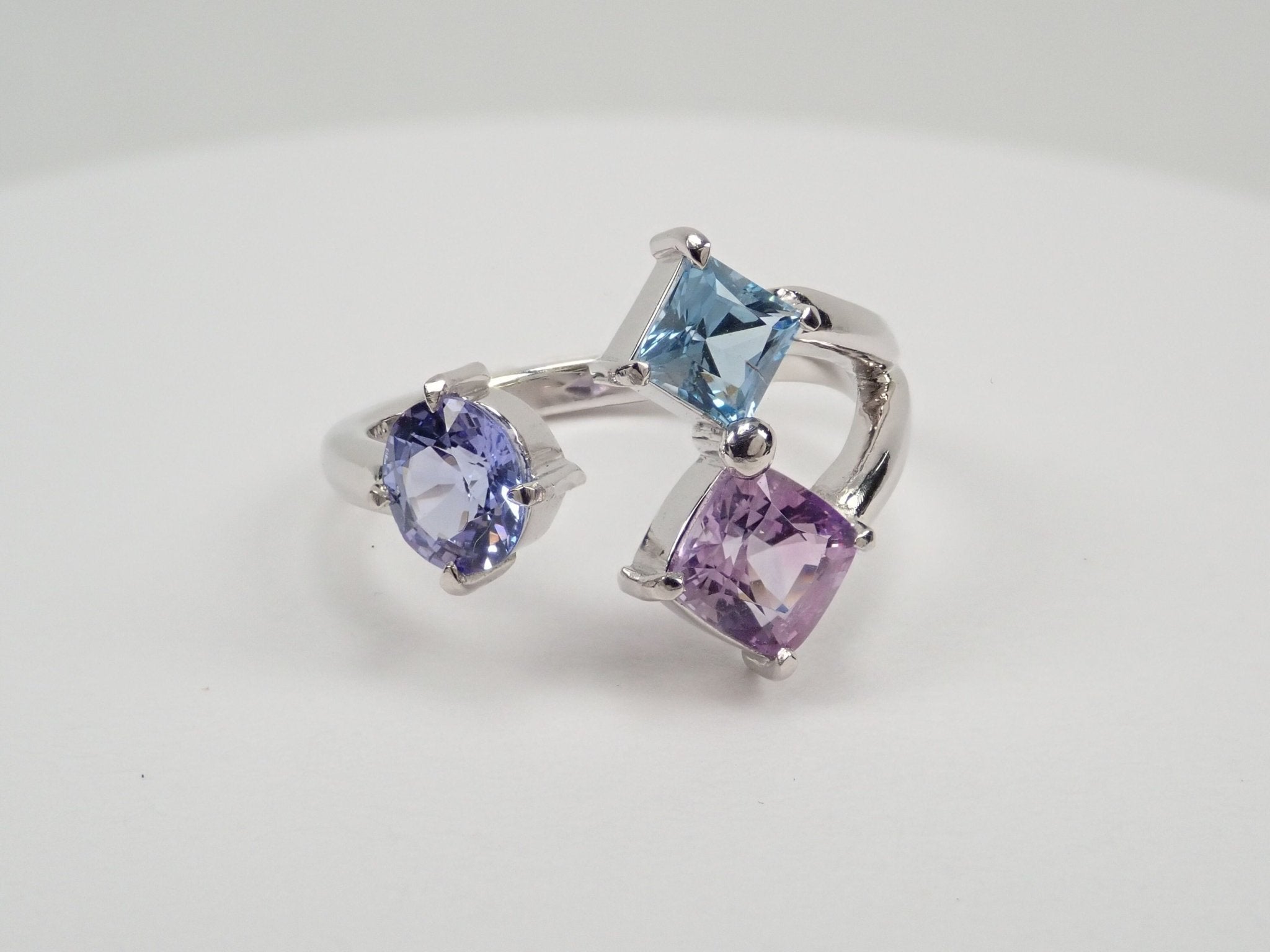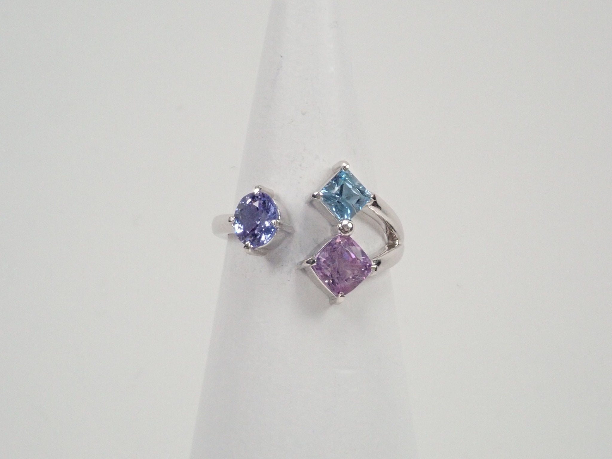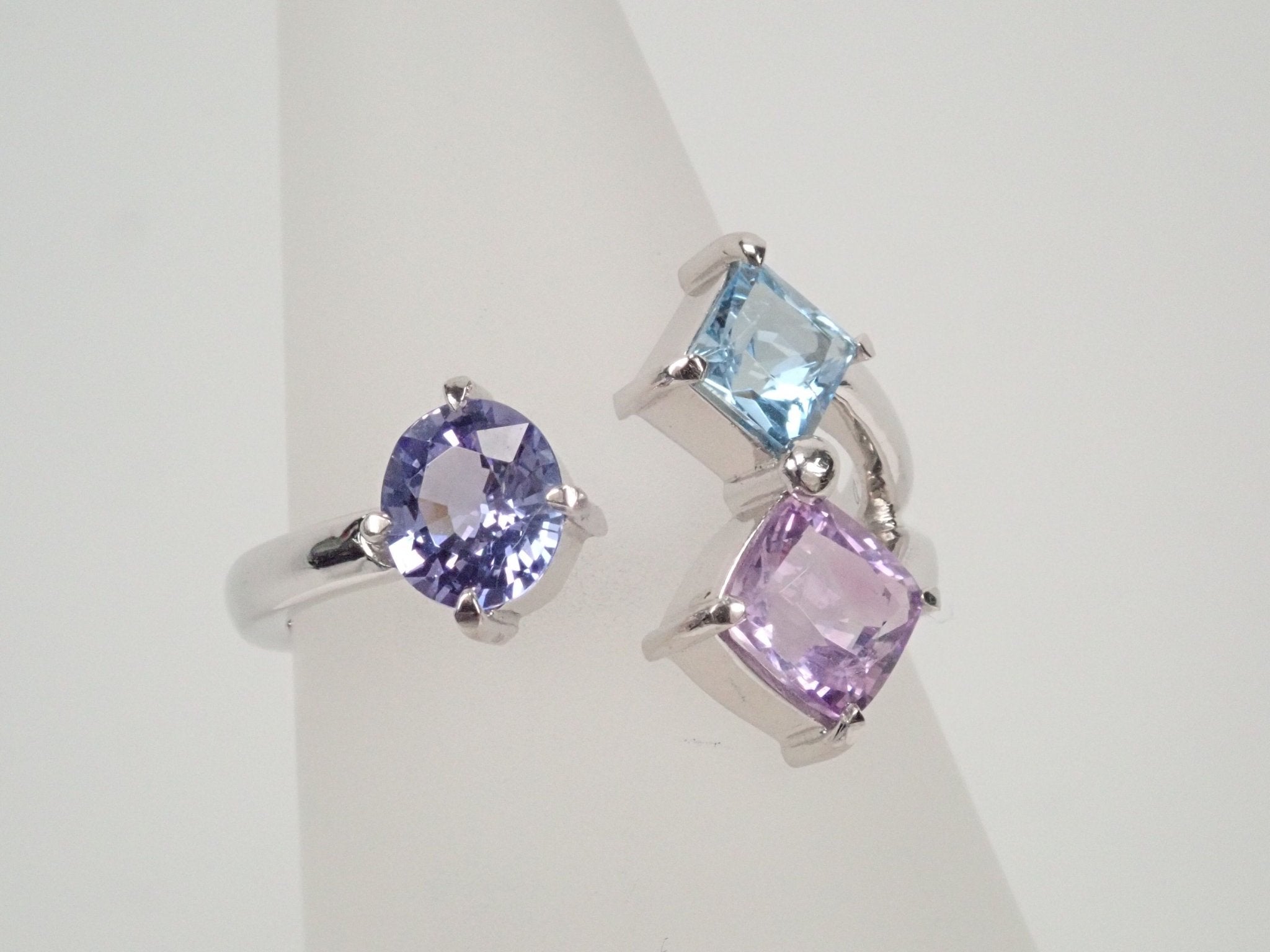淡藍色寶石有各種形狀和尺寸,展現出各自的個性。移動手臂上隨意鑲嵌的寶石,就像流星在夜空中美麗地舞動!也許你的願望會實現。這是一枚由散裝克拉製成的原創戒指。