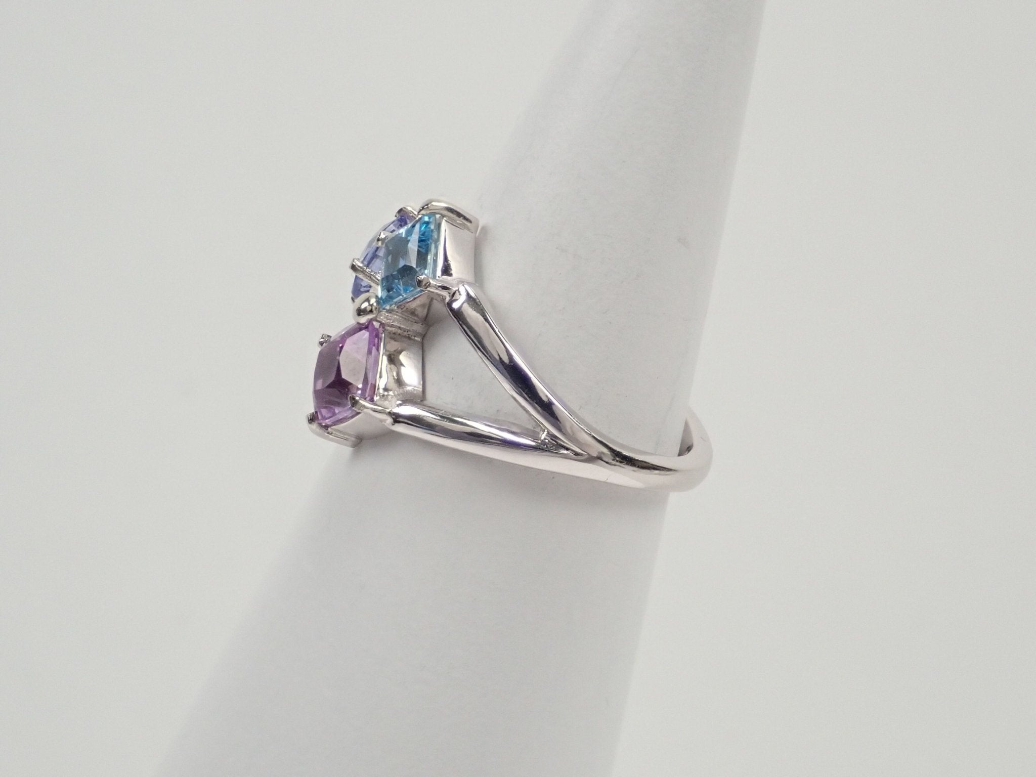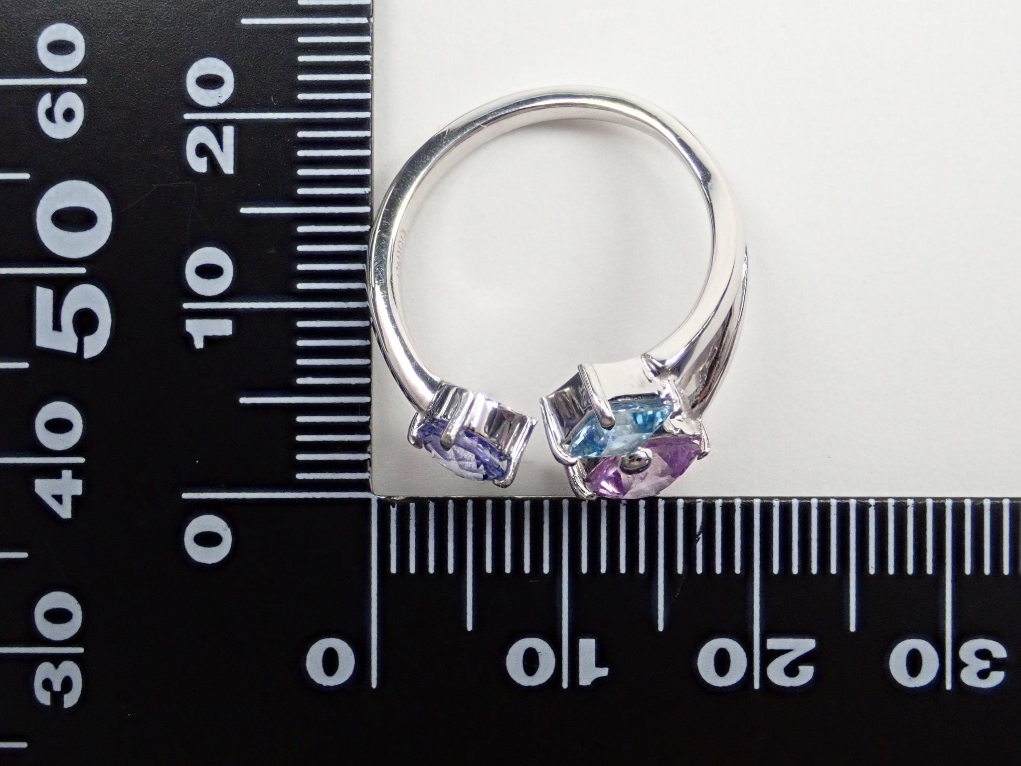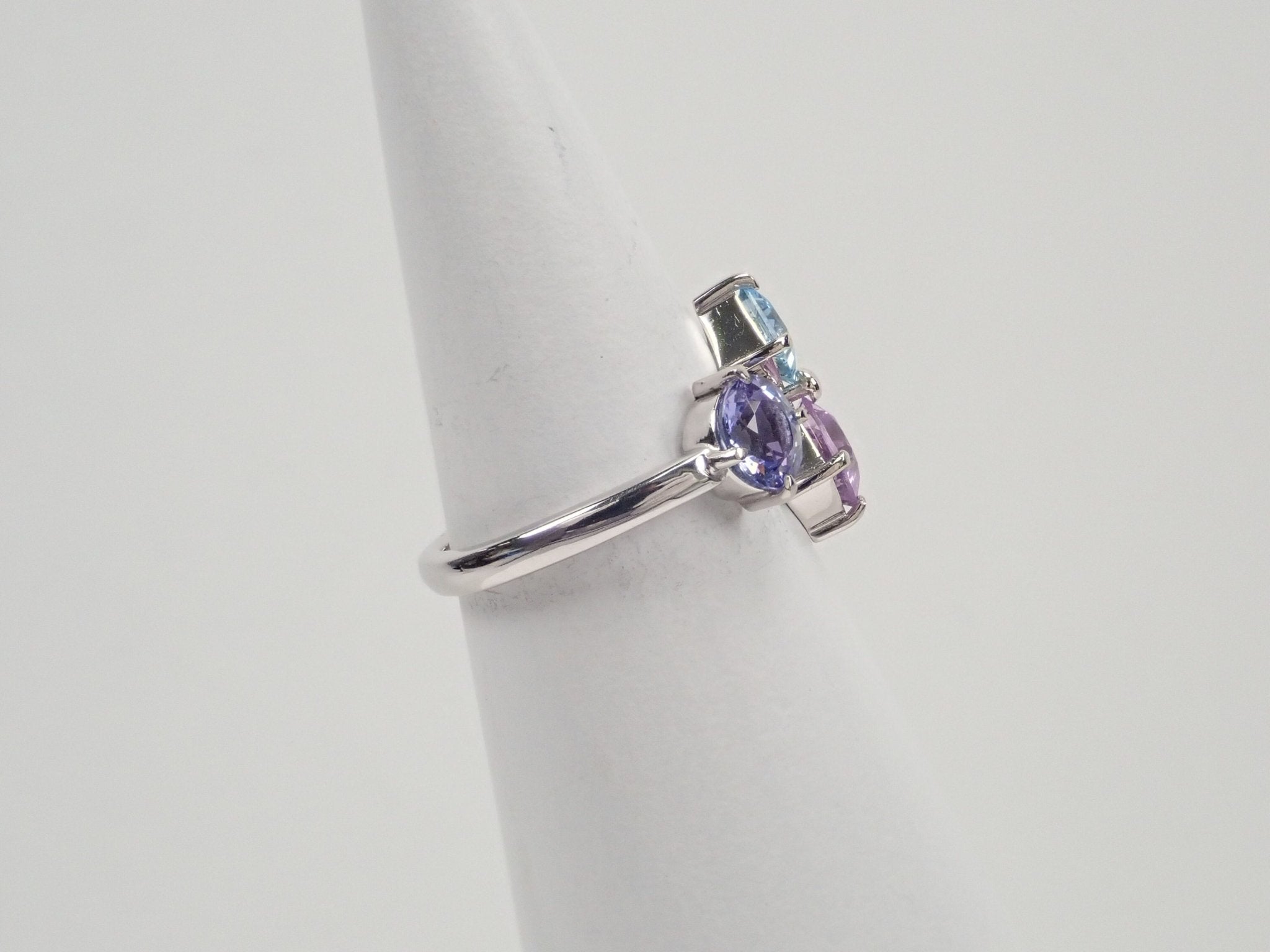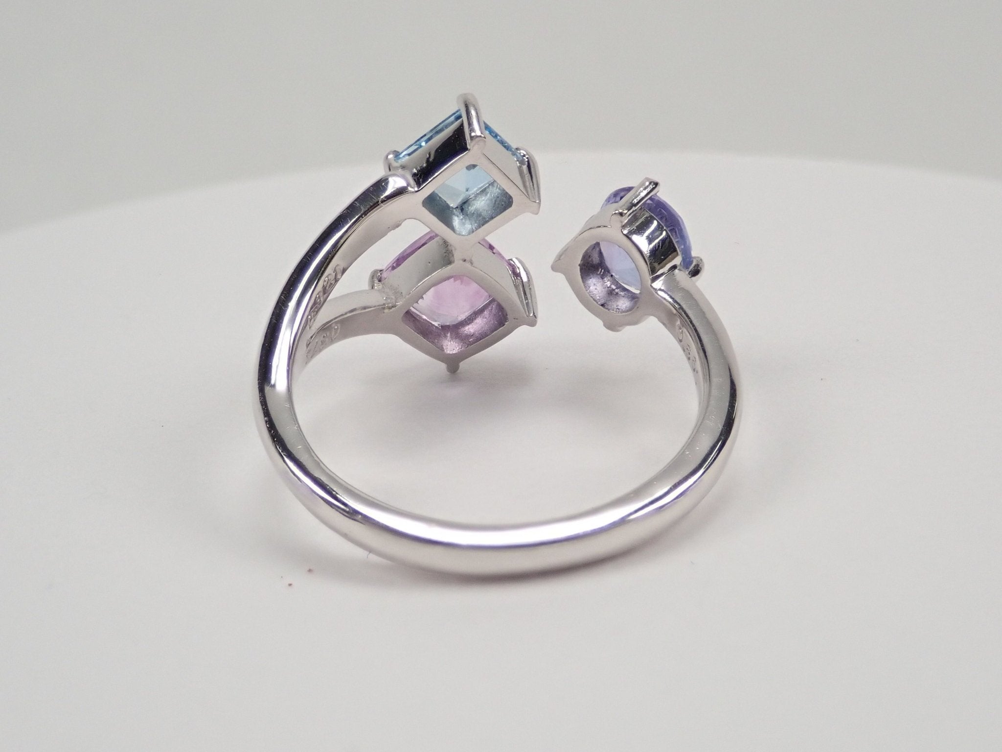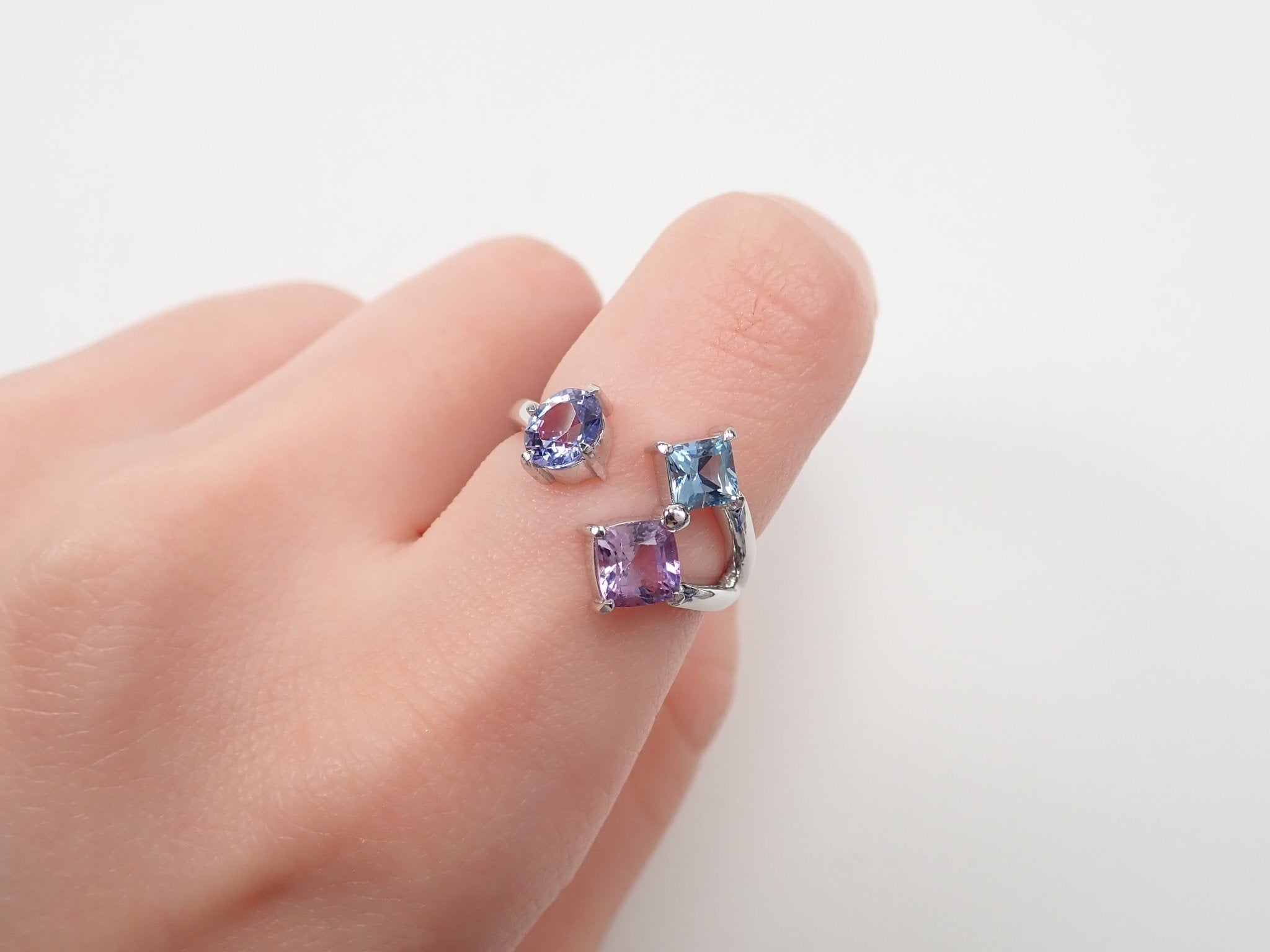 淡藍色寶石有各種形狀和尺寸,展現出各自的個性。移動手臂上隨意鑲嵌的寶石,就像流星在夜空中美麗地舞動!也許你的願望會實現。這是一枚由散裝克拉製成的原創戒指。