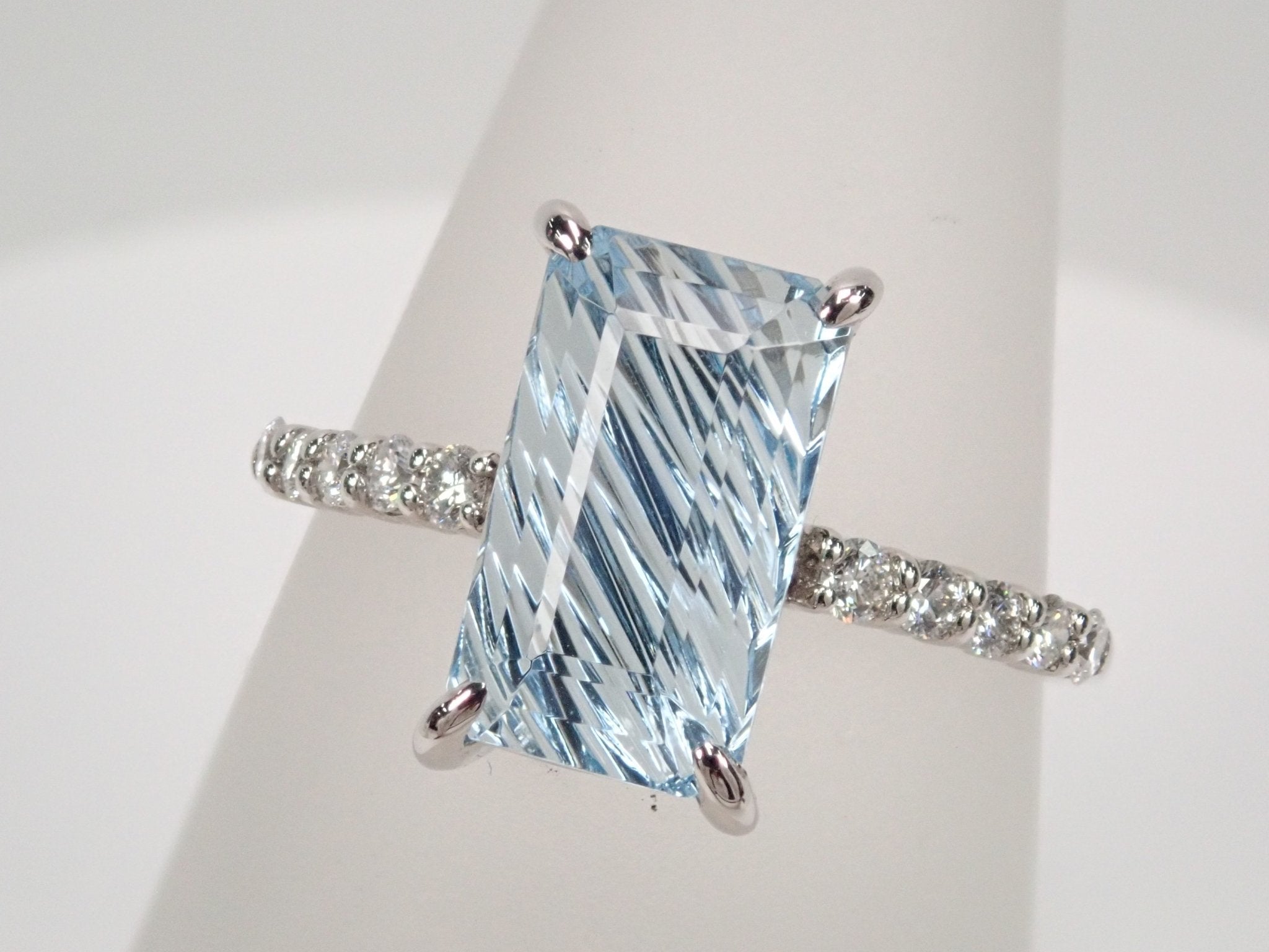 甲州寶石切割玻璃海藍寶石戒指。精緻的剪裁與清涼的海藍寶石色相得益彰。手臂部分鑲有VS~SI級鑽石,閃閃發光。 。方形的海藍寶石也清新美妙。