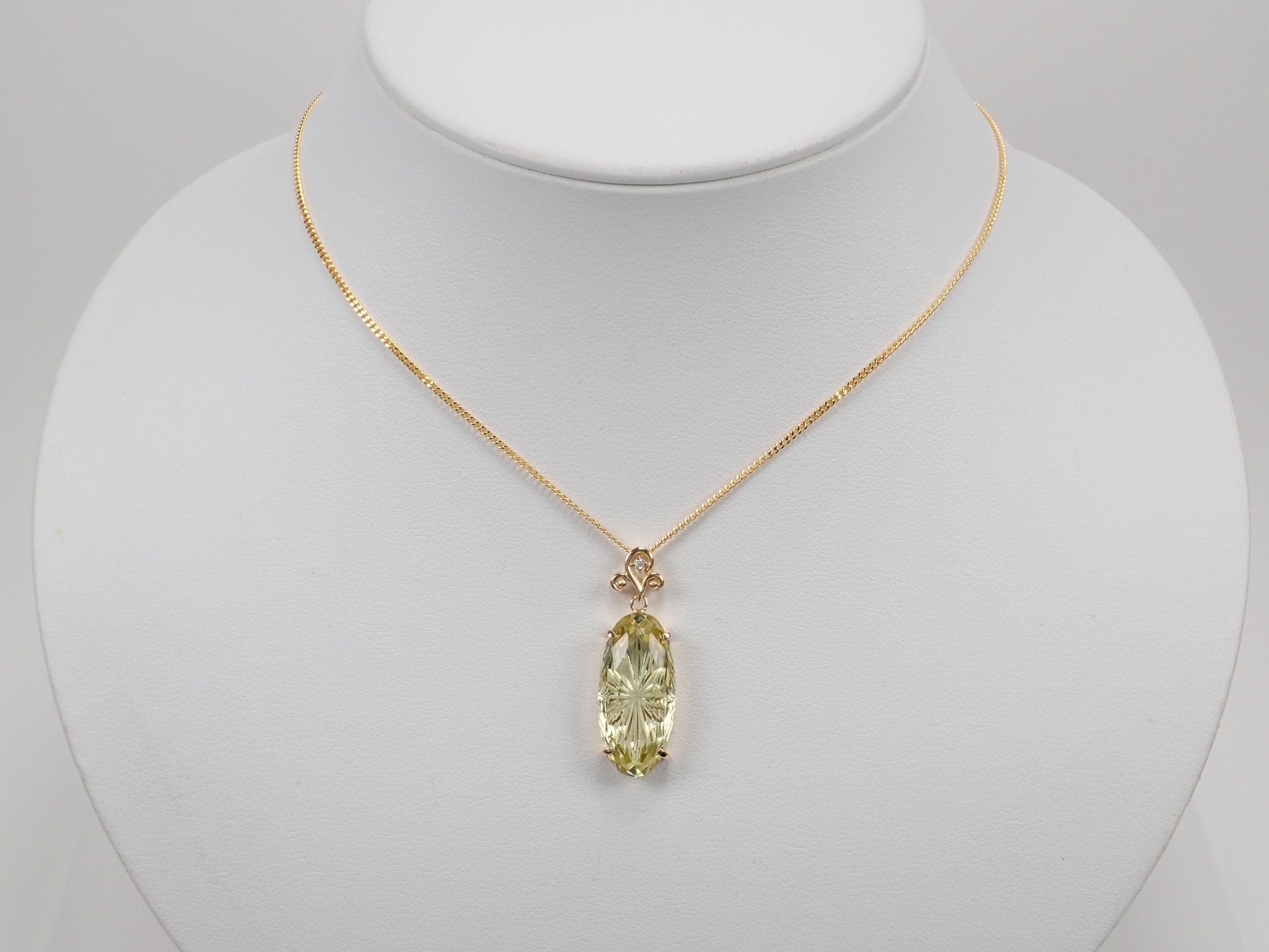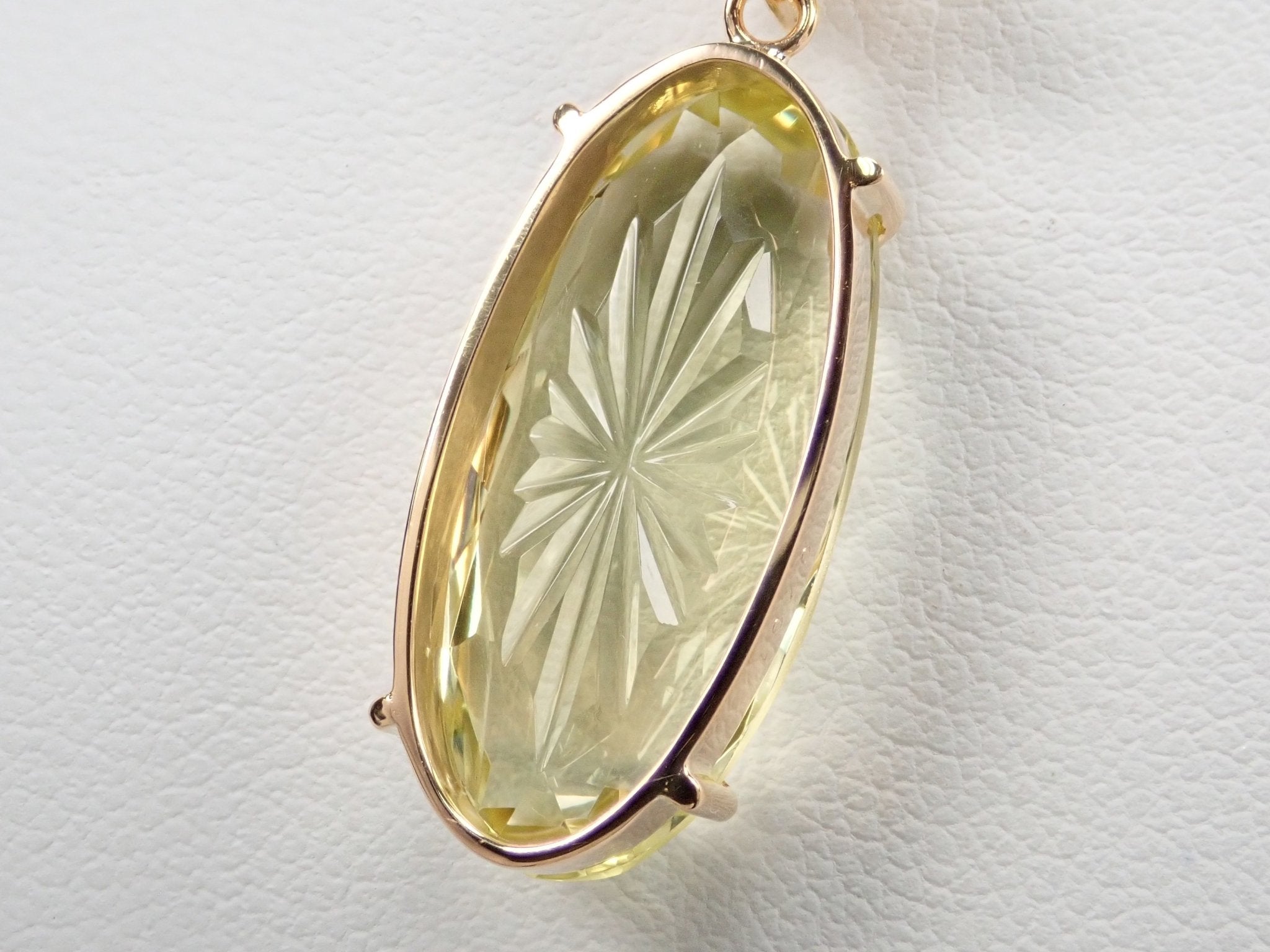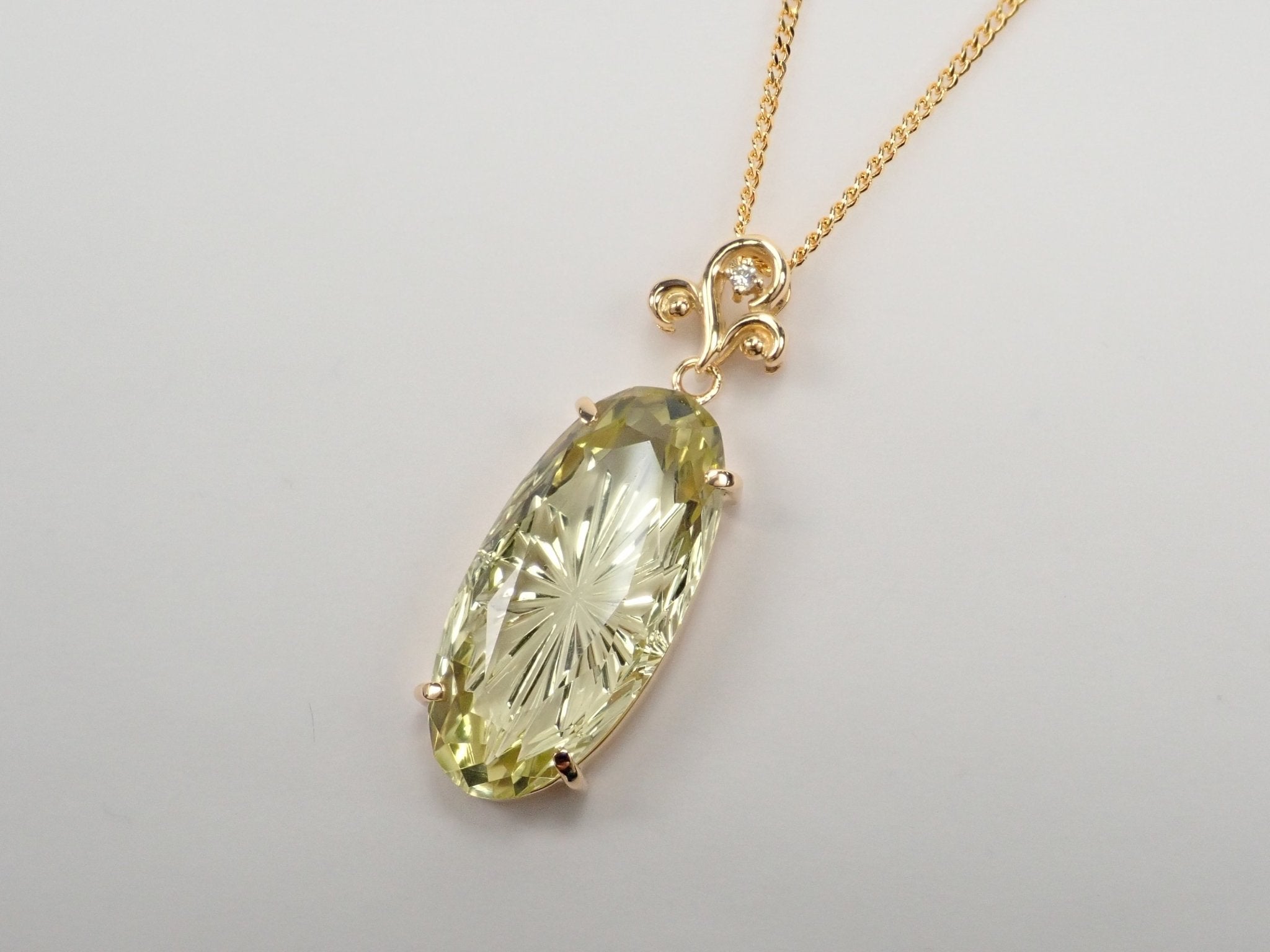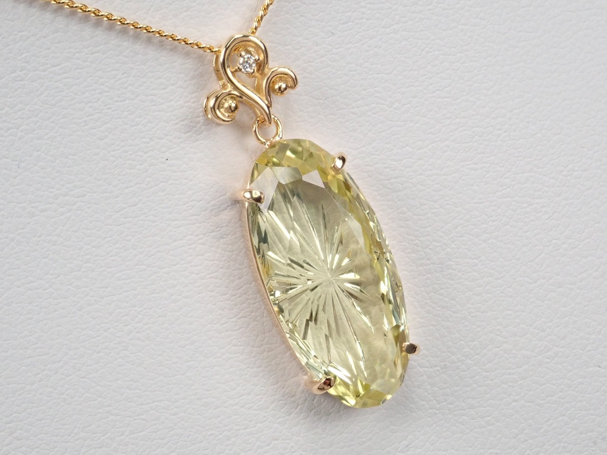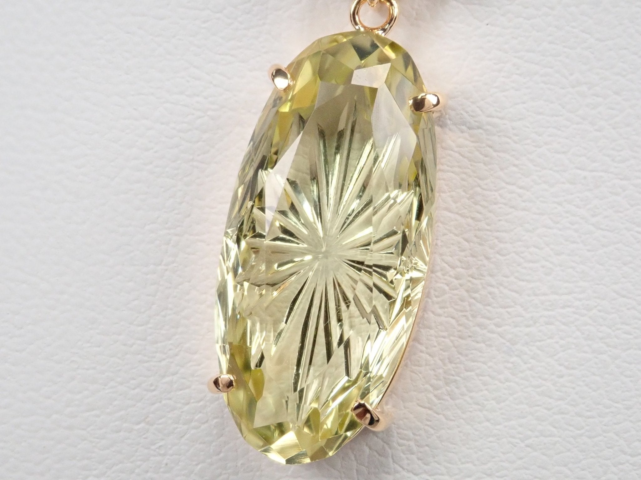 橢圓形檸檬石英吊墜頂部由甲州寶石製成。切割呈現乾淨的形狀,使透明的檸檬石英閃閃發光。梵蒂岡部分附有一顆鑽石,花朵般和常春藤般的設計很可愛。