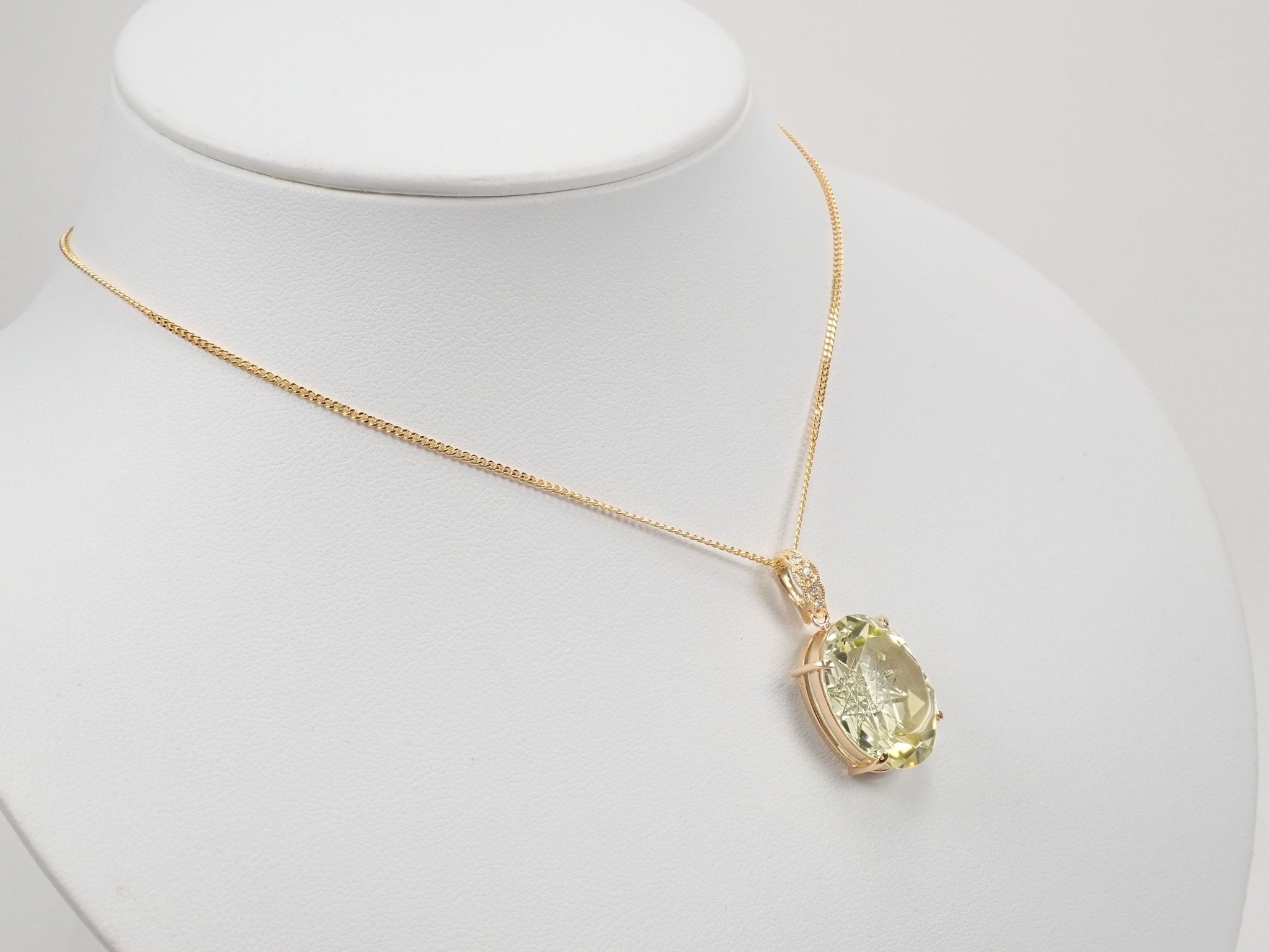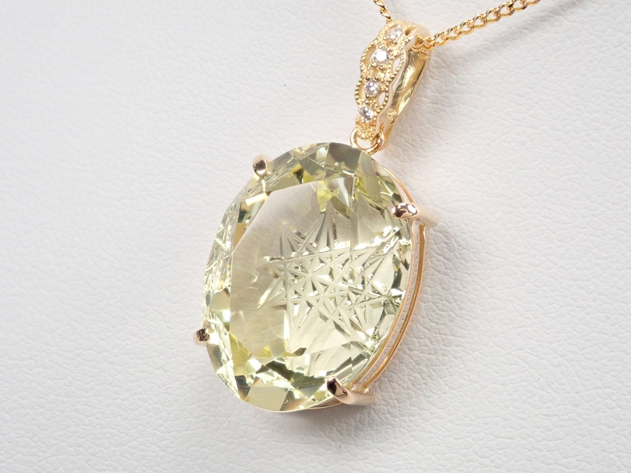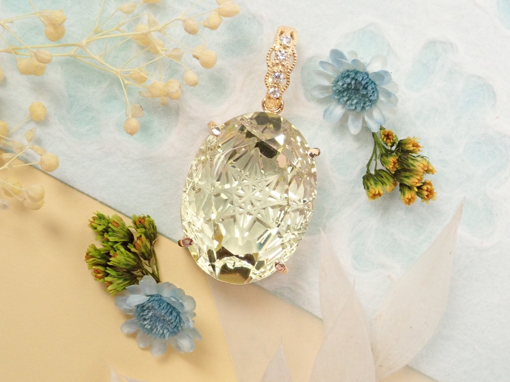 橢圓形檸檬石英吊墜頂部由甲州寶石製成。切割呈現乾淨的形狀,使透明的檸檬石英閃閃發光。梵蒂岡部分附有一顆鑽石,花朵般和常春藤般的設計很可愛。