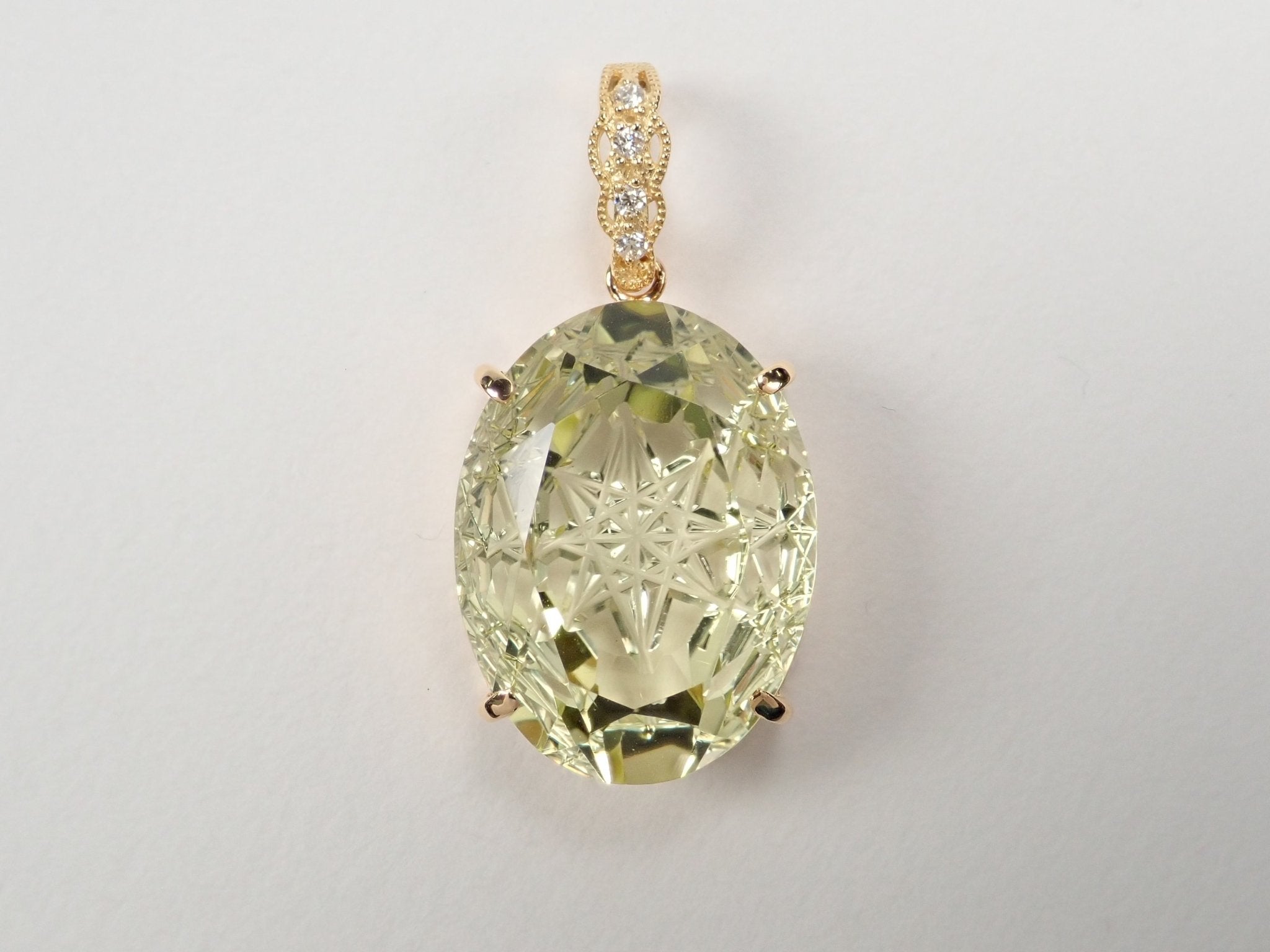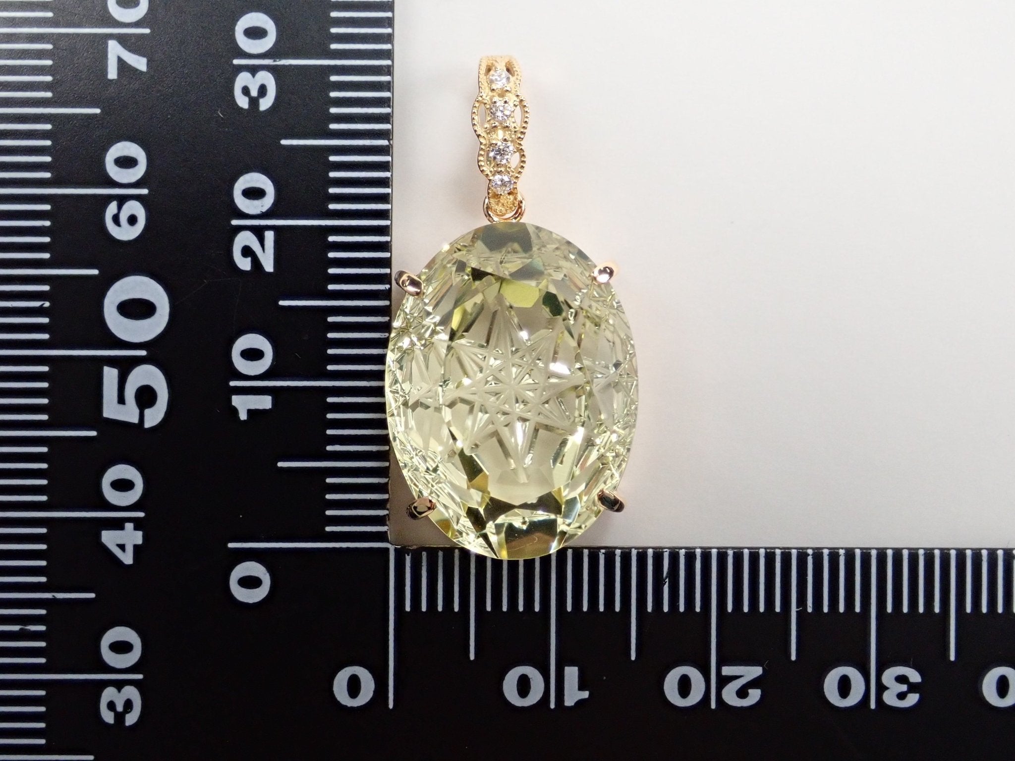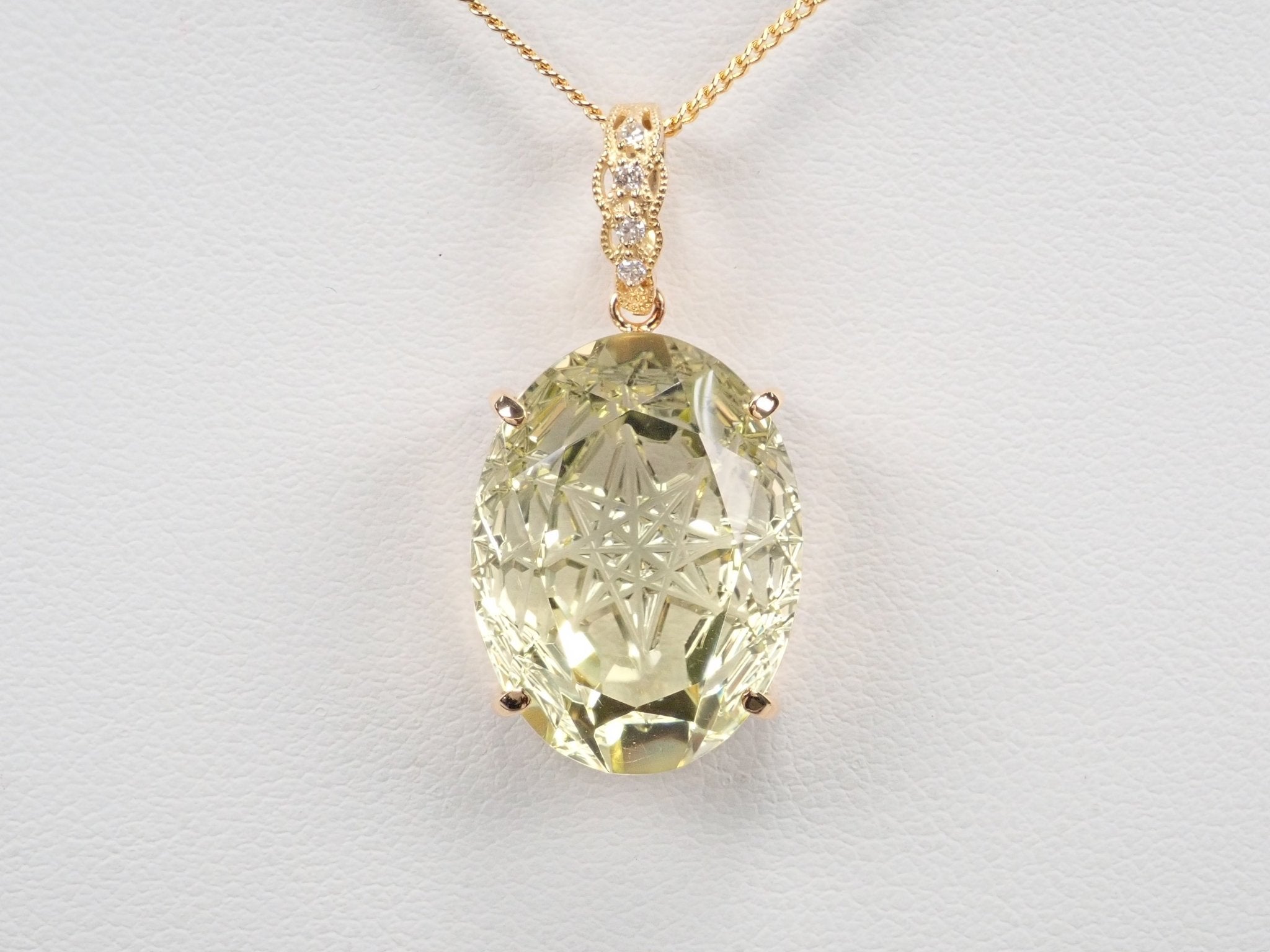 橢圓形檸檬石英吊墜頂部由甲州寶石製成。切割呈現乾淨的形狀,使透明的檸檬石英閃閃發光。梵蒂岡部分附有一顆鑽石,花朵般和常春藤般的設計很可愛。