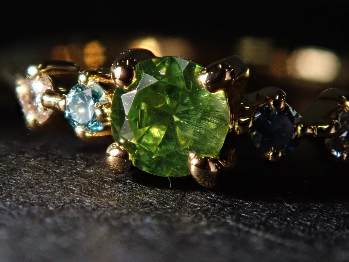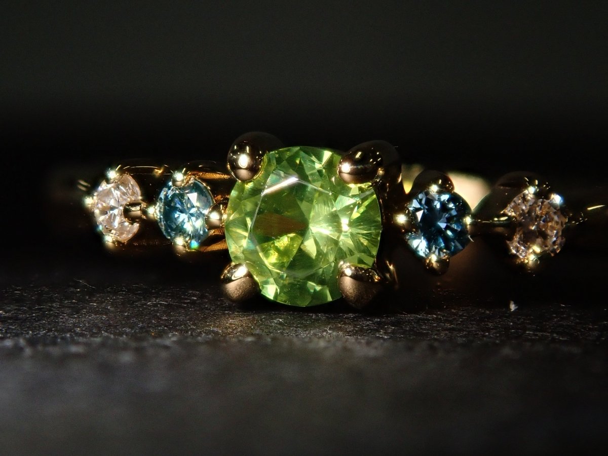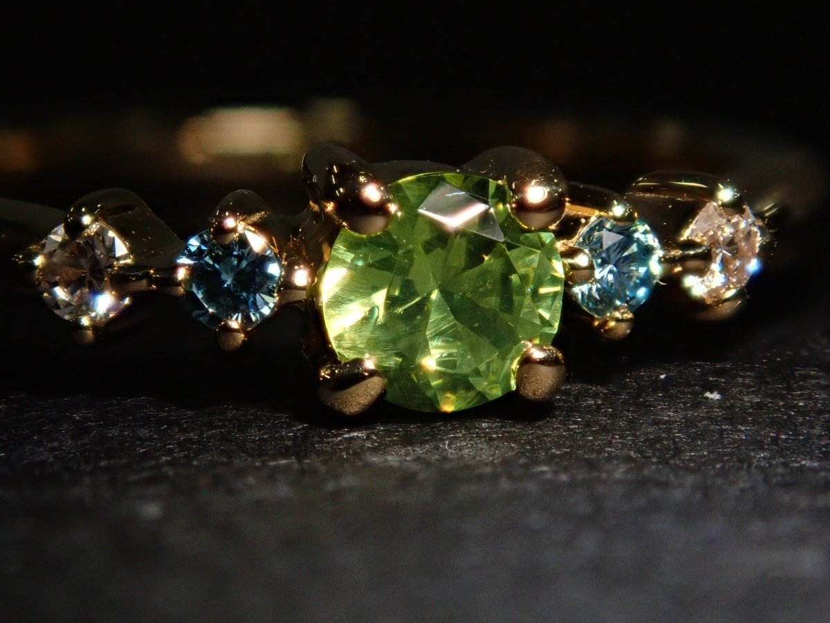 濃綠榴石石榴石,其年輕的橄欖黃綠色體色如同鑽石般閃耀。纖細簡潔的手臂上鑲嵌著藍鑽和透明鑽石,讓您欣賞到它精緻而閃爍的美麗。它的設計簡單,永遠不會厭倦,所以即使年紀大了也可以佩戴它。這款戒指由鬆散克拉製成。