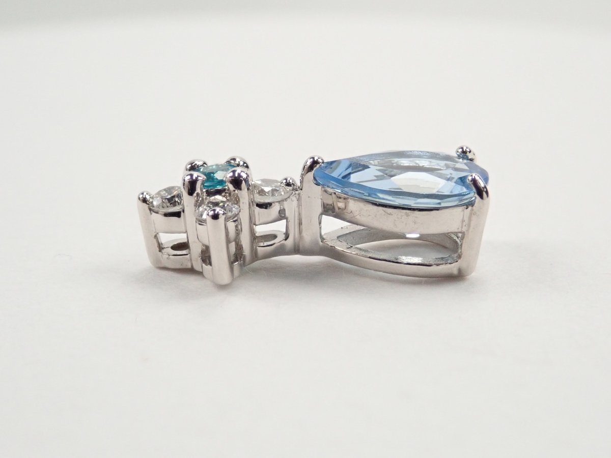 聖瑪麗亞海藍寶石具有迷人的透明淡藍色。水滴造型給人一種水滴般的清爽感。頂部含有巴西帕拉伊巴碧璽,周圍鑲有鑽石,藍色漸變美麗。垂直長吊墜頂部的設計給人一種柔和、略顯短暫的印象,讓觀眾感到親切。由鬆散的卡拉茲製成的吊墜。