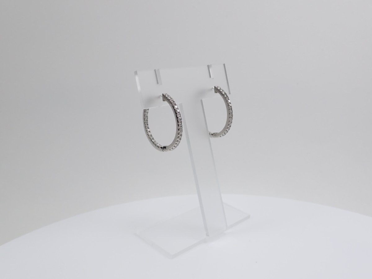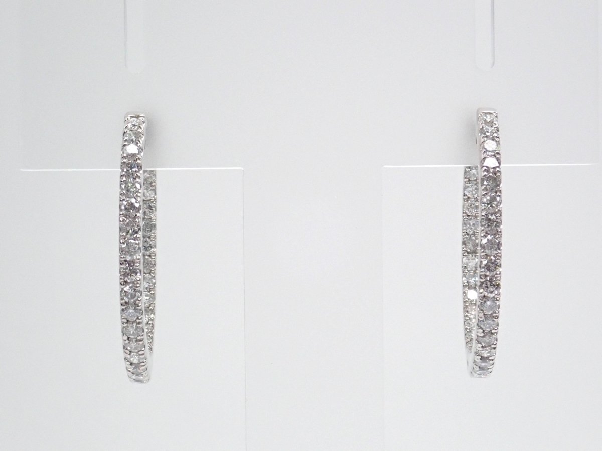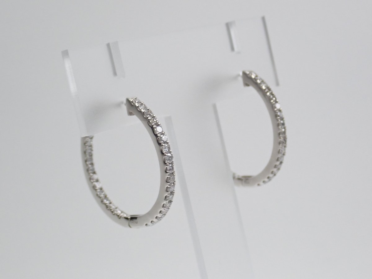 環形鑽石耳環在她耳邊閃閃發光。具有 SI 至 I 級高透明度的無色鑽石的光芒將繼續讓我們著迷。箍型設計適合任何服裝或場合,因此可能會多次佩戴。它是相當於 SI 至 I 級的無色鑽石。