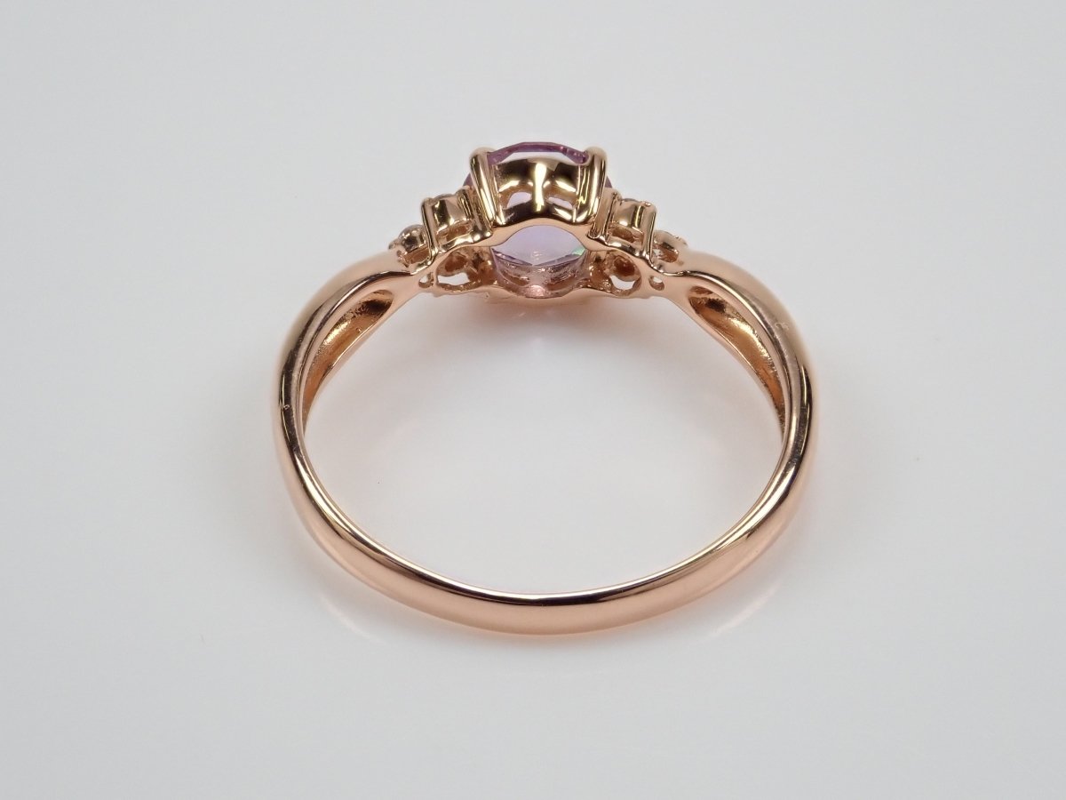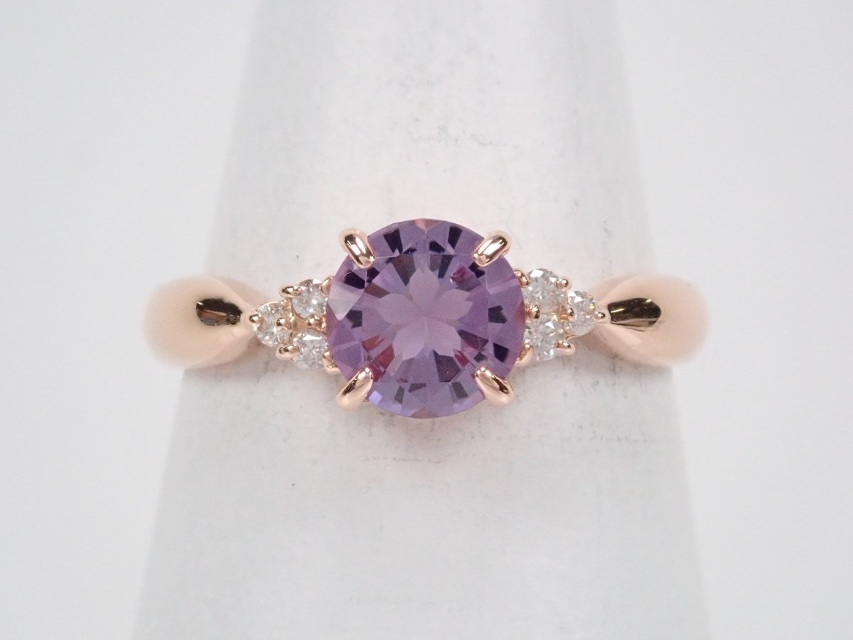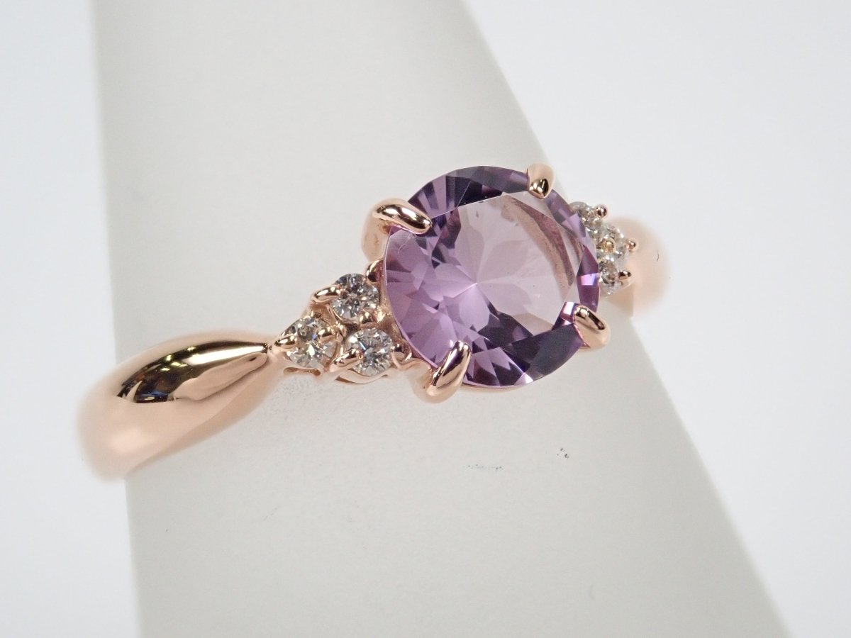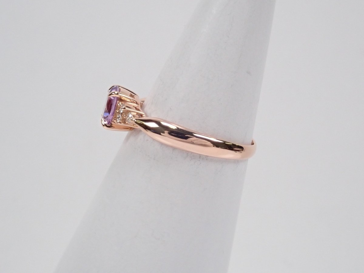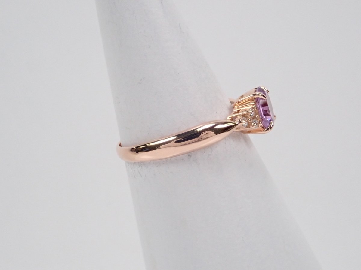 櫻花內切紫水晶戒指。紫水晶擁有美麗光滑的光澤,淡紫色的色澤賦予它優雅的氣息。這是玫瑰金的完美顏色。戒指的光滑氛圍與櫻花切磨相得益彰。副石上的鑽石也是焦點。