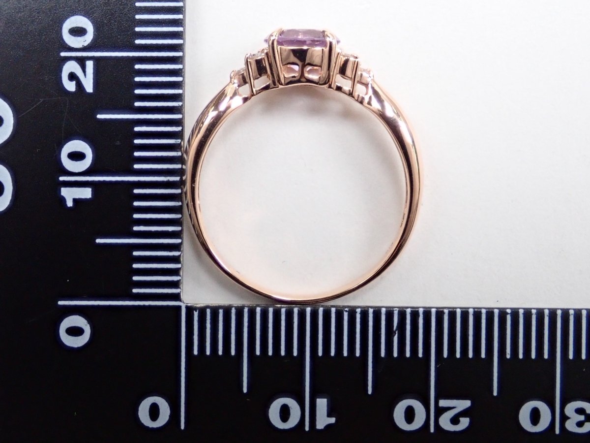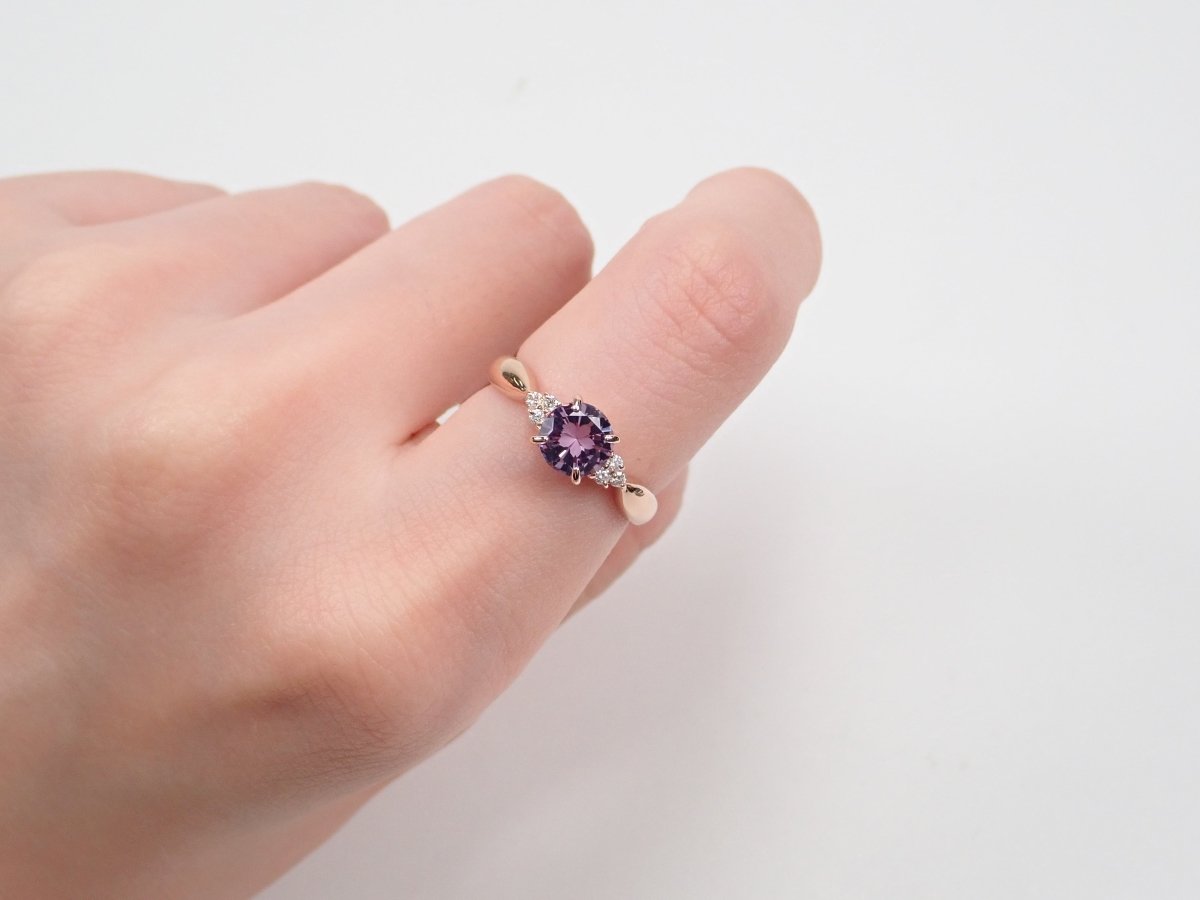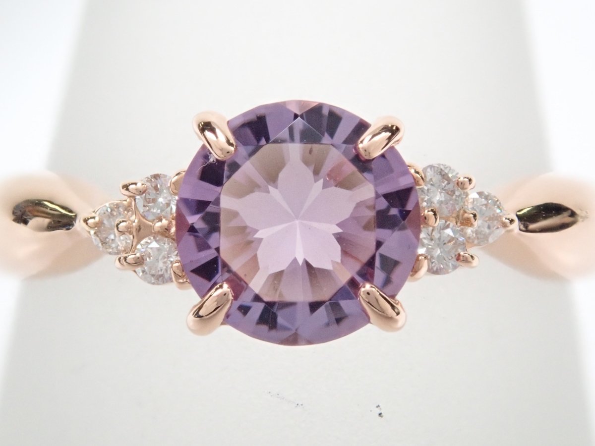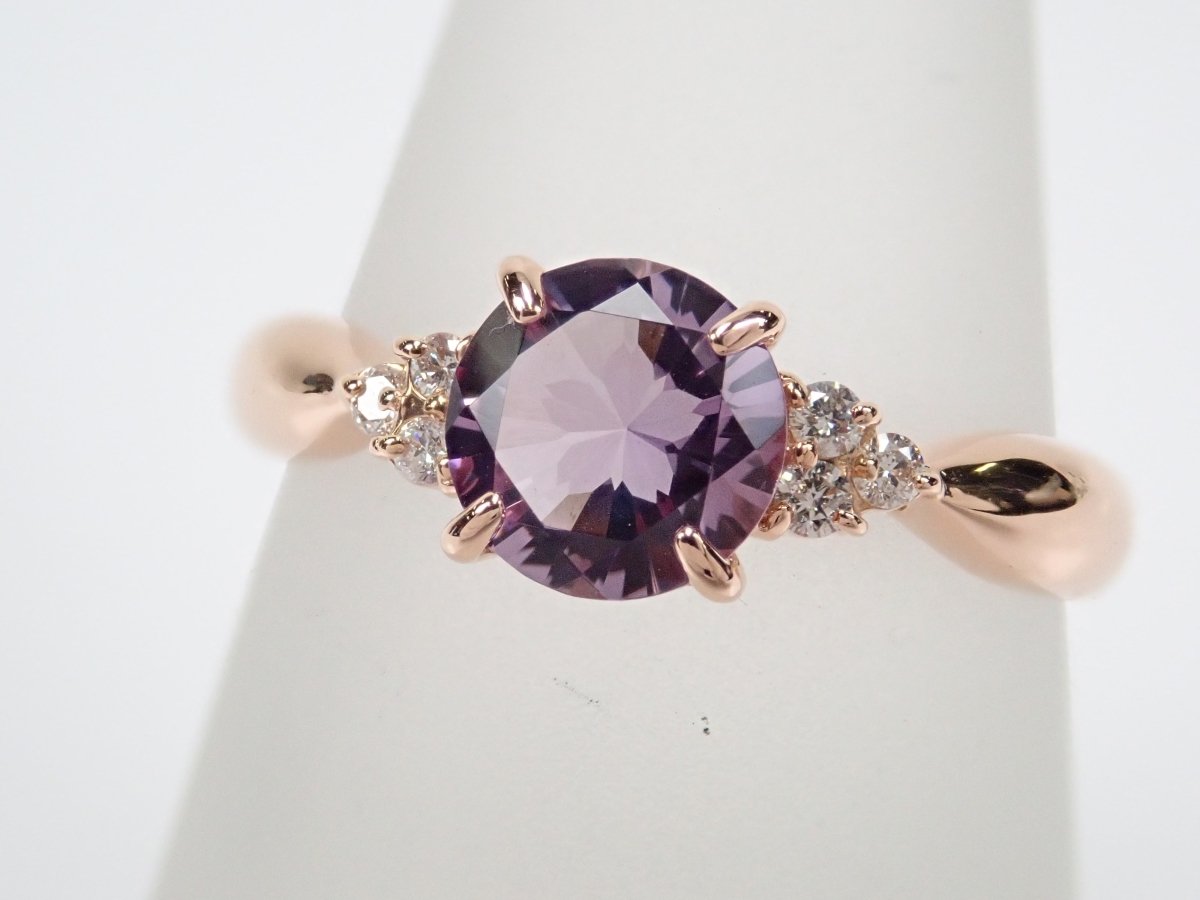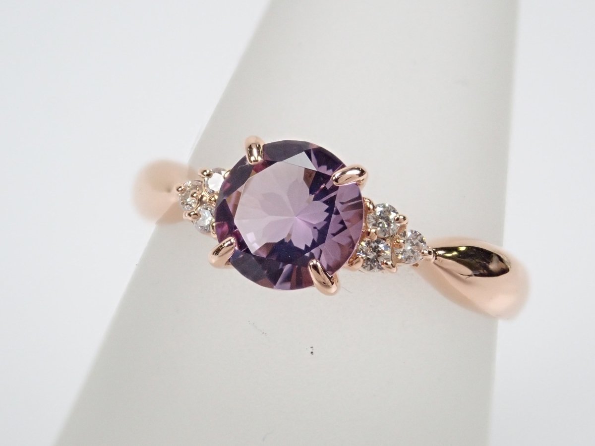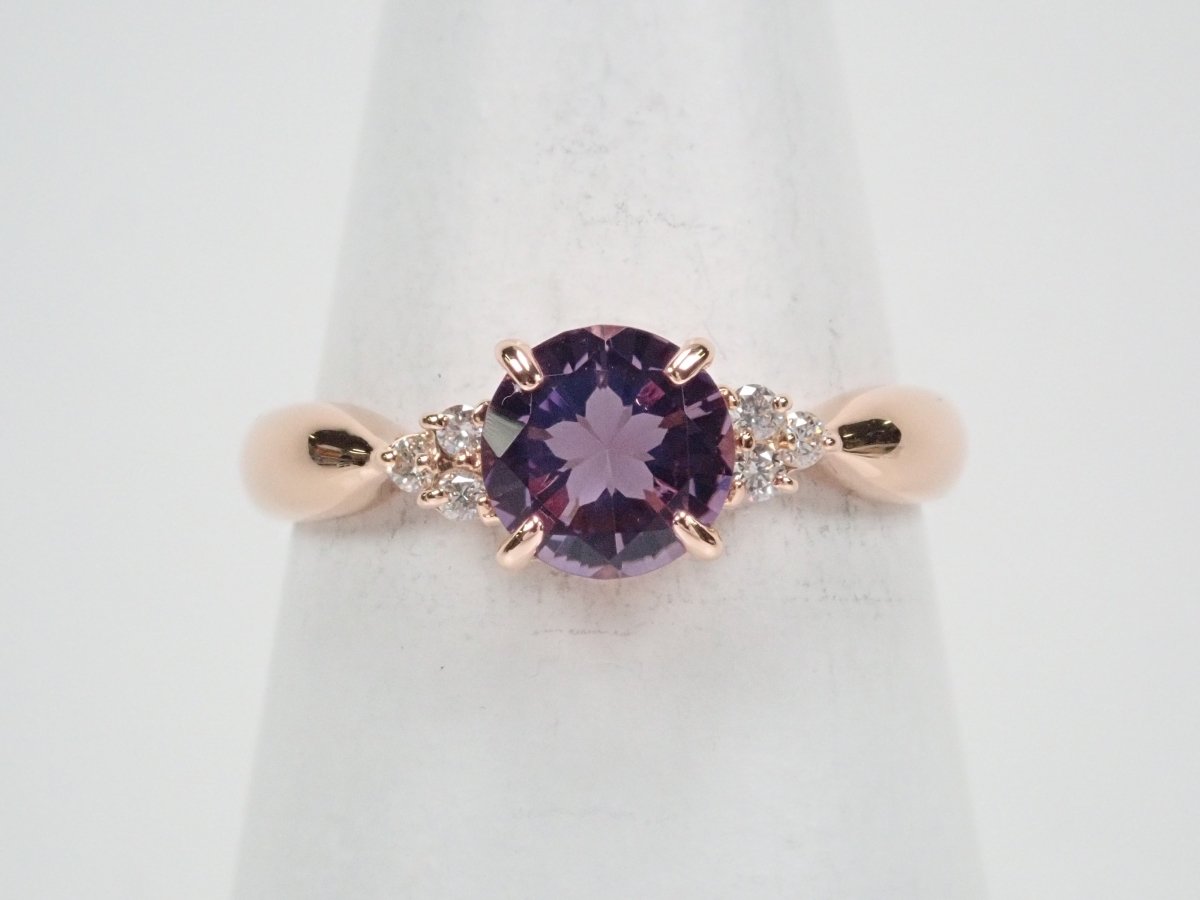 櫻花內切紫水晶戒指。紫水晶擁有美麗光滑的光澤,淡紫色的色澤賦予它優雅的氣息。這是玫瑰金的完美顏色。戒指的光滑氛圍與櫻花切磨相得益彰。副石上的鑽石也是焦點。