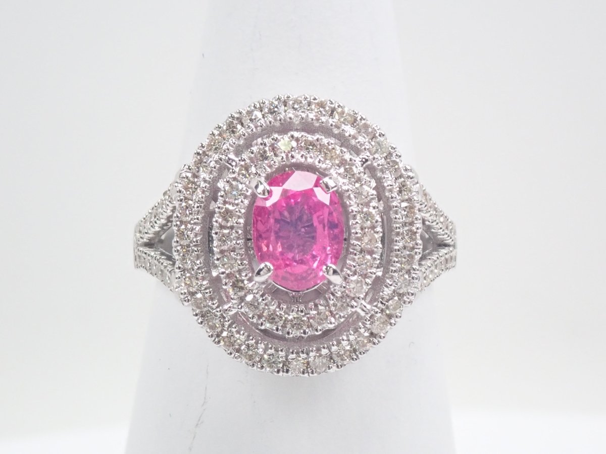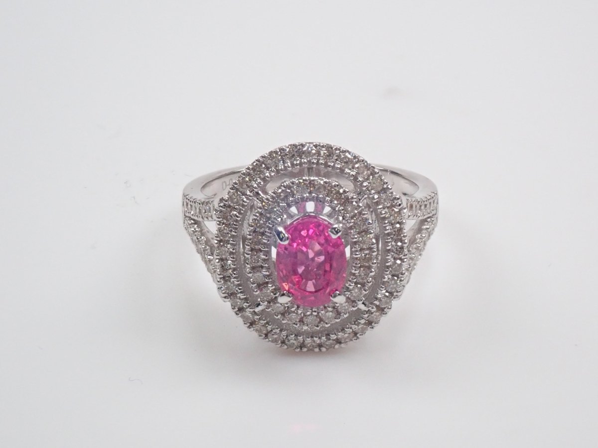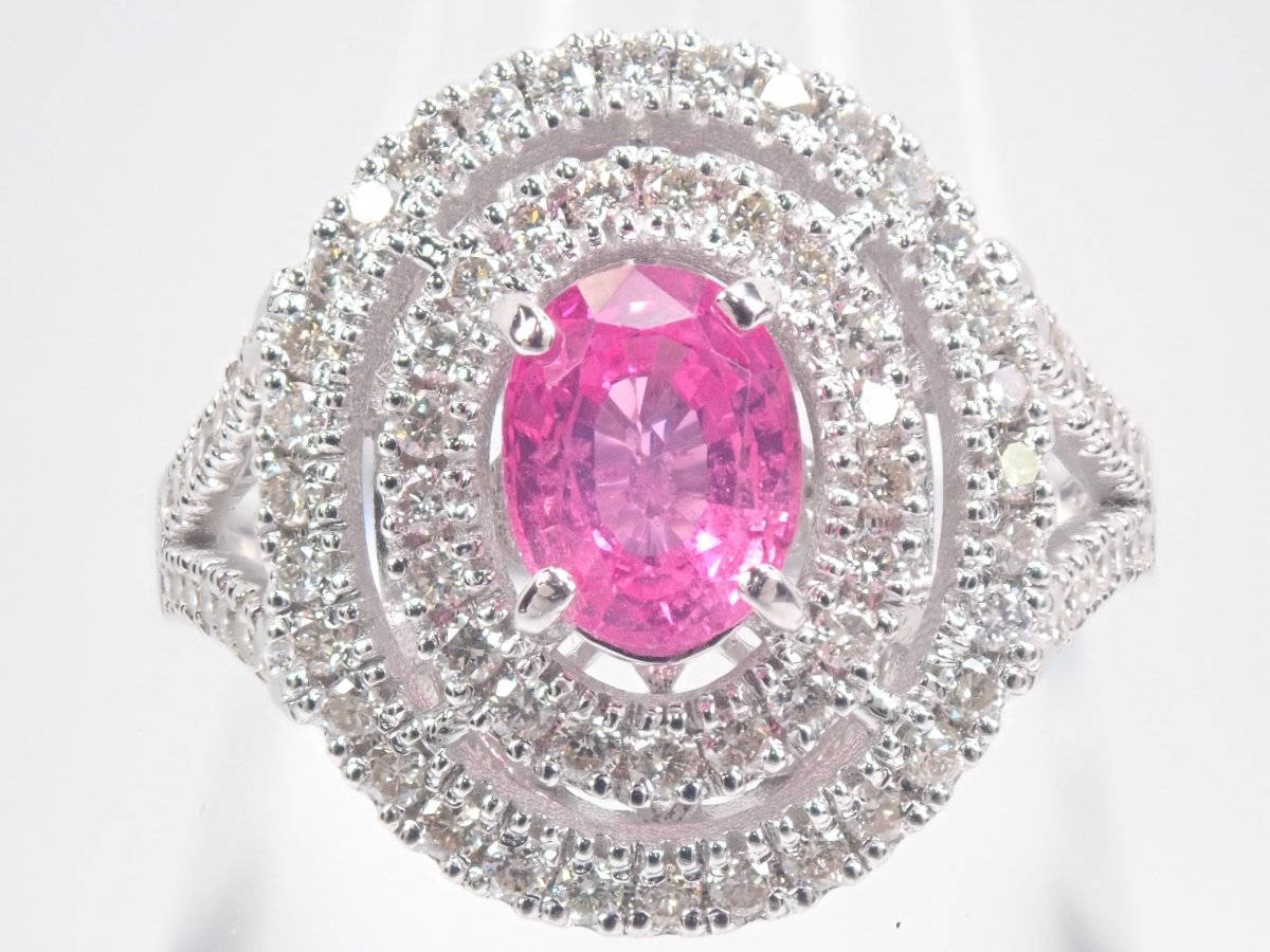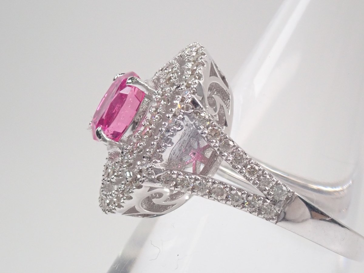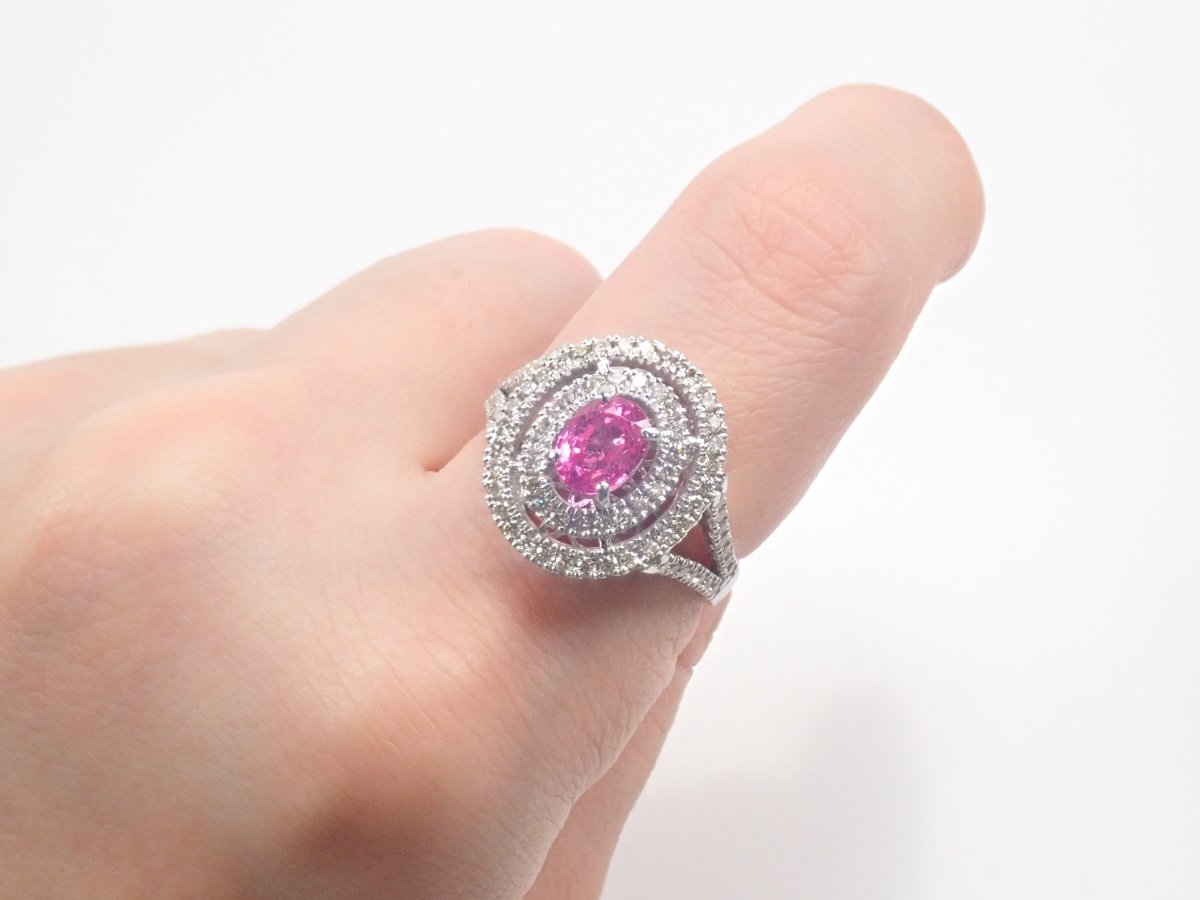 亮粉色藍寶石重 1 克拉。美麗的色彩和透明度吸引著觀眾。令人印象深刻的藍寶石周圍環繞著總重 0.64 克拉的雙層鑽石。設計無論從哪個角度看都很美,有一種堪稱經典戒指的華麗感。精緻的設計,甚至是框架側面和背面的細節,都令人驚嘆。約5.8克。無色鑽石相當於鑽石VS~SI級。由中央寶石研究所進行分類。 [ 多彩] 點擊此處查看產品清單。