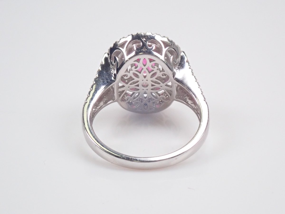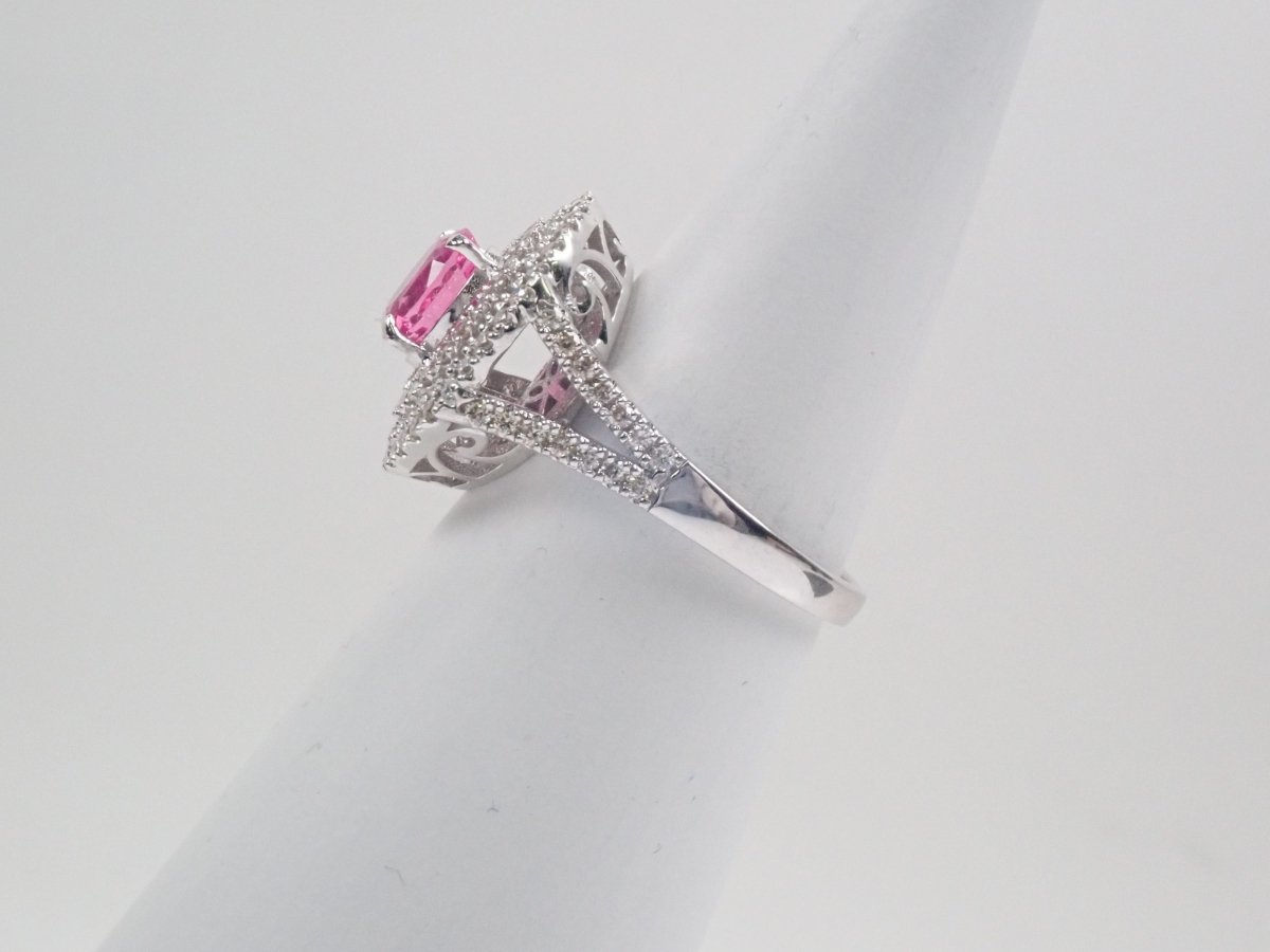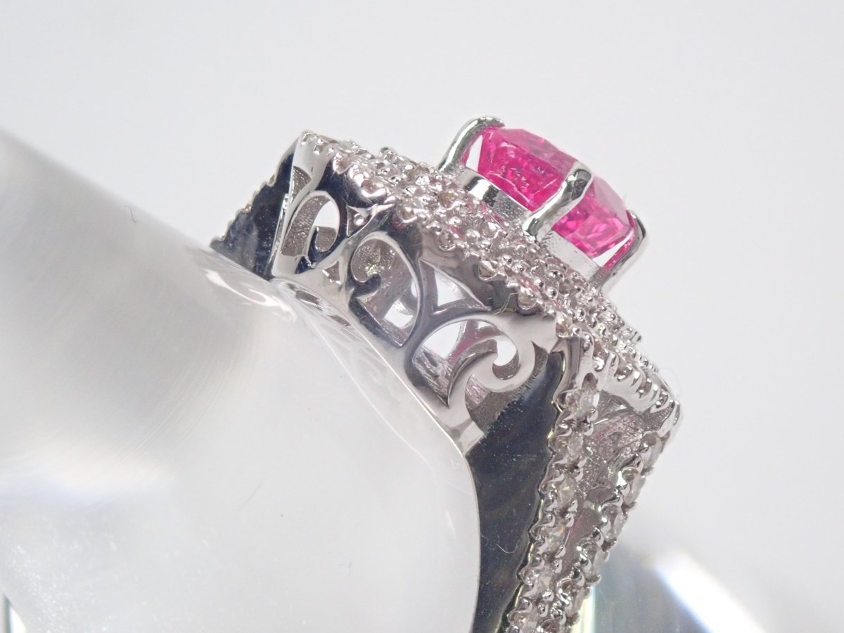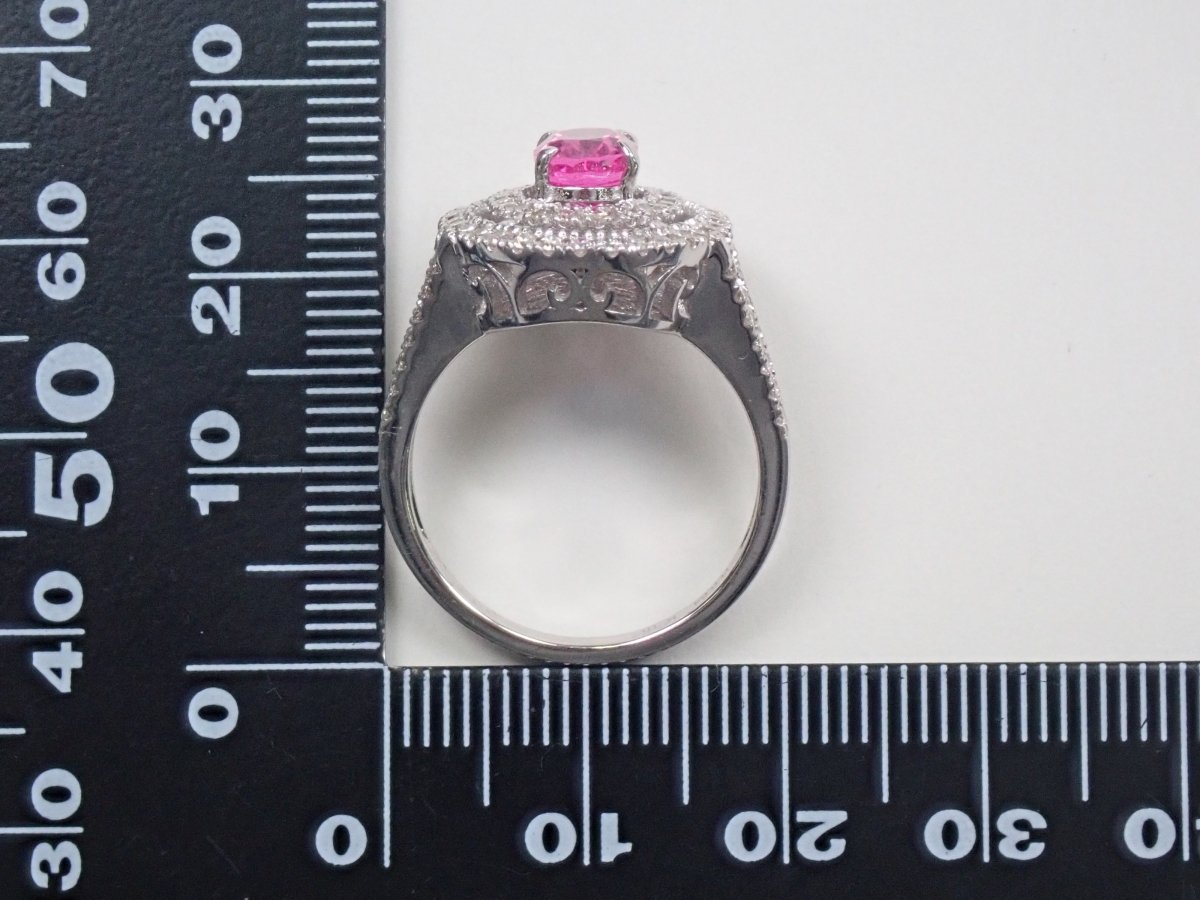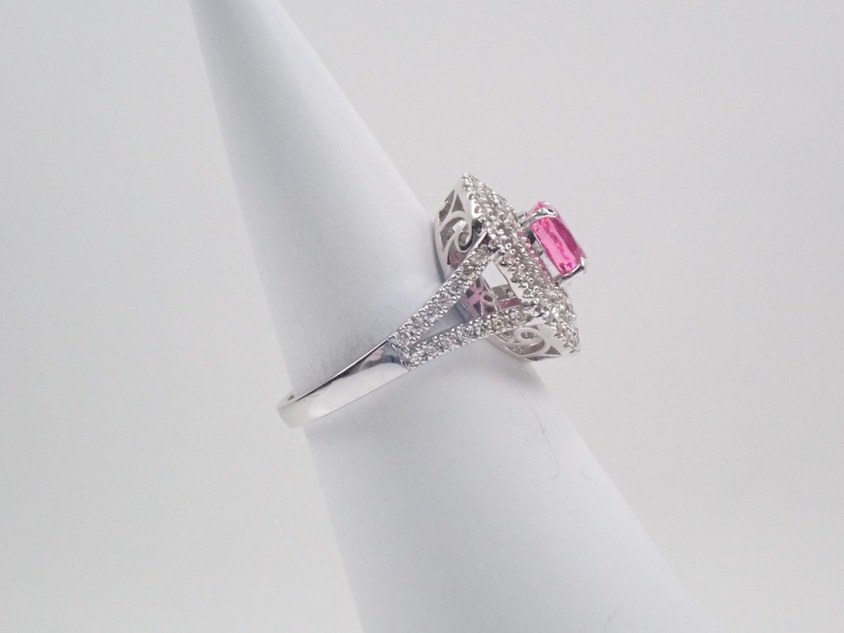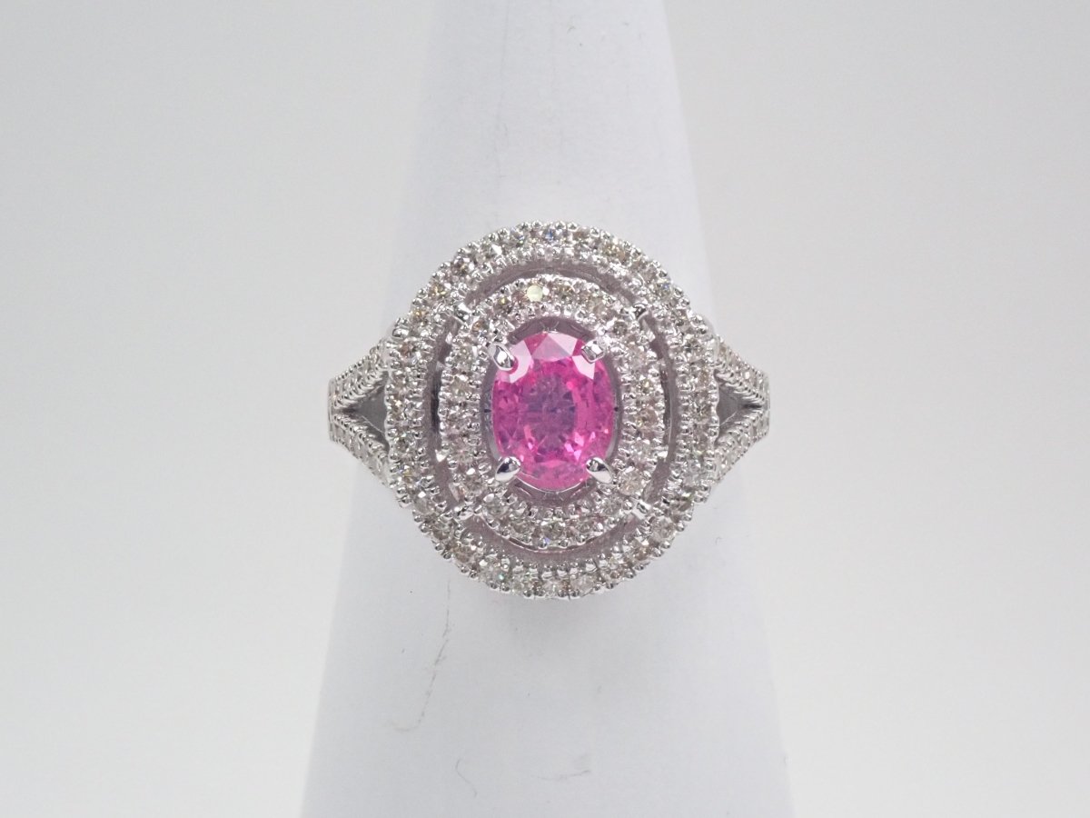 亮粉色藍寶石重 1 克拉。美麗的色彩和透明度吸引著觀眾。令人印象深刻的藍寶石周圍環繞著總重 0.64 克拉的雙層鑽石。設計無論從哪個角度看都很美,有一種堪稱經典戒指的華麗感。精緻的設計,甚至是框架側面和背面的細節,都令人驚嘆。約5.8克。無色鑽石相當於鑽石VS~SI級。由中央寶石研究所進行分類。 [ 多彩] 點擊此處查看產品清單。