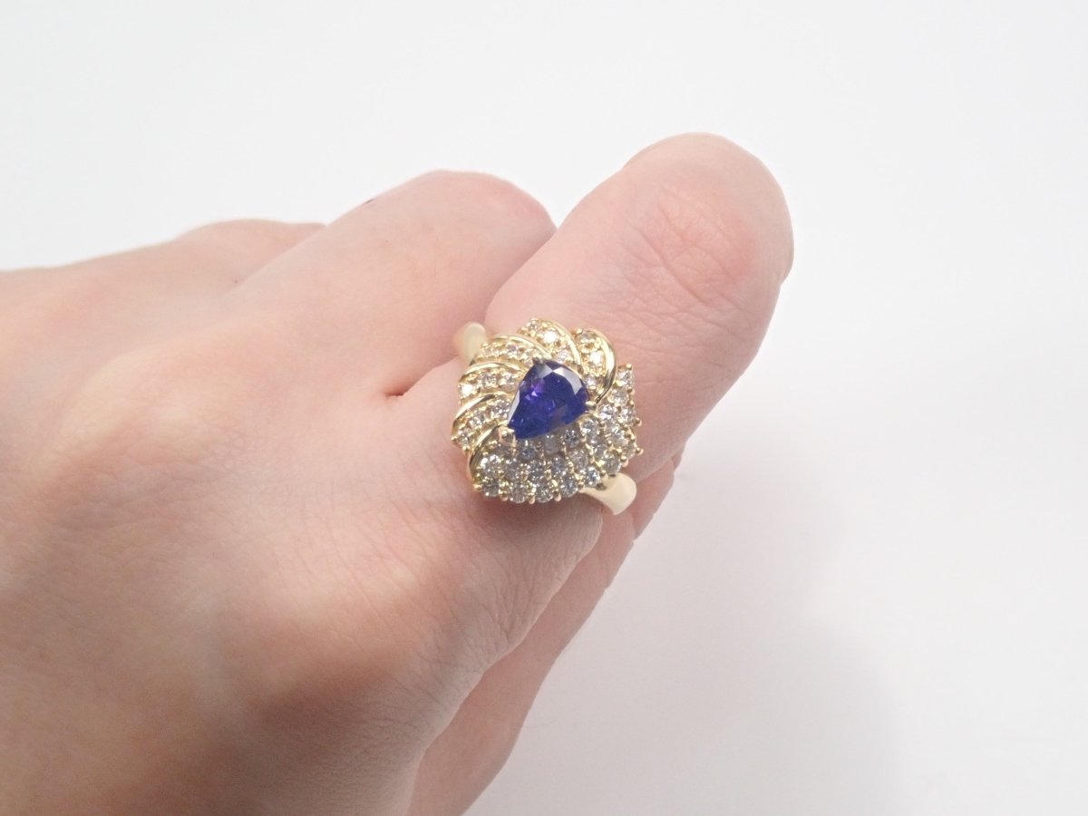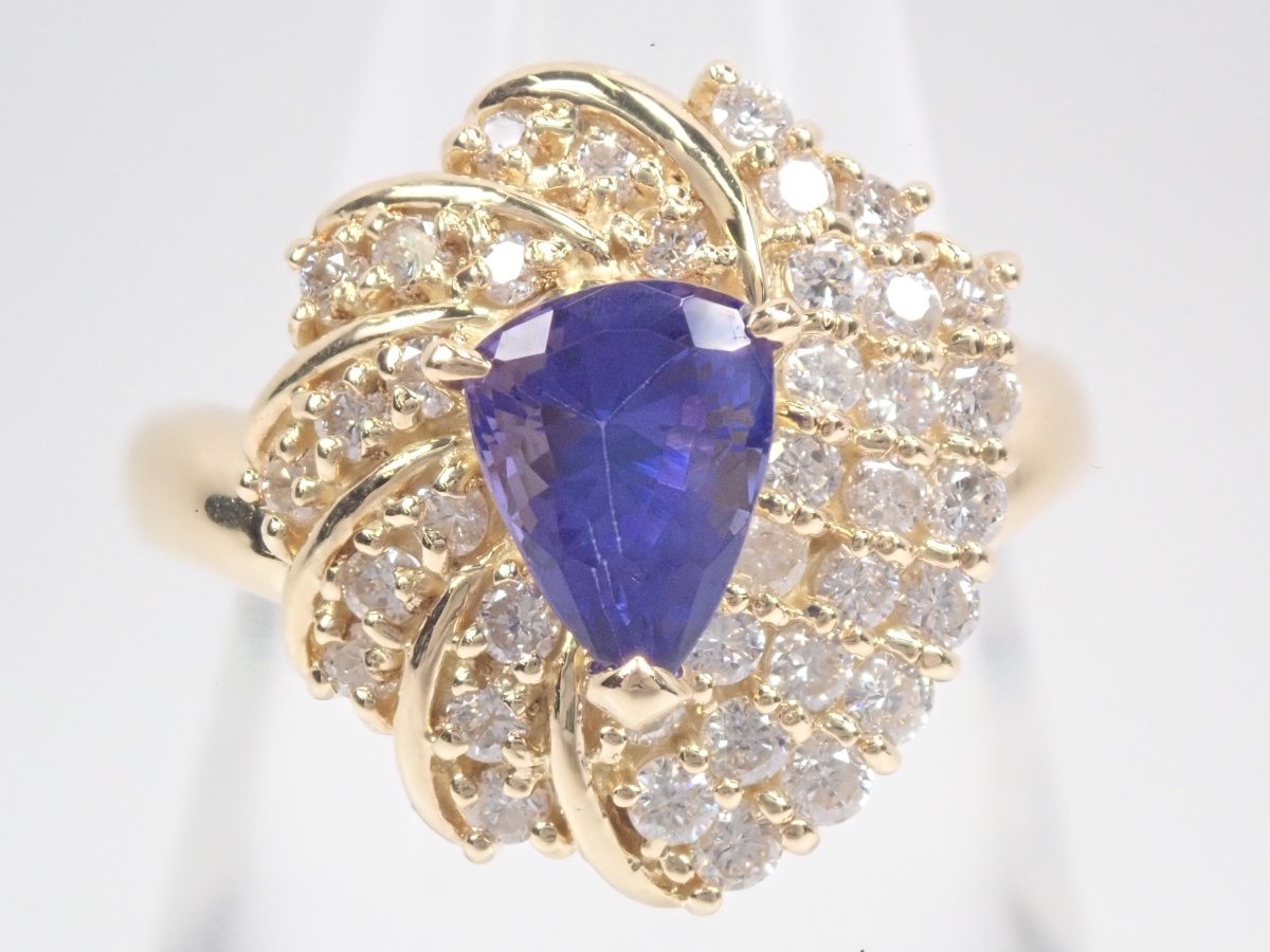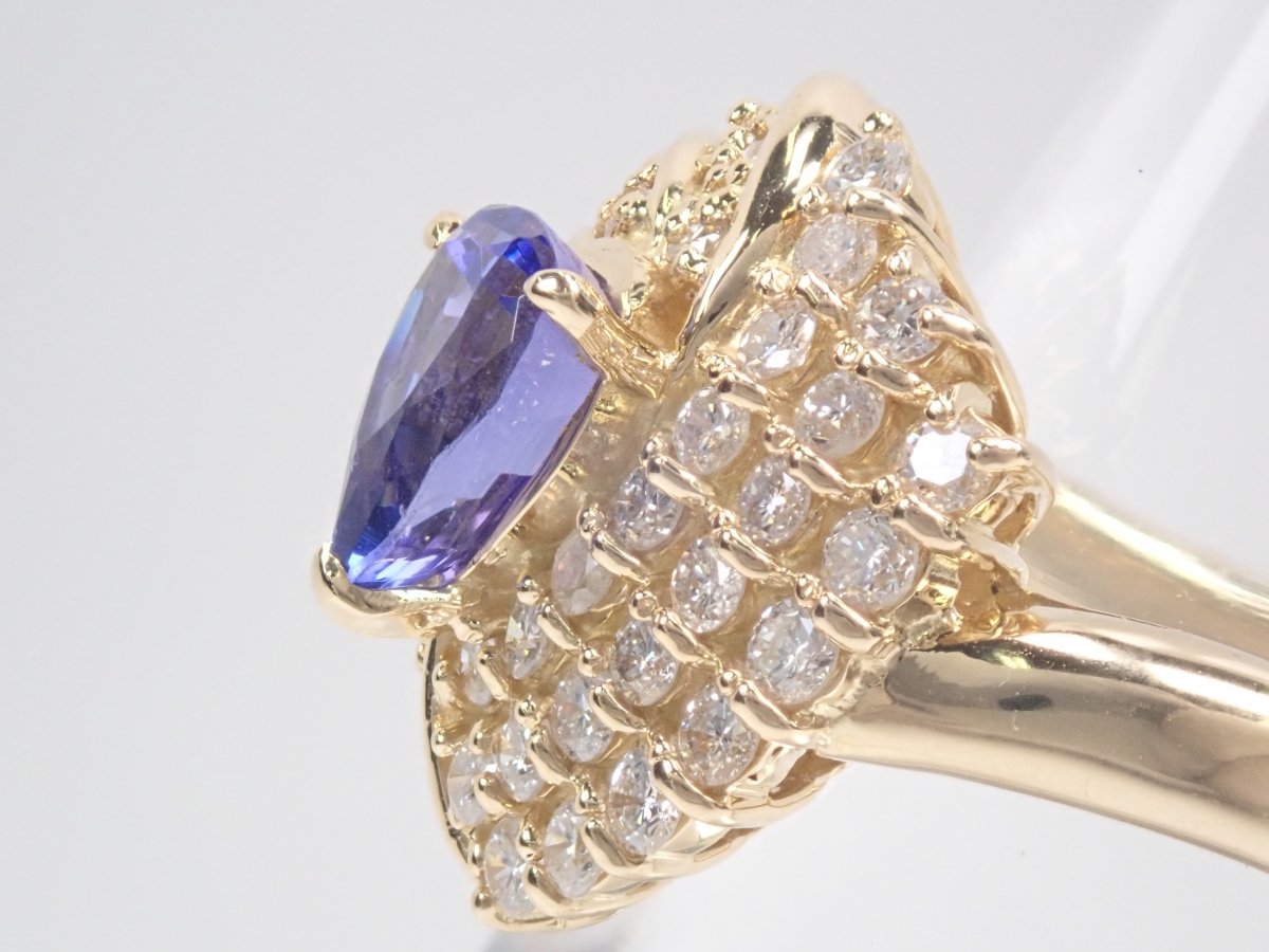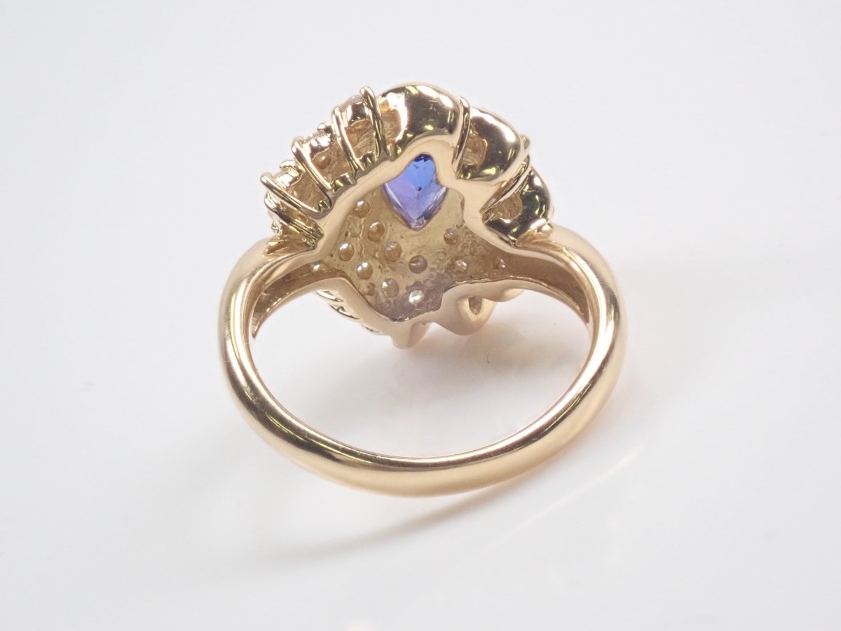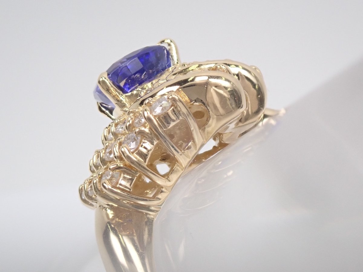 一顆 1 克拉坦桑石在黃金框架中央閃閃發光。深藍色的顏色從不同的角度觀看都展現出坦桑石獨特的多色性,令人百看不厭的美麗。周圍的鑽石部分採用精緻平衡的不對稱設計,給人一種深思熟慮的美感。華麗而龐大的戒指。約7.5克。無色鑽石相當於鑽石SI至I級。 [ 多彩] 點擊此處查看產品清單。