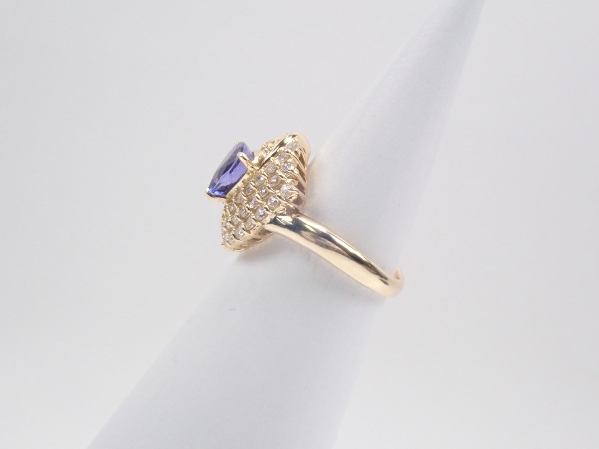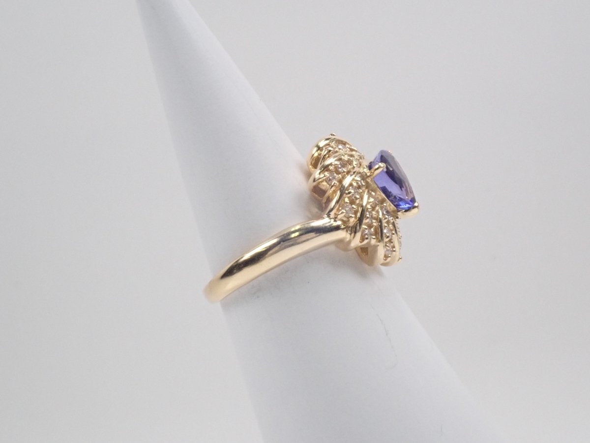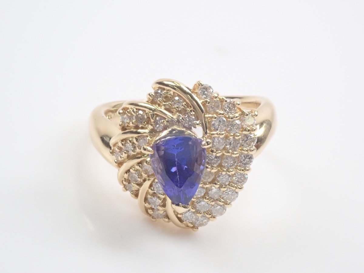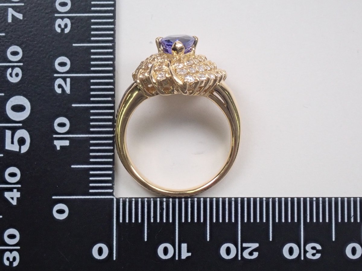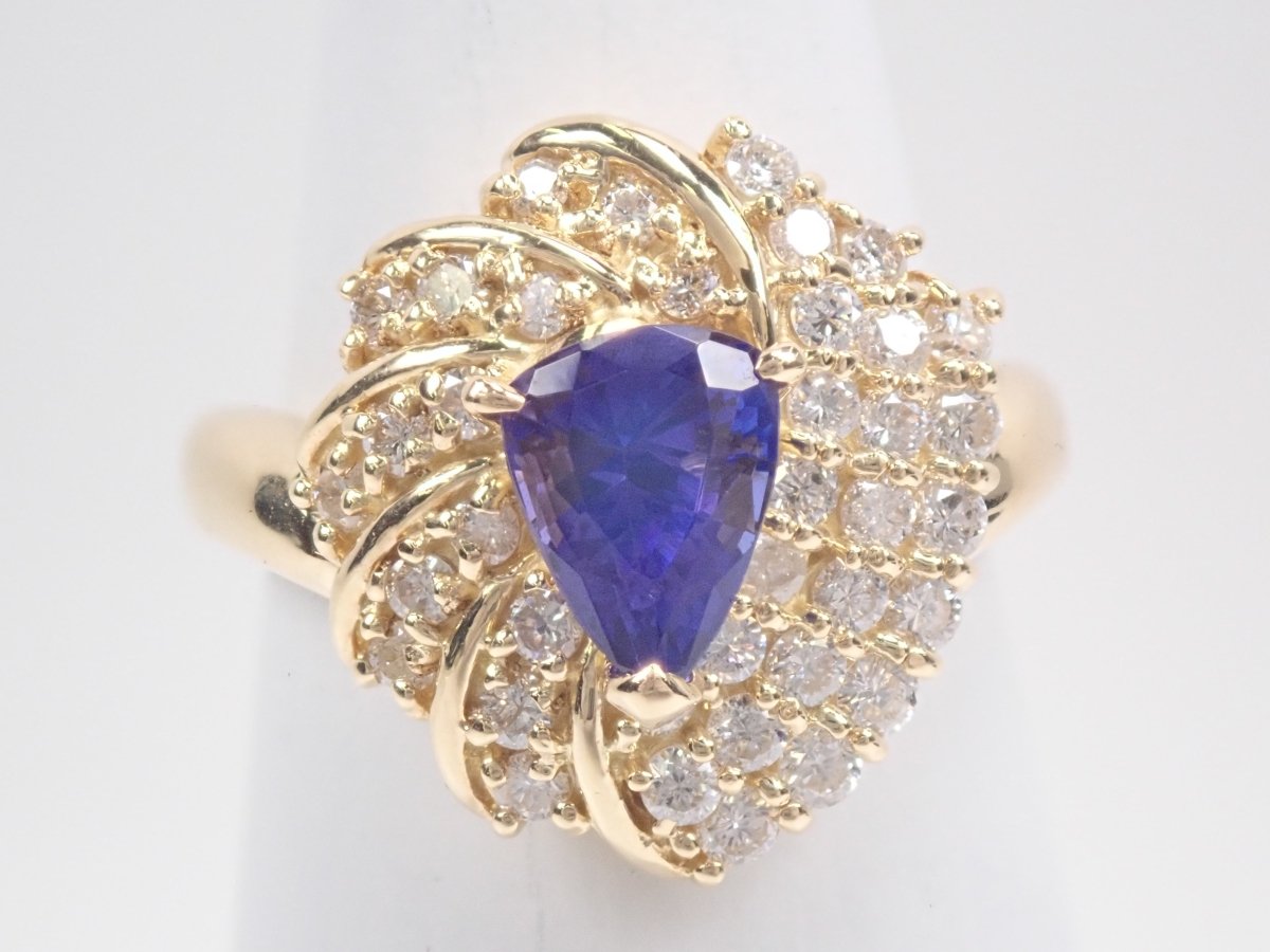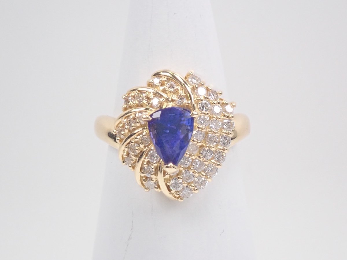 一顆 1 克拉坦桑石在黃金框架中央閃閃發光。深藍色的顏色從不同的角度觀看都展現出坦桑石獨特的多色性,令人百看不厭的美麗。周圍的鑽石部分採用精緻平衡的不對稱設計,給人一種深思熟慮的美感。華麗而龐大的戒指。約7.5克。無色鑽石相當於鑽石SI至I級。 [ 多彩] 點擊此處查看產品清單。