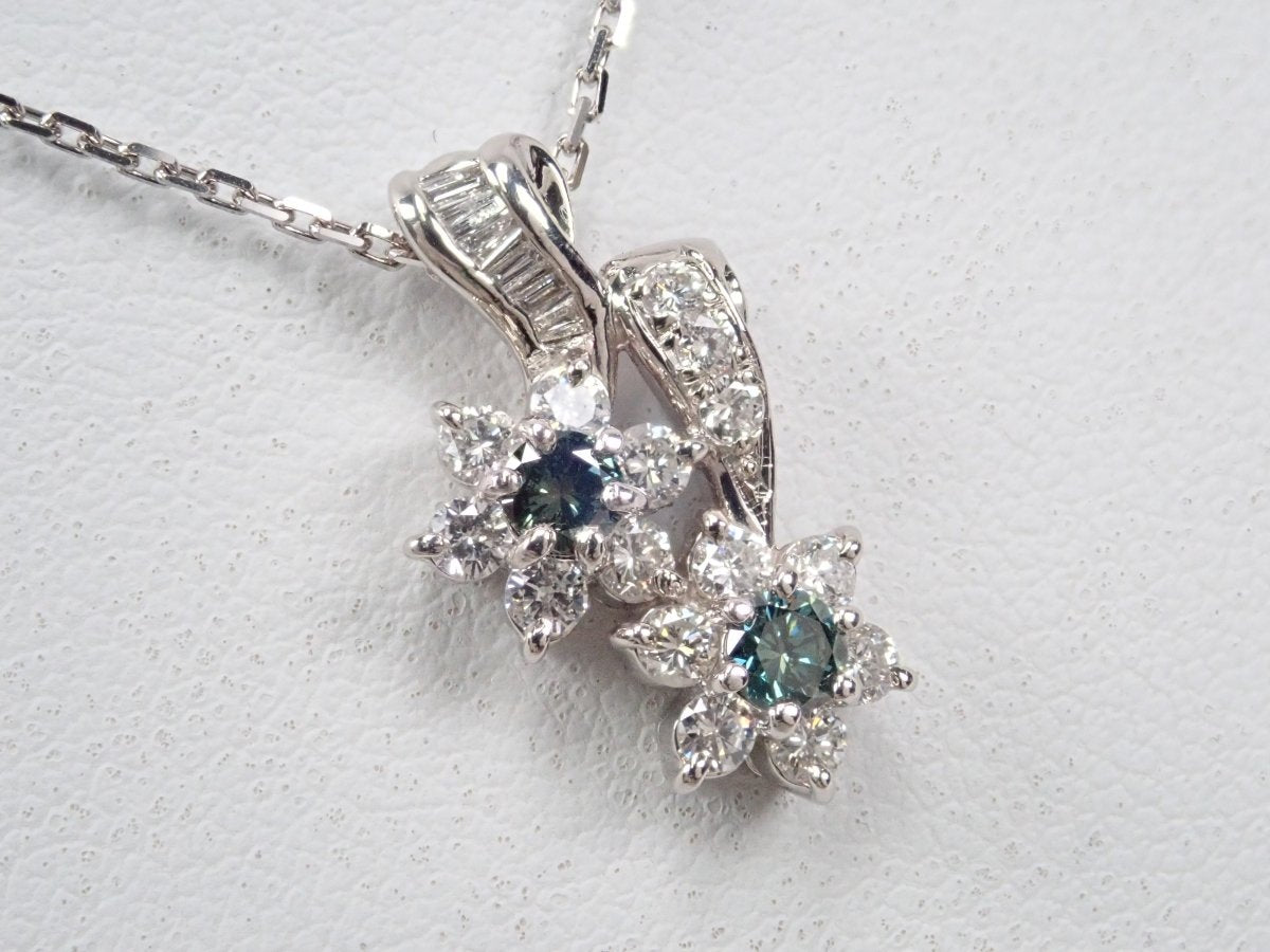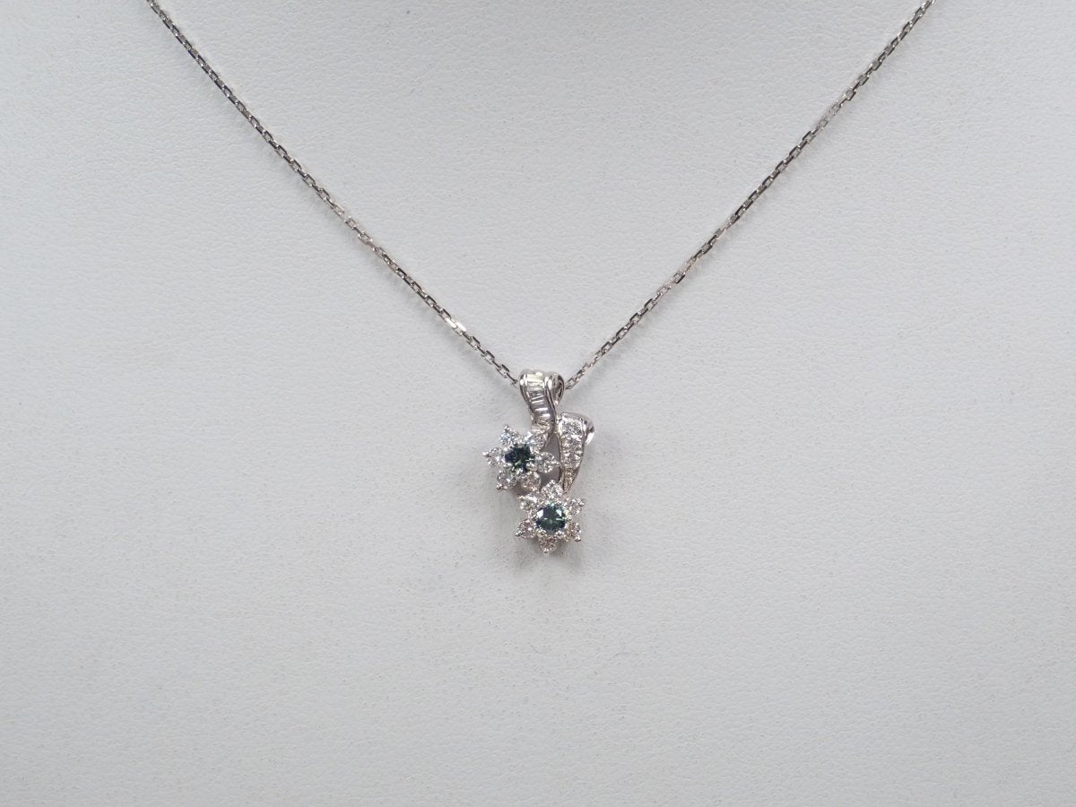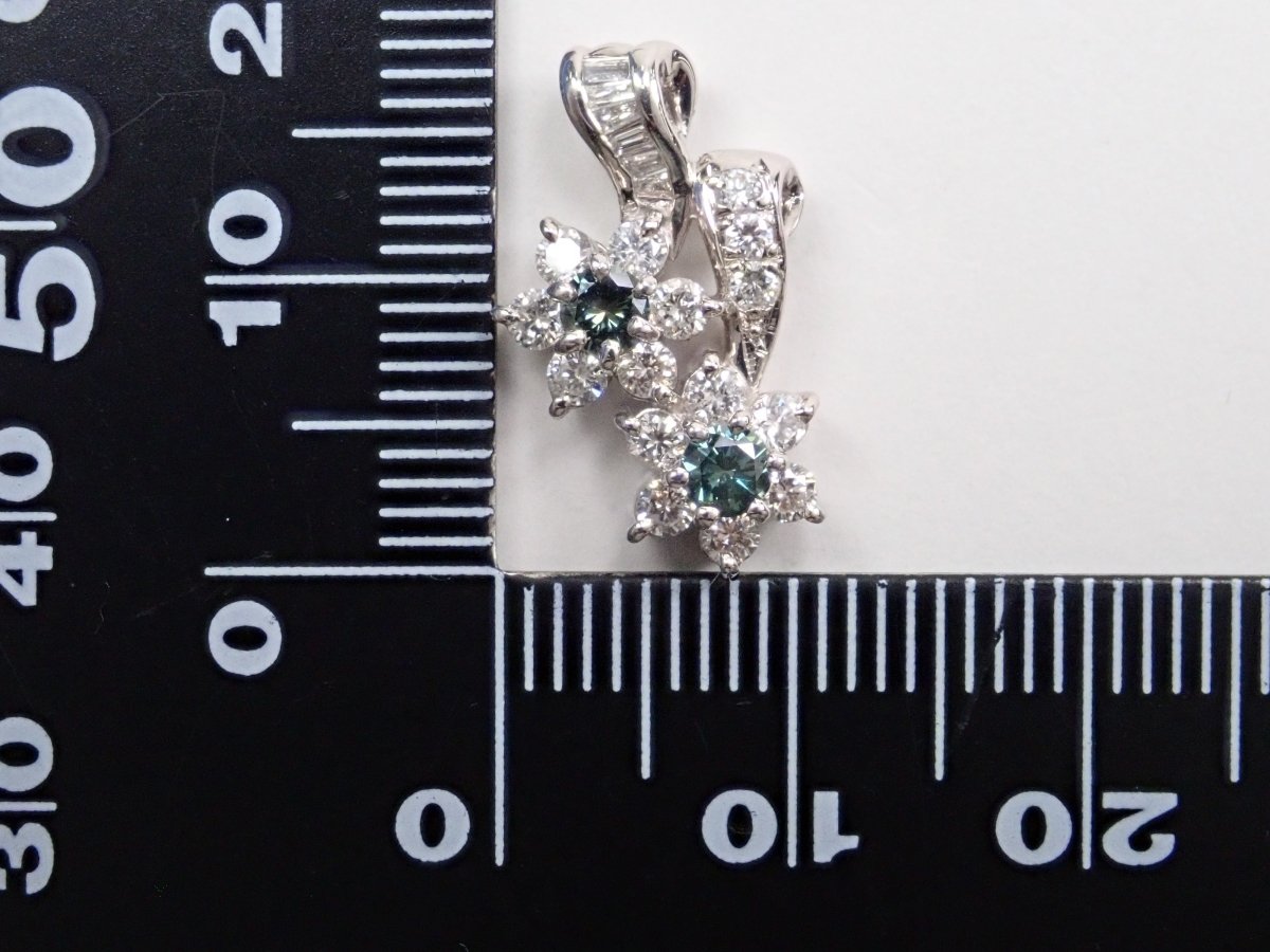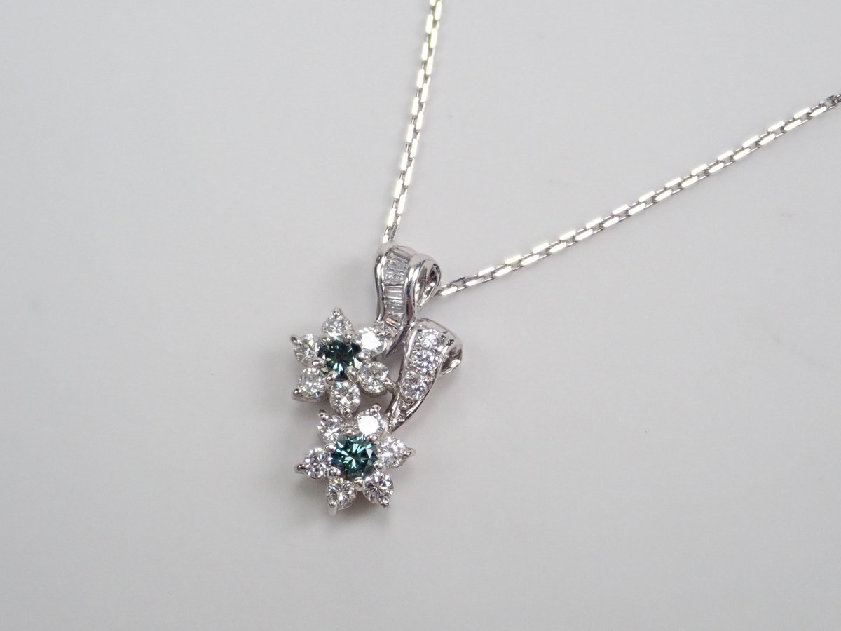 綠藍色鑽石(處理)吊墜頂部。花朵圖案選用璀璨無色鑽石作為副石。雖然設計精巧,但梵蒂岡部分的鑽石卻牢牢地鑲嵌在其中,製作精良,是可以長久使用的珠寶。約3.0克。無色鑽石相當於鑽石VS~SI級。 [ 多彩] 點擊此處查看產品清單。