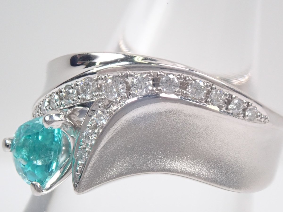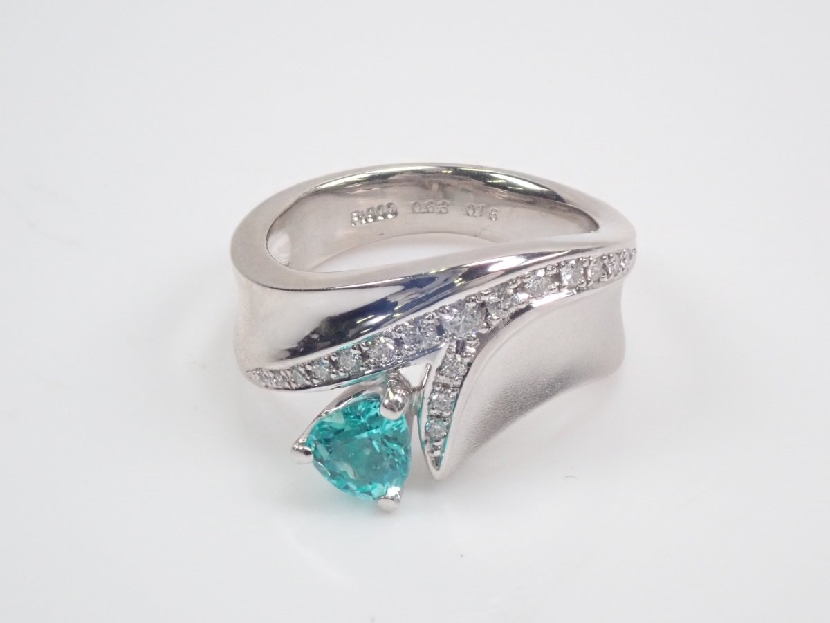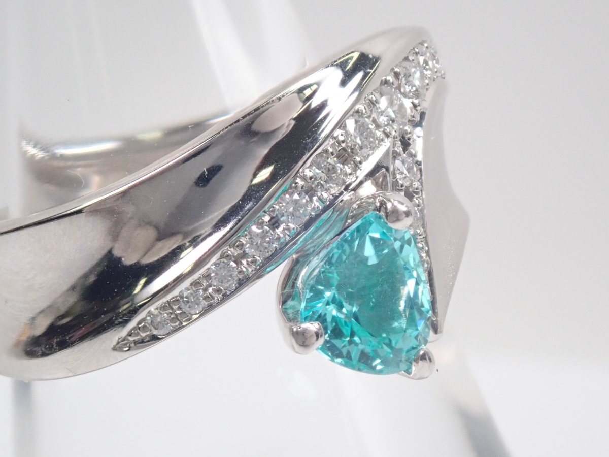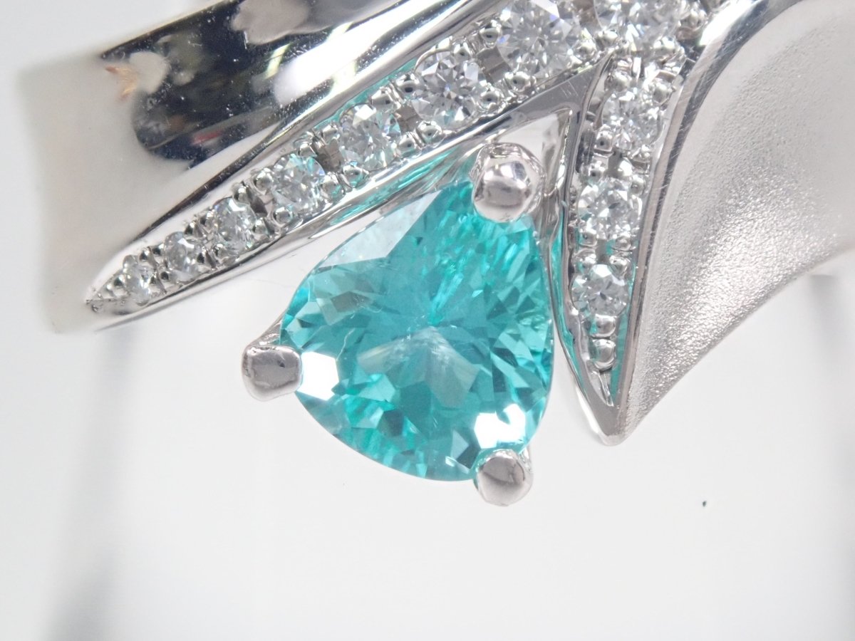 帕拉伊巴碧璽顏色好,非常漂亮,比莫三比克高 0.6 克拉。梨形的帕拉伊巴碧璽具有將大地所有美麗的藍色凝聚成一顆寶石的魅力。戒指的構造給人一種深邃的感覺,很適合這顆帕拉伊巴碧璽。重量約11.9克。該鑽石為相當於VS級的無色鑽石。隨附 GIA 真品證書。 [ 多彩] 點擊此處查看產品清單。