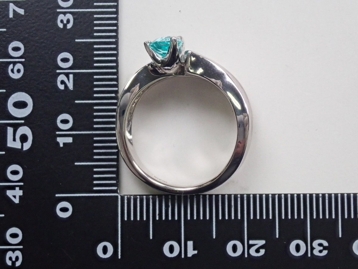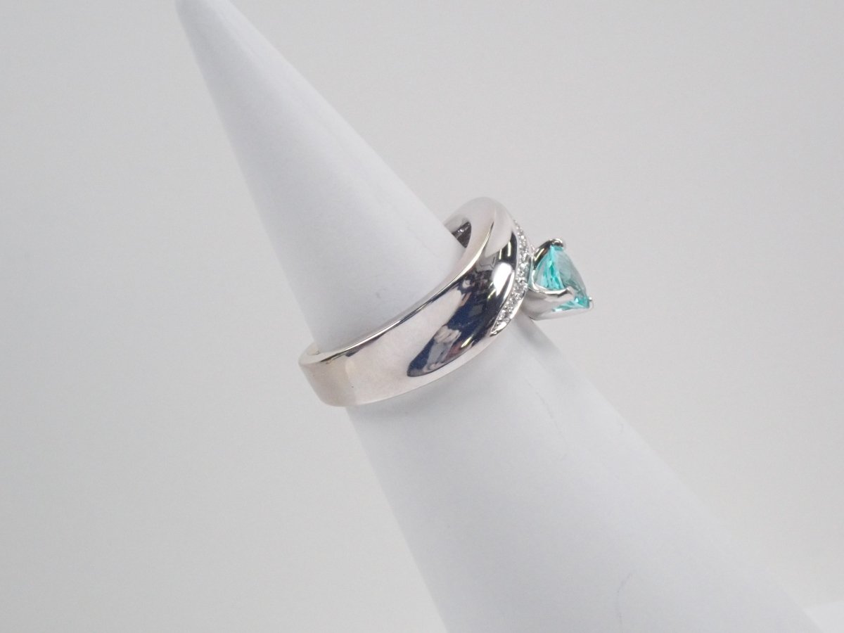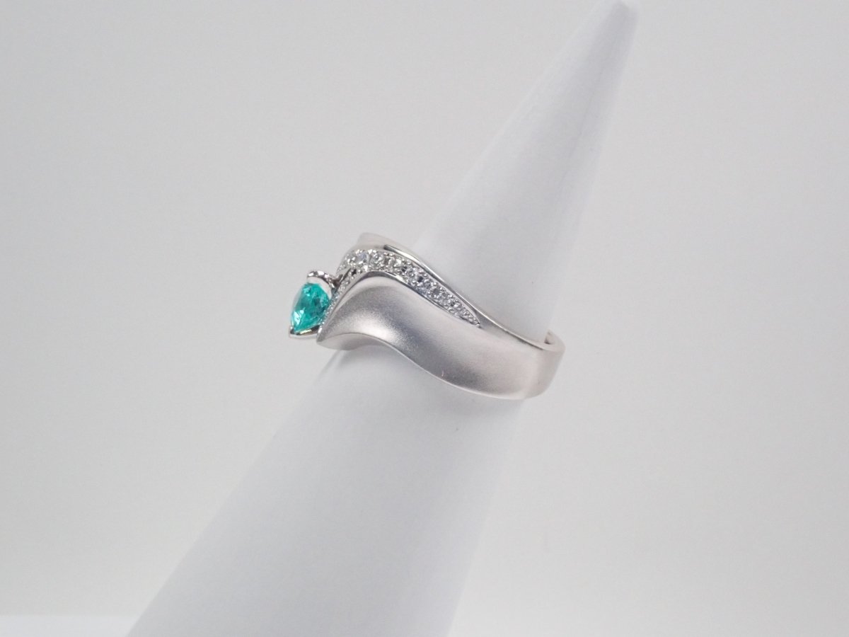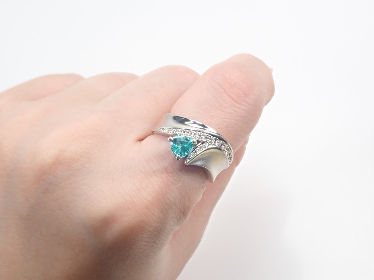帕拉伊巴碧璽顏色好,非常漂亮,比莫三比克高 0.6 克拉。梨形的帕拉伊巴碧璽具有將大地所有美麗的藍色凝聚成一顆寶石的魅力。戒指的構造給人一種深邃的感覺,很適合這顆帕拉伊巴碧璽。重量約11.9克。該鑽石為相當於VS級的無色鑽石。隨附 GIA 真品證書。 [ 多彩] 點擊此處查看產品清單。