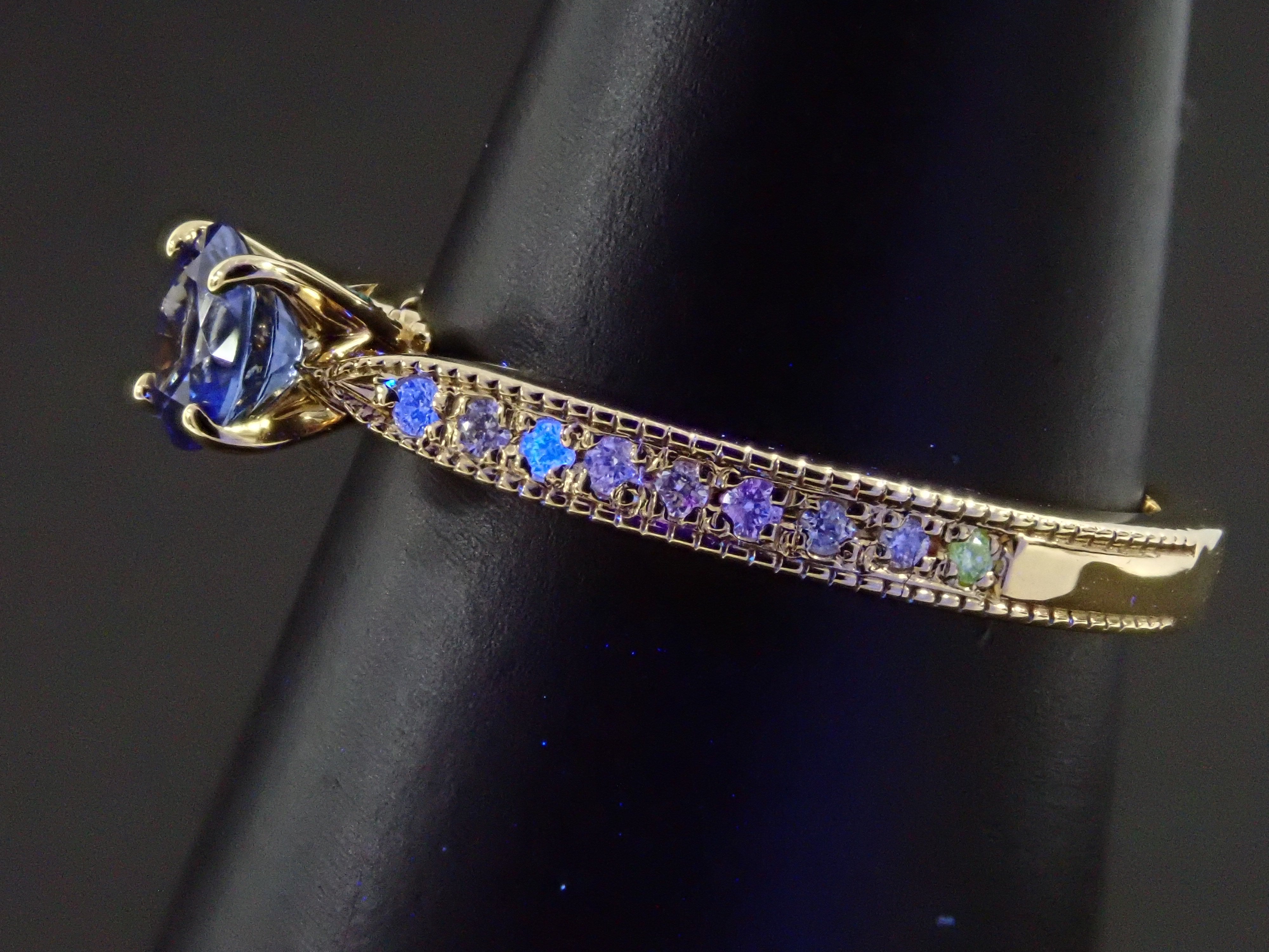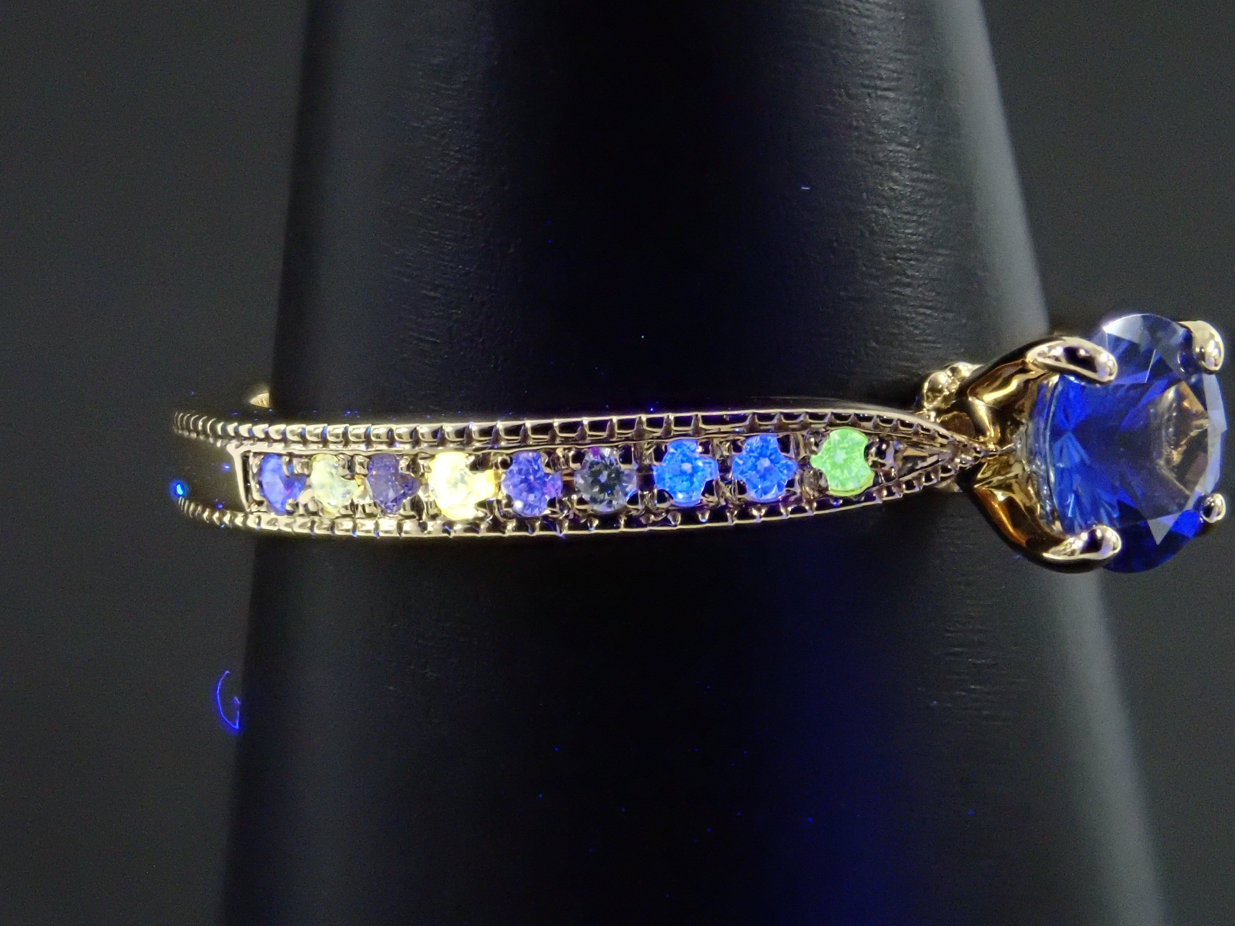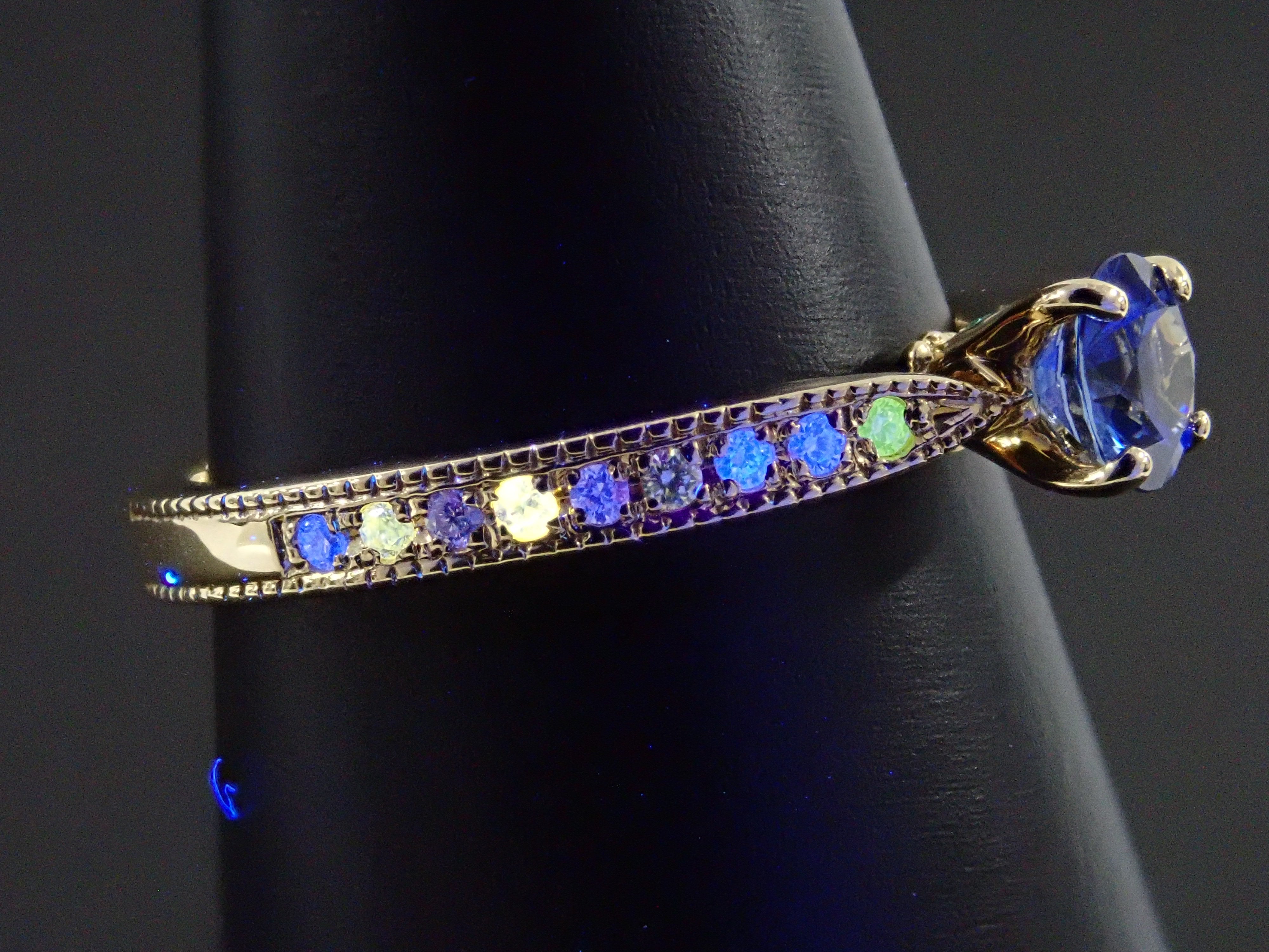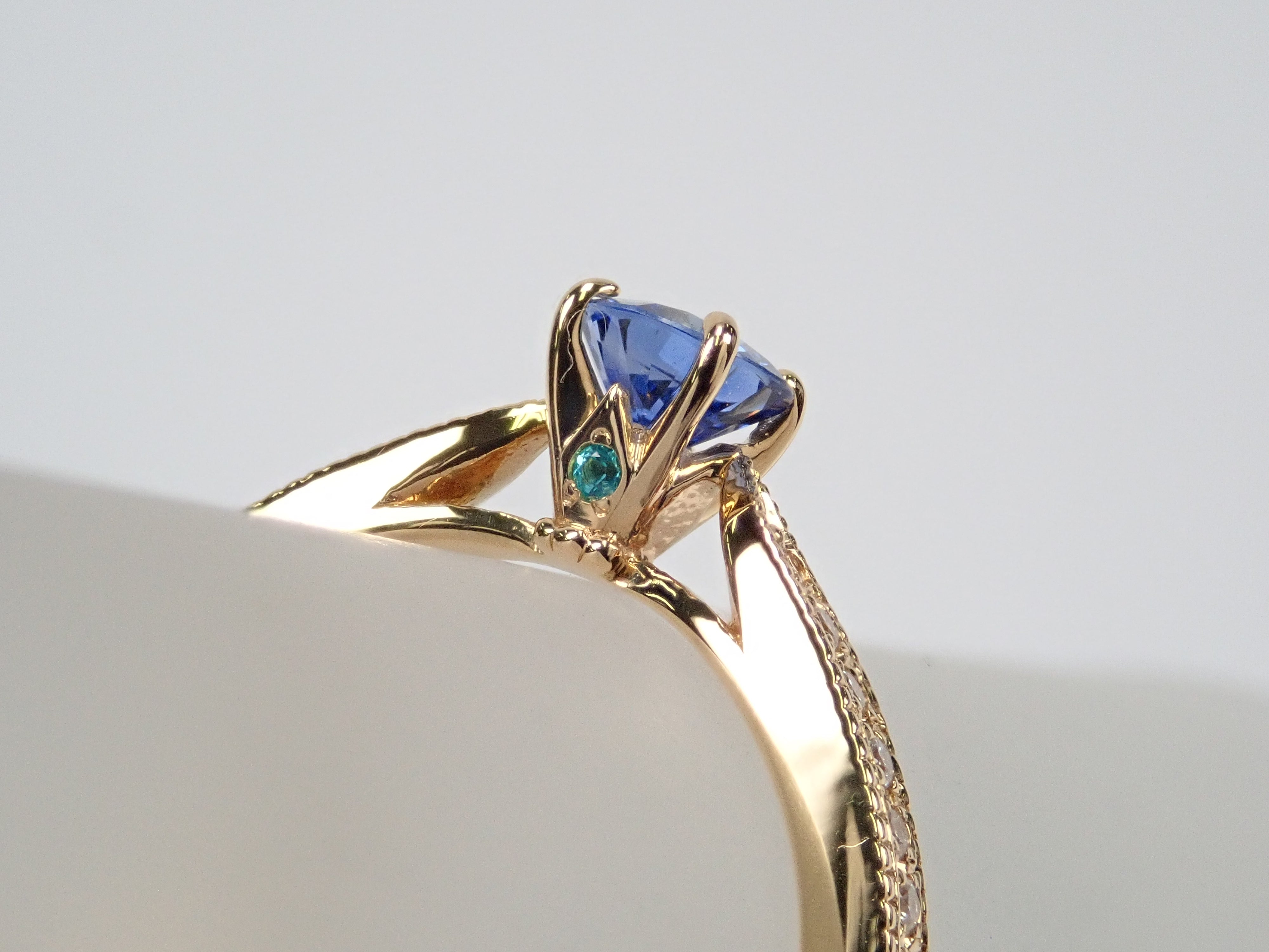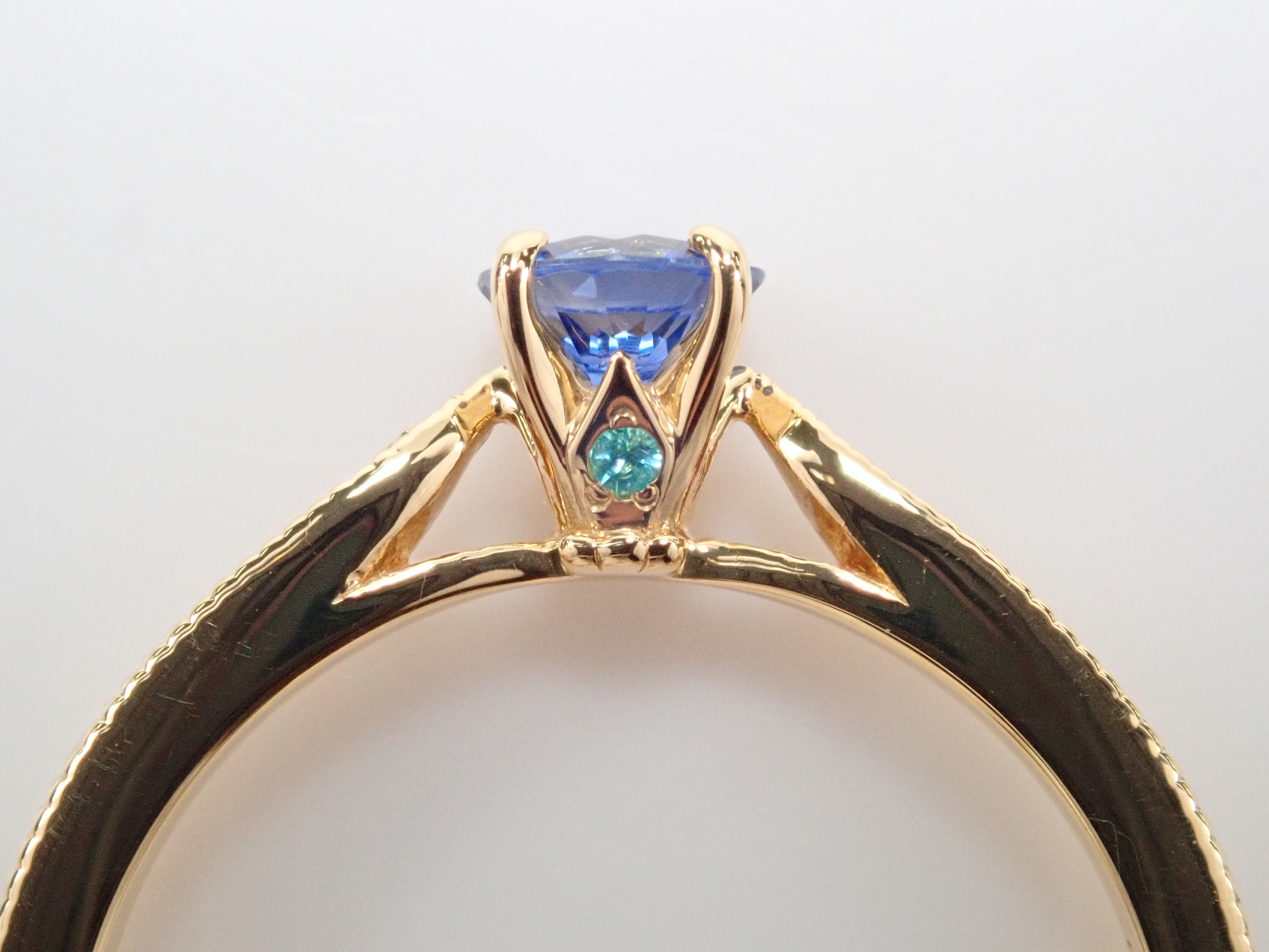 一顆美麗的藍色藍寶石,具有閃光和切割。中心鑲嵌一顆藍色藍寶石,石座上鑲嵌一顆特別璀璨的巴西帕拉伊巴碧璽(產自巴塔利亞)和一顆冰藍色鑽石(處理),賦予其華麗的光澤。副石鑲嵌無色鑽石。這枚戒指是在我們設計師 Wamu 的監督下從 Carats Loose 精心挑選的。
