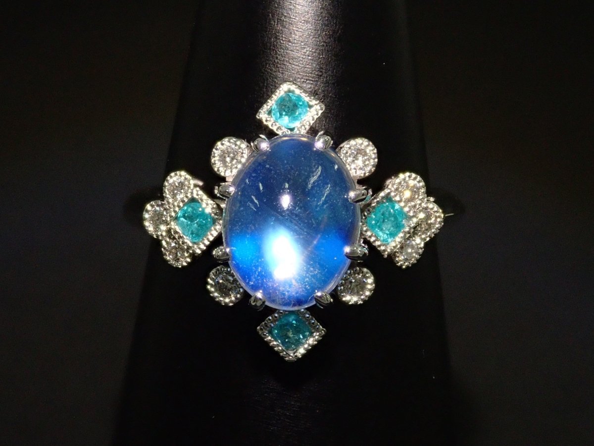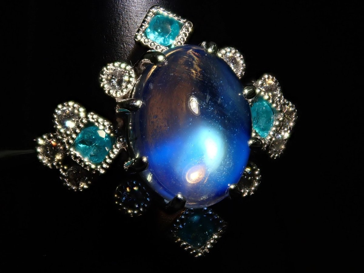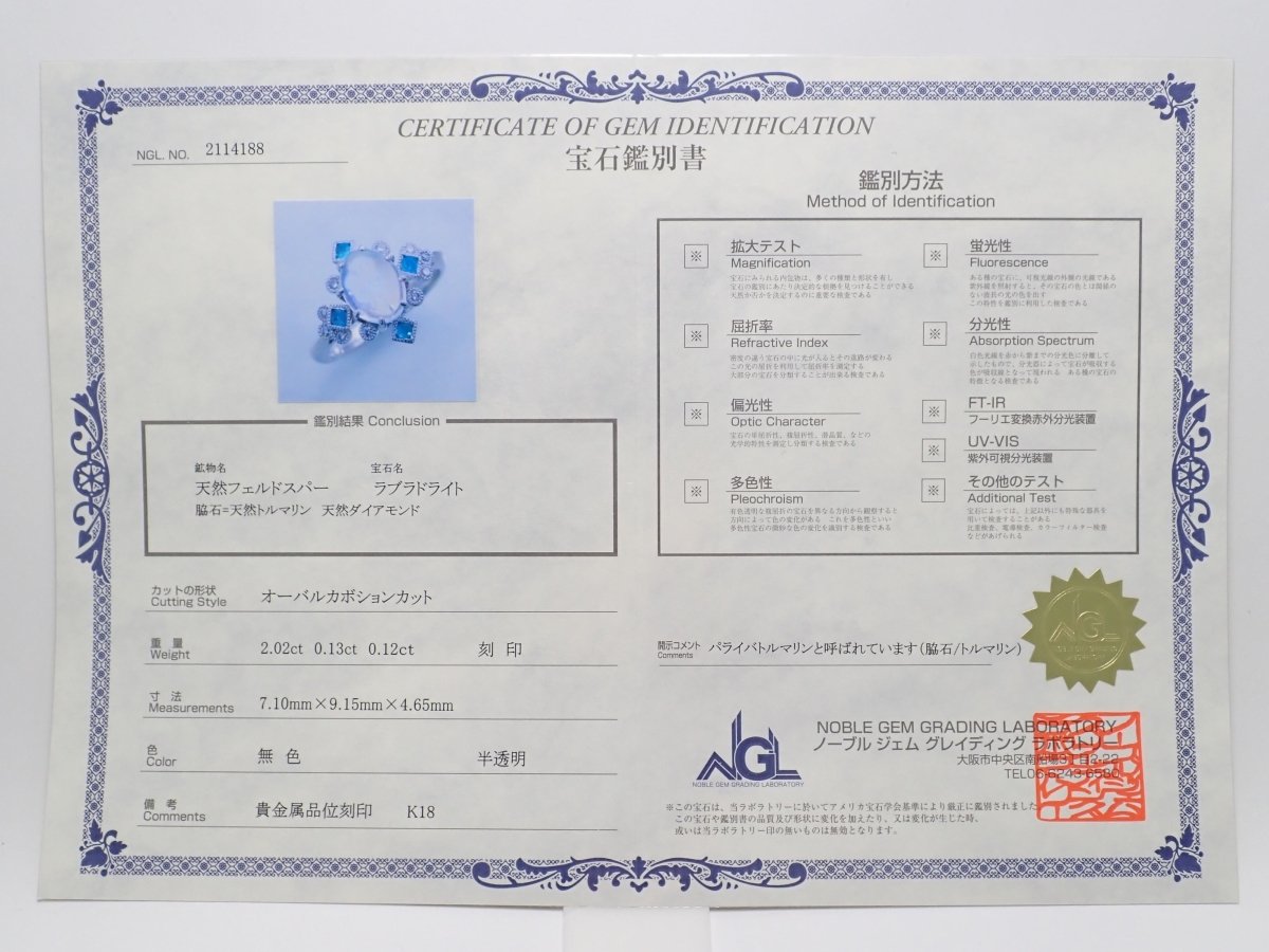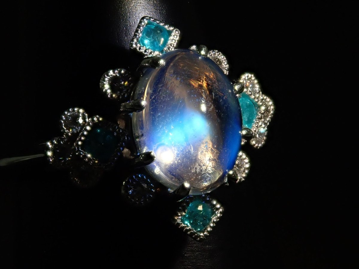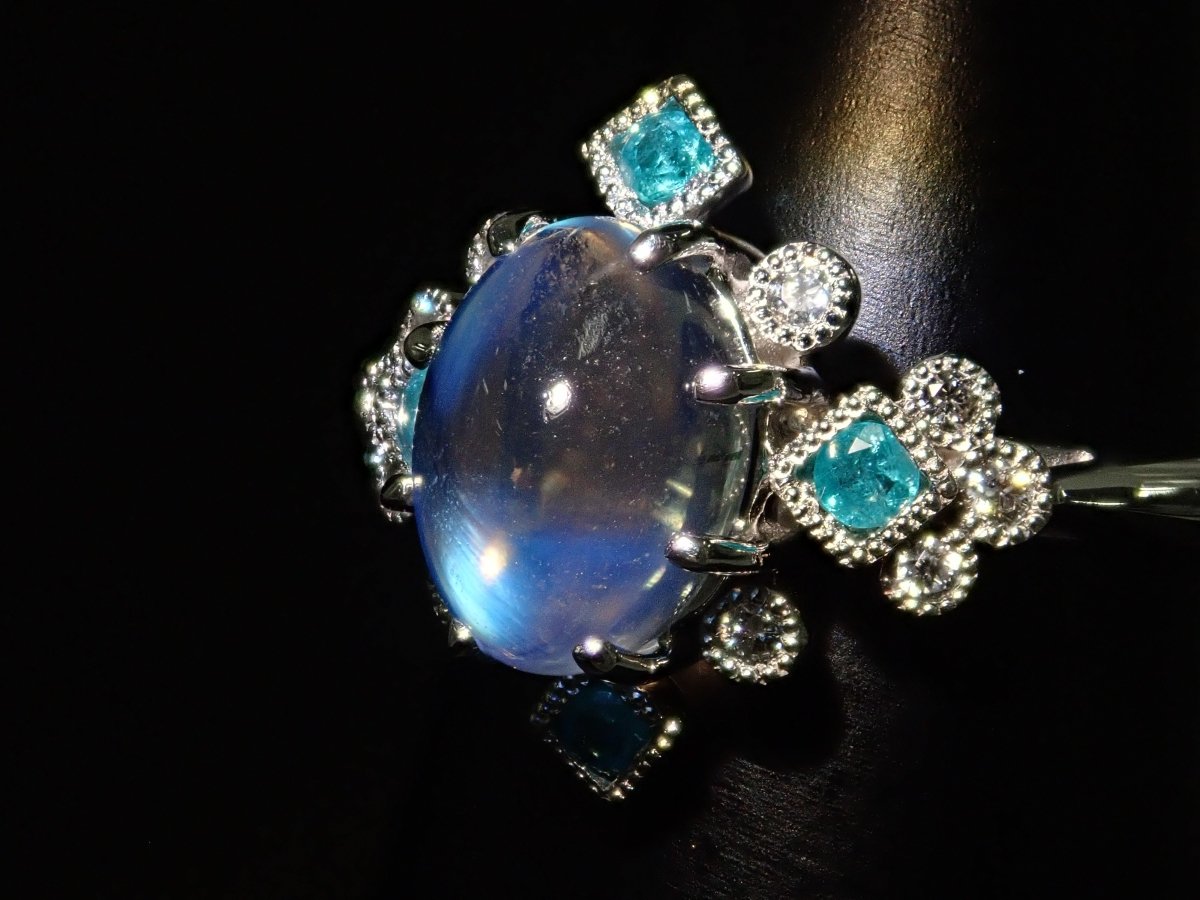 中心鑲有拉長石的華麗戒指。拉長石給席勒留下了奇妙的印象,其凸圓面切割增強了其魅力。美麗的拉長石由巴西帕拉伊巴碧璽和鑽石呈現鮮豔的色彩。中間的石頭周圍的圖案非常精緻,是很難看到的奇妙圖案。重量約5.8公克。該鑽石為相當於VS級的無色鑽石。 [ 多彩] 點擊此處查看產品清單。
