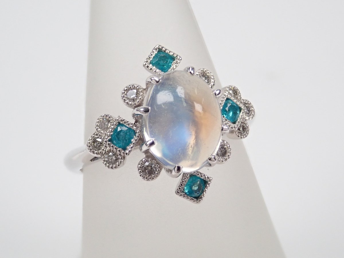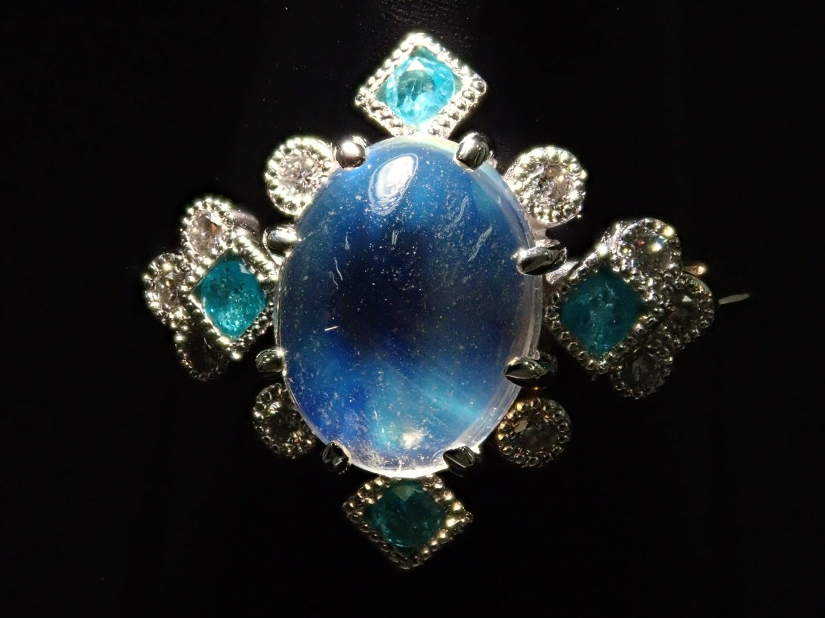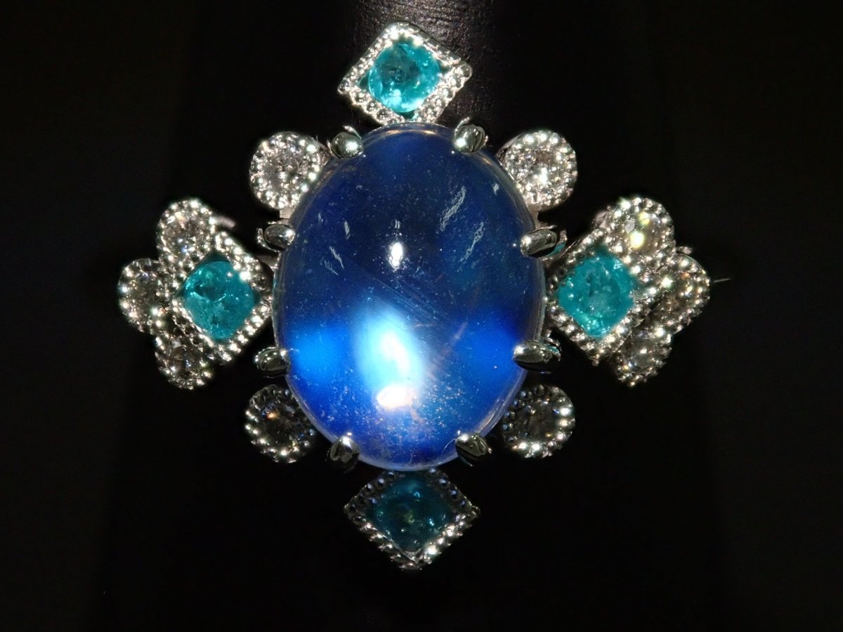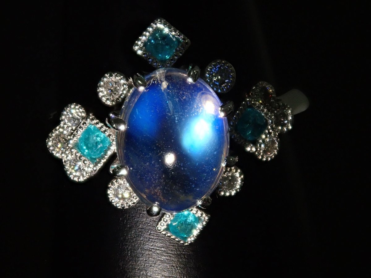 中心鑲有拉長石的華麗戒指。拉長石給席勒留下了奇妙的印象,其凸圓面切割增強了其魅力。美麗的拉長石由巴西帕拉伊巴碧璽和鑽石呈現鮮豔的色彩。中間的石頭周圍的圖案非常精緻,是很難看到的奇妙圖案。重量約5.8公克。該鑽石為相當於VS級的無色鑽石。 [ 多彩] 點擊此處查看產品清單。