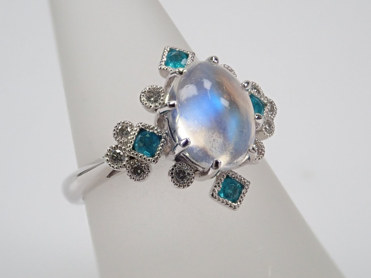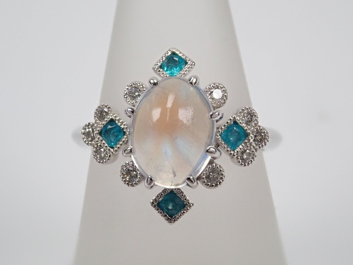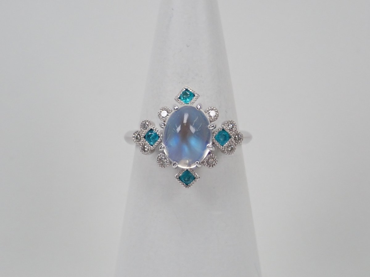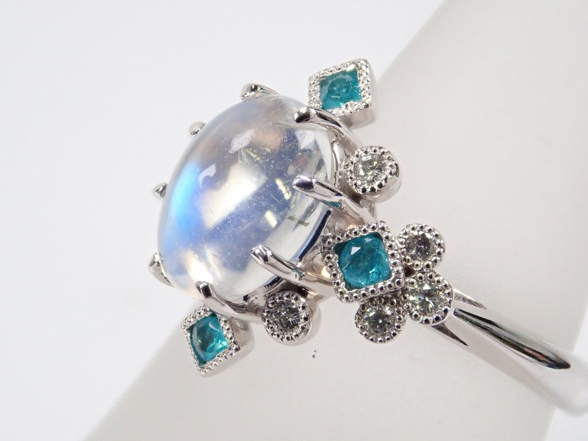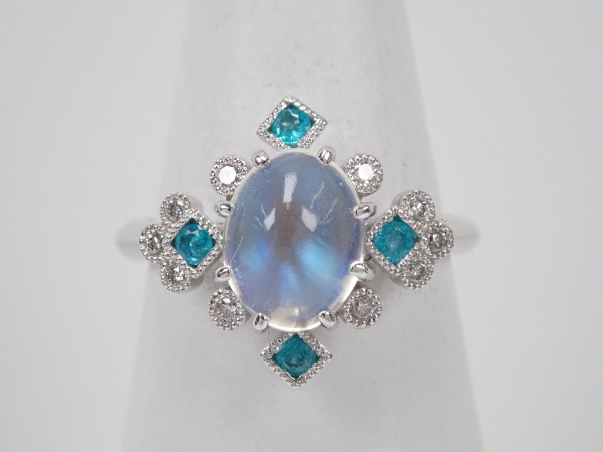 中心鑲有拉長石的華麗戒指。拉長石給席勒留下了奇妙的印象,其凸圓面切割增強了其魅力。美麗的拉長石由巴西帕拉伊巴碧璽和鑽石呈現鮮豔的色彩。中間的石頭周圍的圖案非常精緻,是很難看到的奇妙圖案。重量約5.8公克。該鑽石為相當於VS級的無色鑽石。 [ 多彩] 點擊此處查看產品清單。