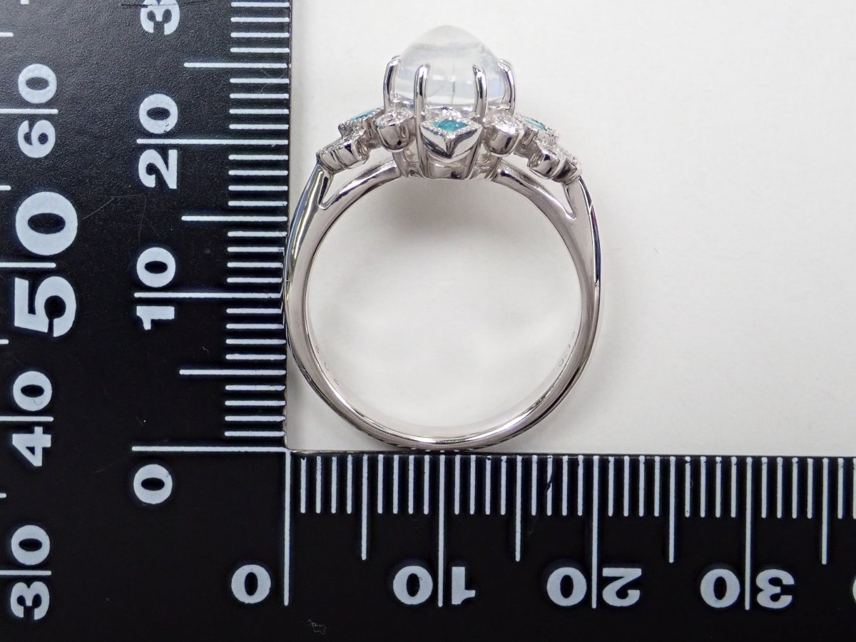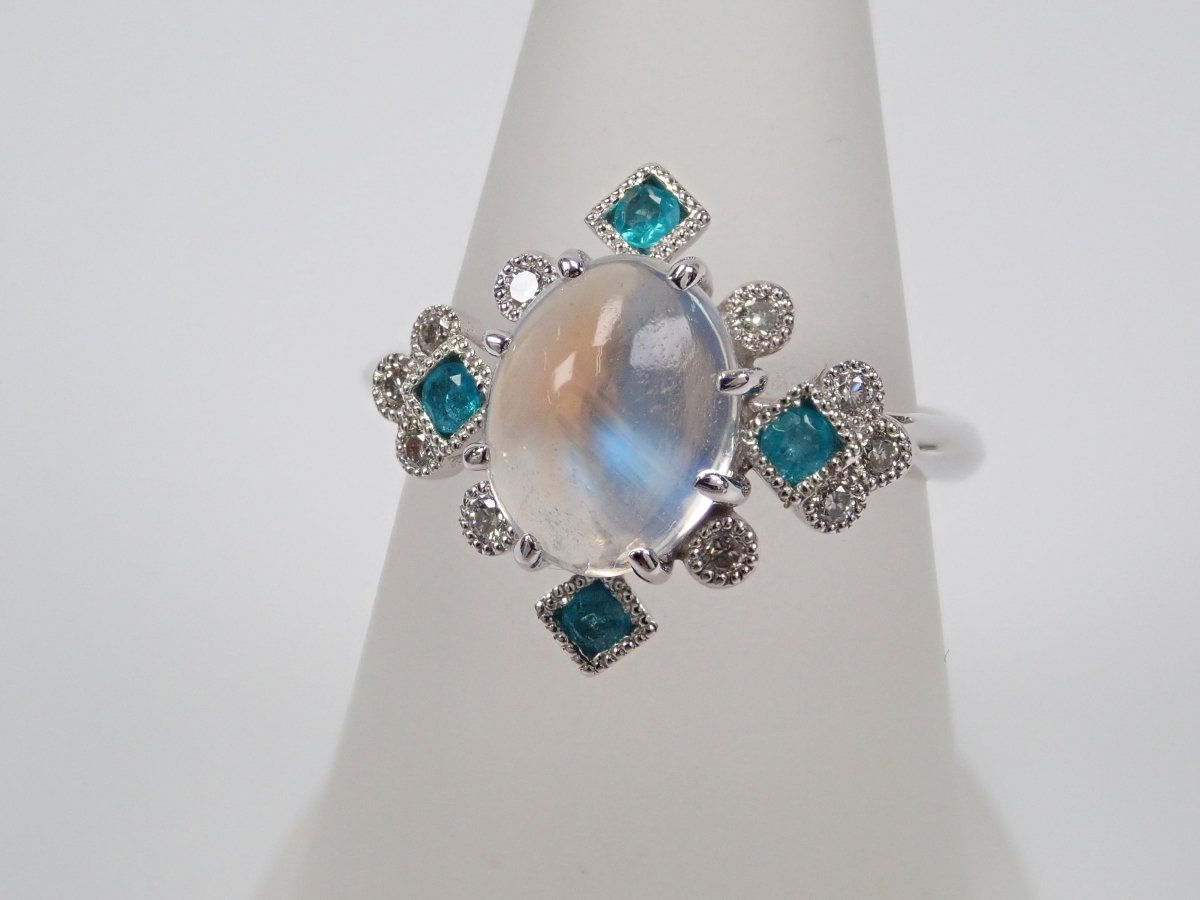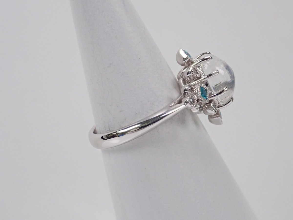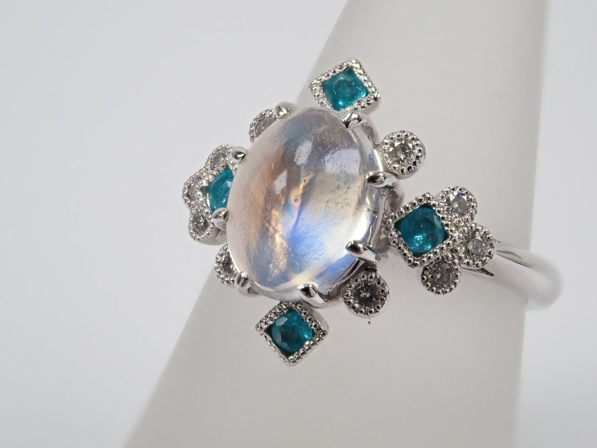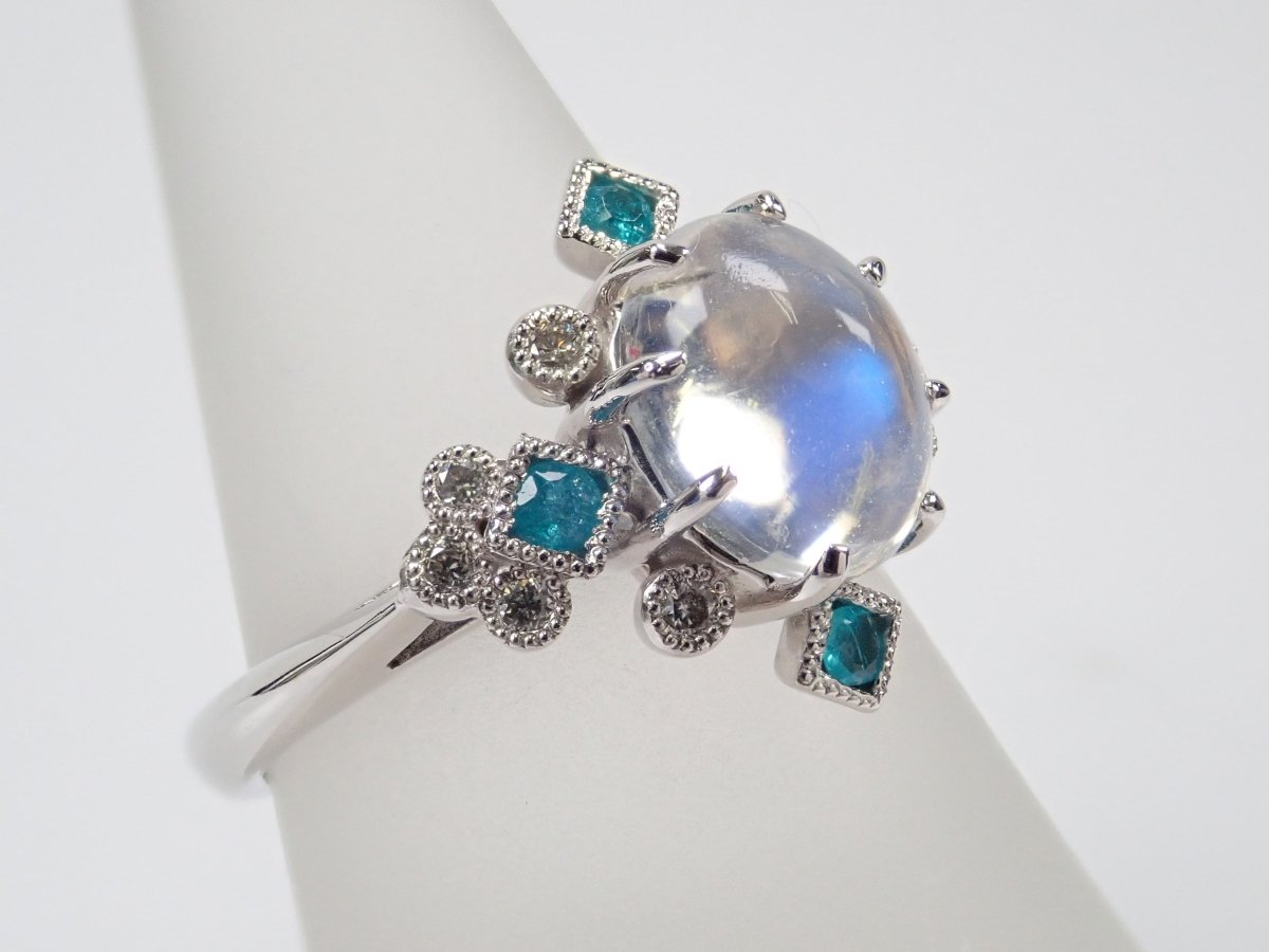 中心鑲有拉長石的華麗戒指。拉長石給席勒留下了奇妙的印象,其凸圓面切割增強了其魅力。美麗的拉長石由巴西帕拉伊巴碧璽和鑽石呈現鮮豔的色彩。中間的石頭周圍的圖案非常精緻,是很難看到的奇妙圖案。重量約5.8公克。該鑽石為相當於VS級的無色鑽石。 [ 多彩] 點擊此處查看產品清單。