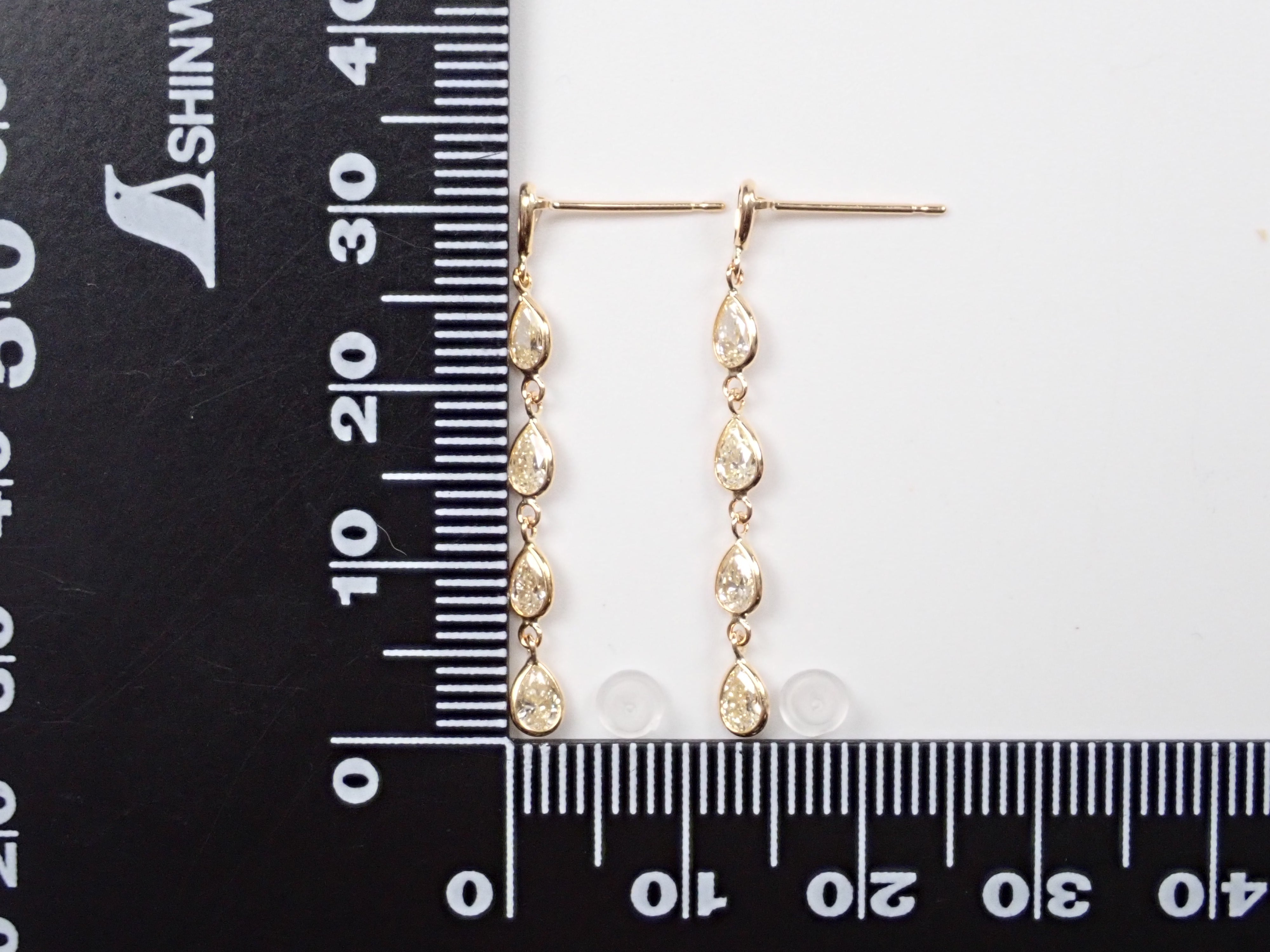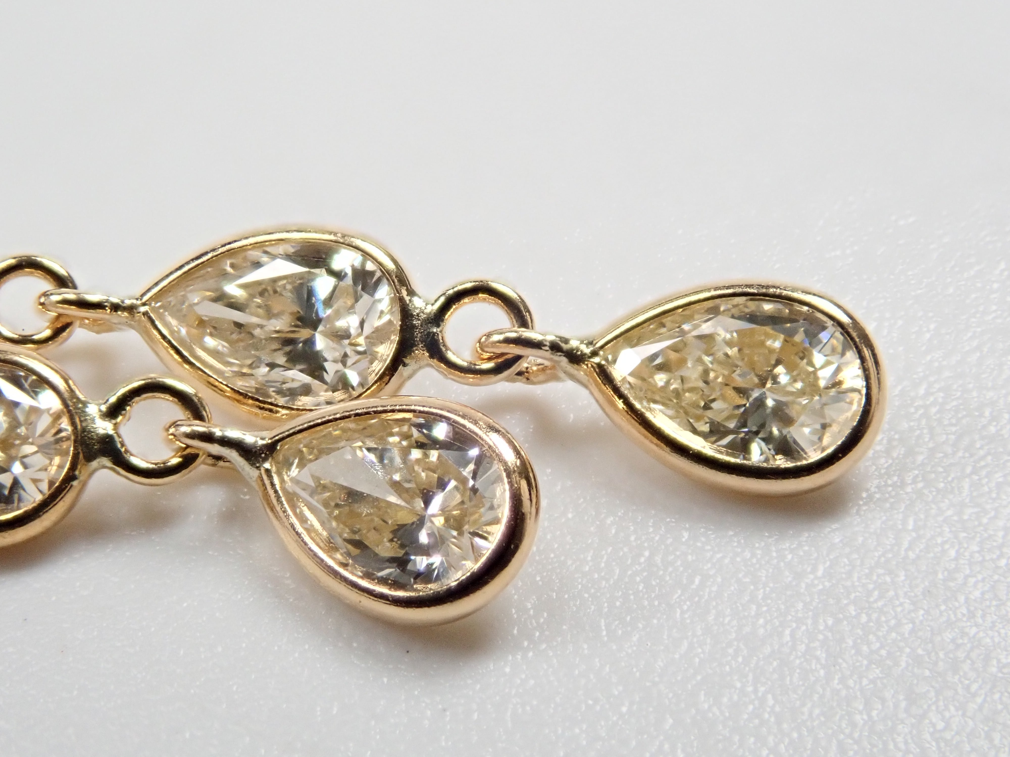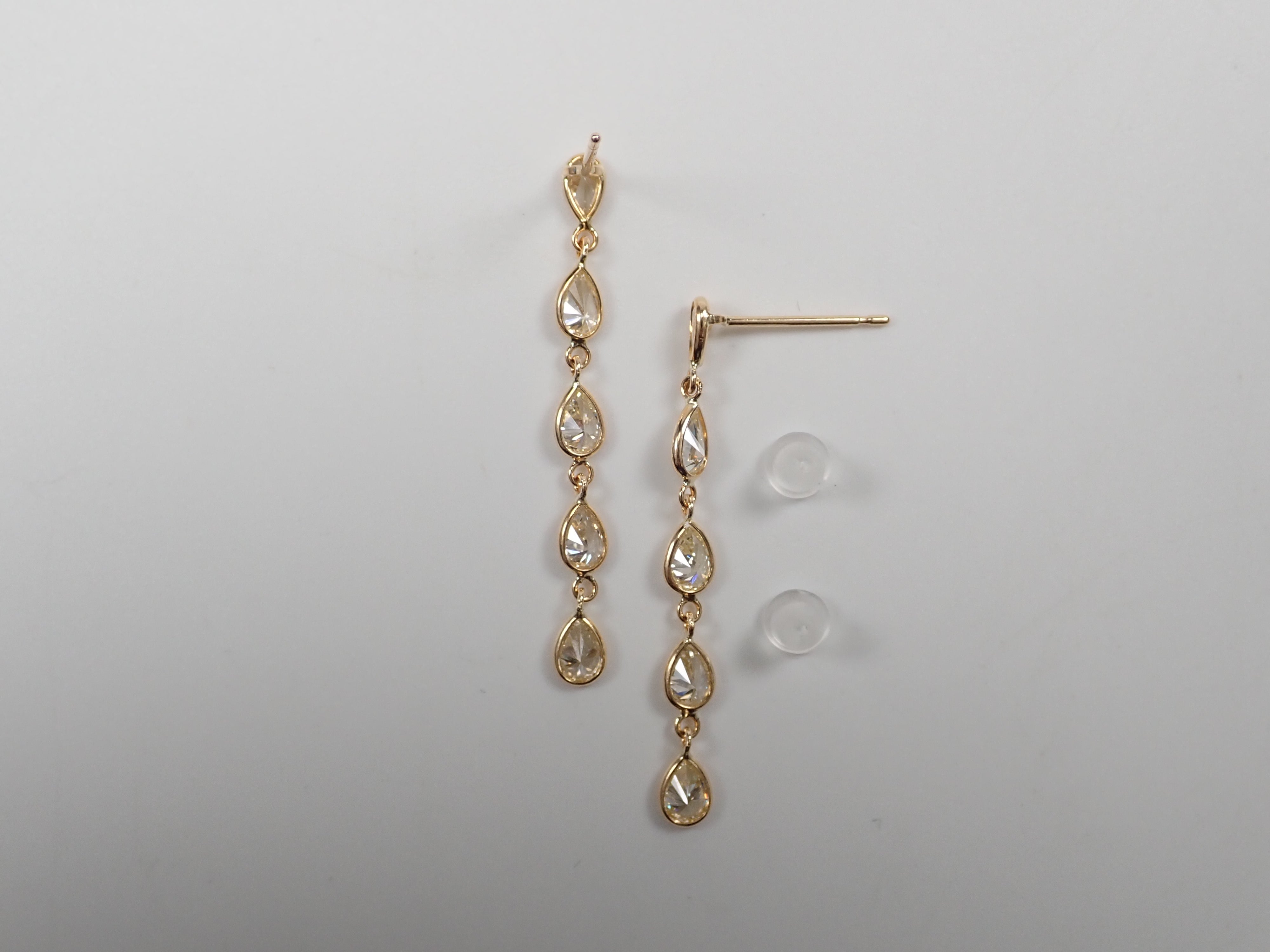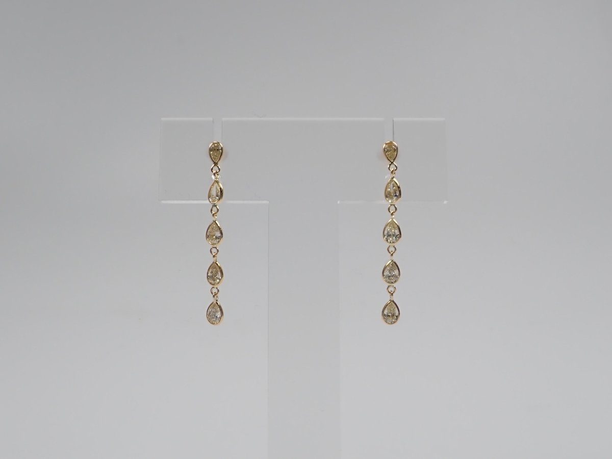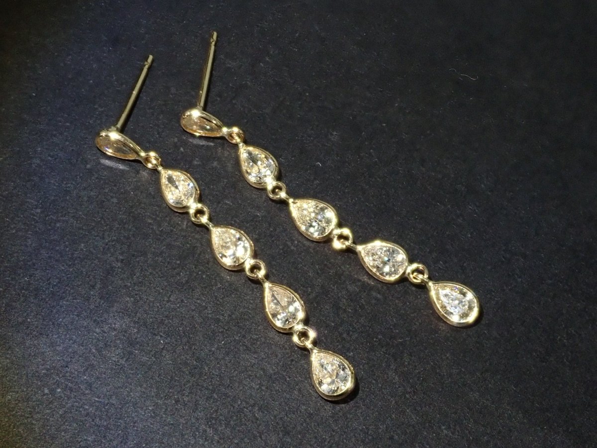 這些耳環具有非常令人印象深刻的鑽石光芒,每次搖擺時都會閃閃發光。每顆鑽石的尺寸約為 0.1 克拉,因此它是一件充滿短暫魅力的珠寶,就像一個連接在一起的美麗光球。基底金屬為黃金,因此具有異國風情。重量約0.8公克。該鑽石為相當於VS級的黃鑽。 [ 多彩] 點擊此處查看產品清單。