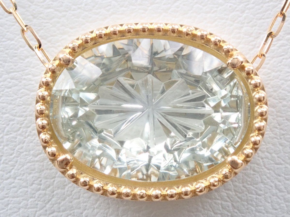 這款吊墜採用大型綠色石英切割和甲州寶石切割。透明清爽的綠色,多面切割增添光澤,底座為兩層,可讓光線進入,使其更加閃亮。為了給大頂部帶來穩定感,我們反覆進行小調整以確定鏈條穿過的位置,並使用 CAD 精心設計。鋸狀的珠子很大,很有存在感,鏈條是閃閃發光的,每條項鍊的製作都非常注重細節。這是我在Twitter上介紹的一個吊墜。