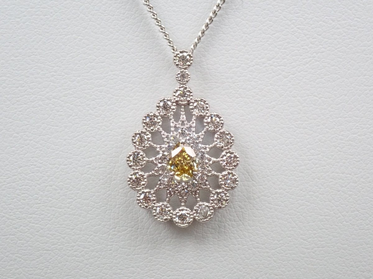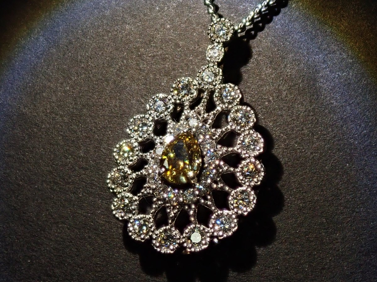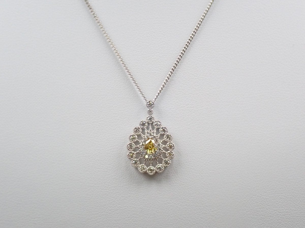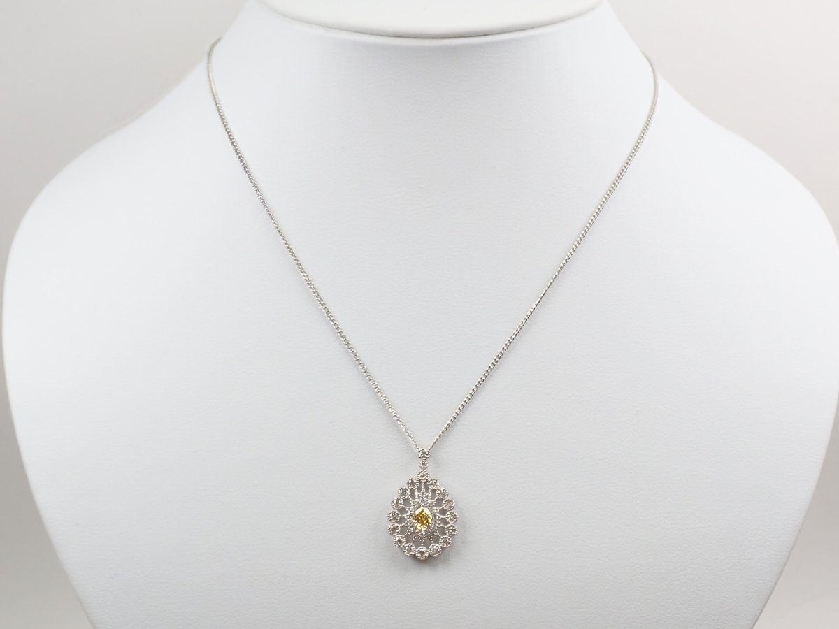 這款項鍊頂部鑲滿了鑽石,其中一顆 0.312 克拉的黃鑽即使從遠處看也呈現出明顯的黃色,周圍環繞著 0.51 克拉的奢華副石。閃閃發光的鑽石採用華麗的設計,就像透過萬花筒觀看一樣。一件精美的珠寶,在您的胸前彰顯個性。
